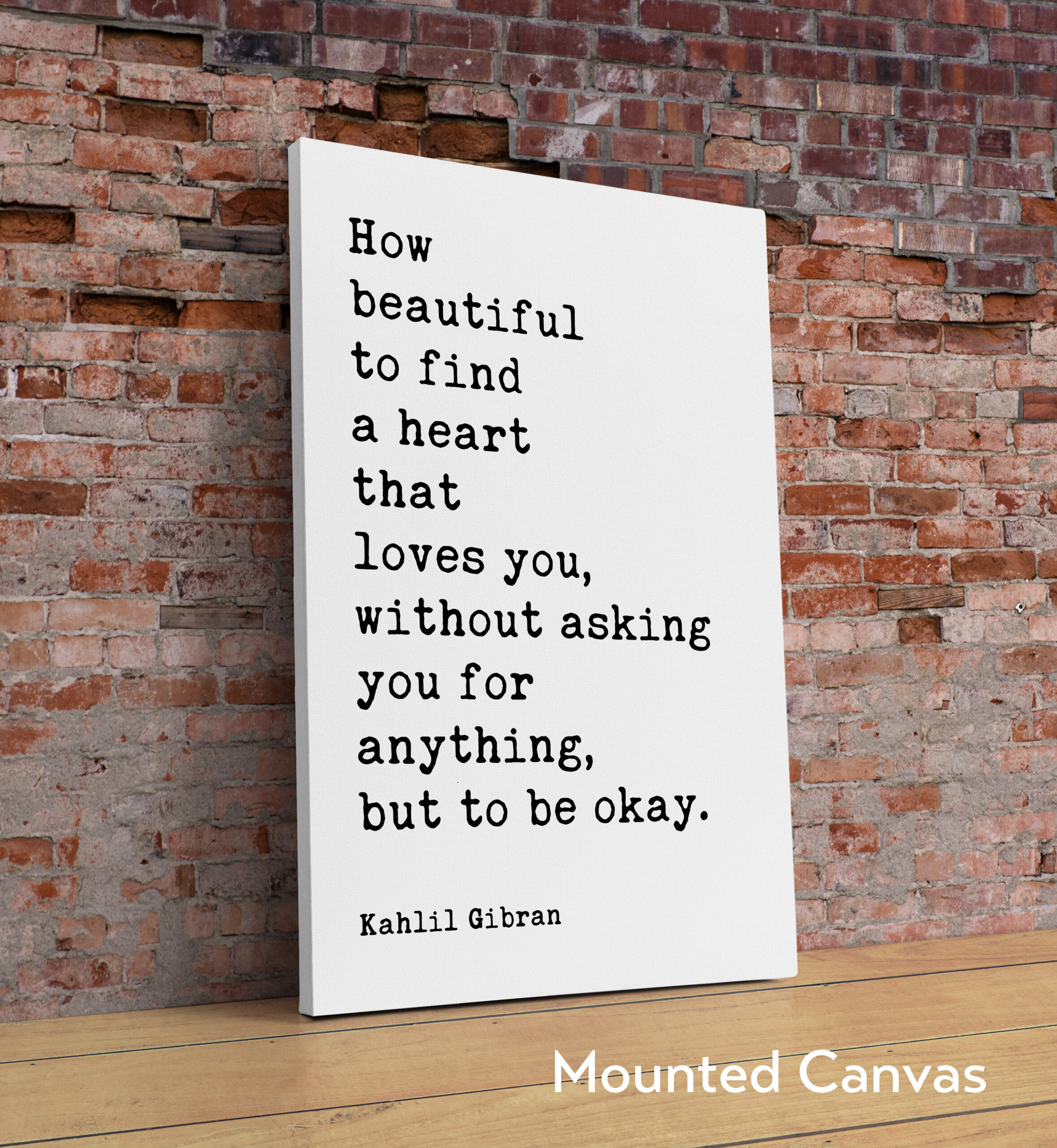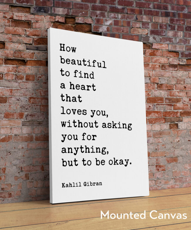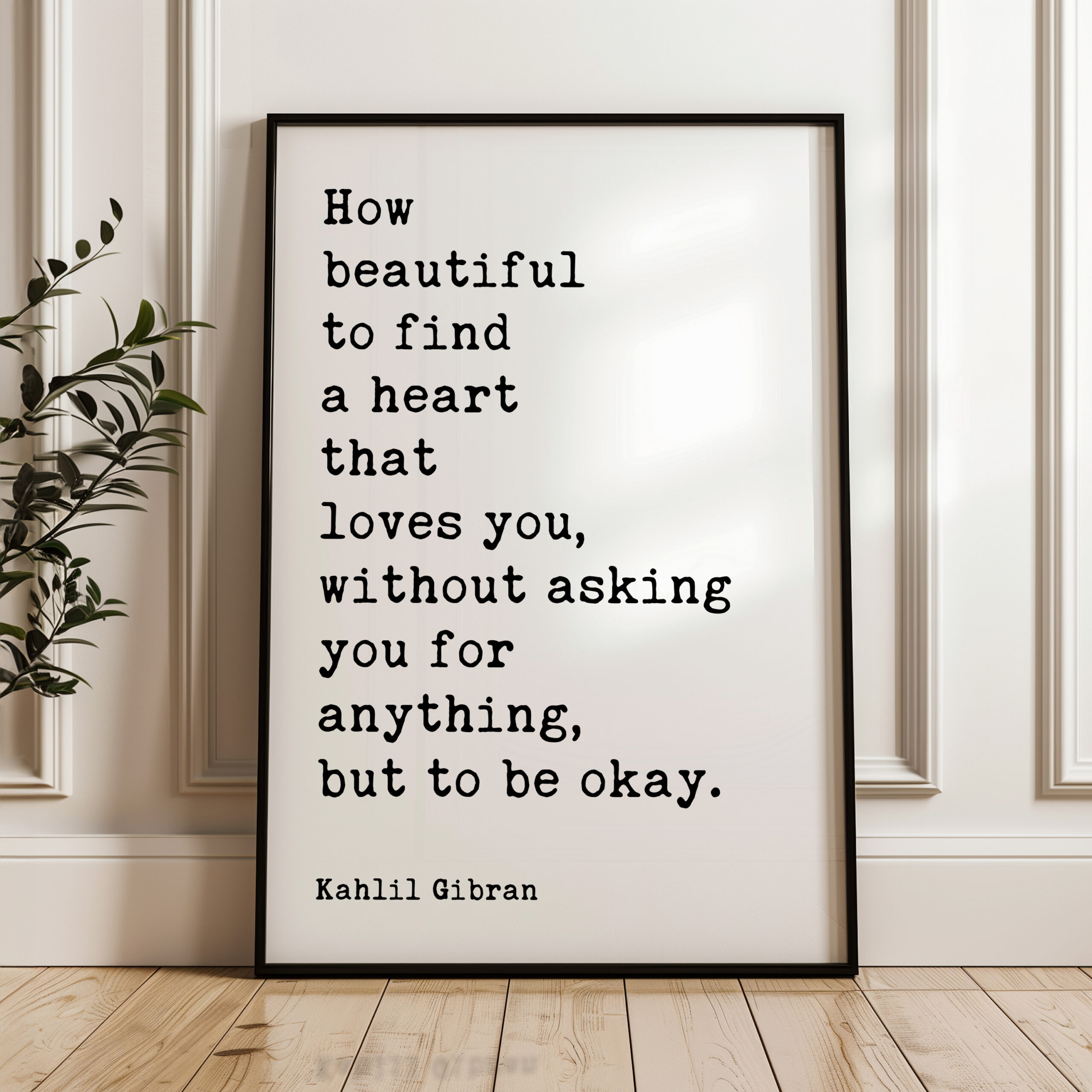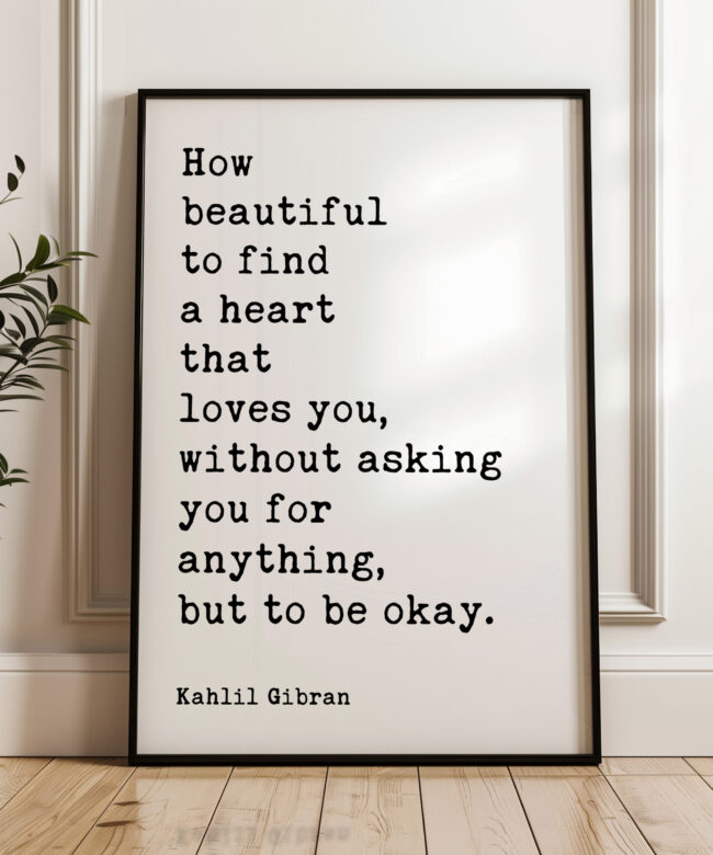 This Typography Art Print beautifully captures the heartfelt quote by Kahlil Gibran: “How beautiful to find a heart that loves you, without asking you for anything, but to be okay.” A perfect tribute to the simplicity and purity of unconditional love, this art print adds warmth and meaning to any space. With elegant typography on premium archival paper, it’s an ideal gift for a loved one or a serene piece to display in your home. Celebrate the beauty of love with this inspiring print that will serve as a gentle reminder of care and connection every day.