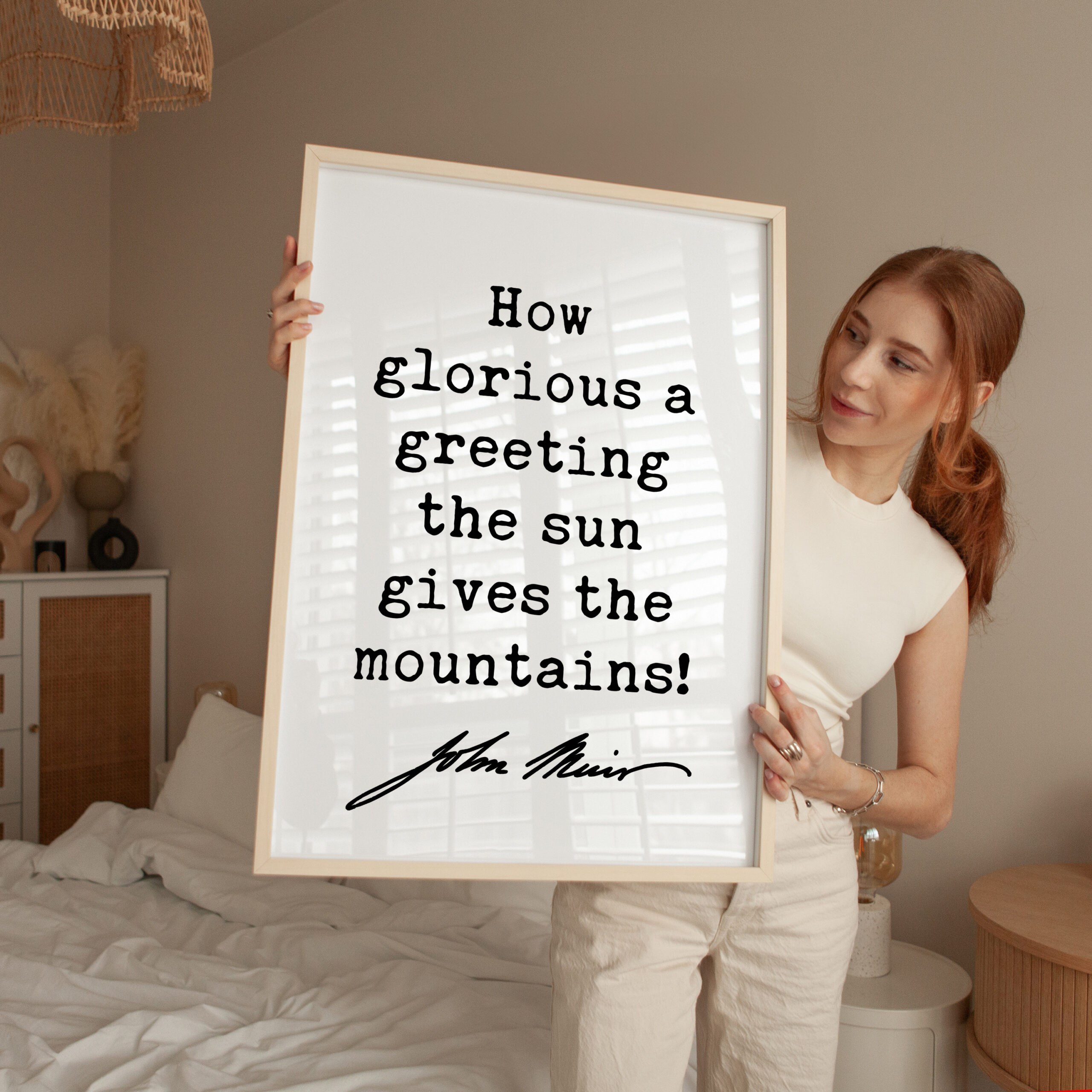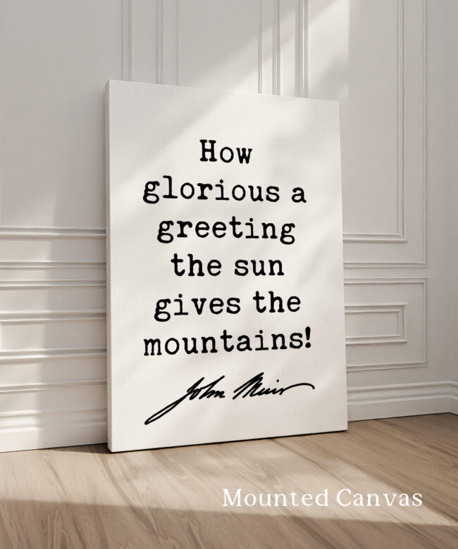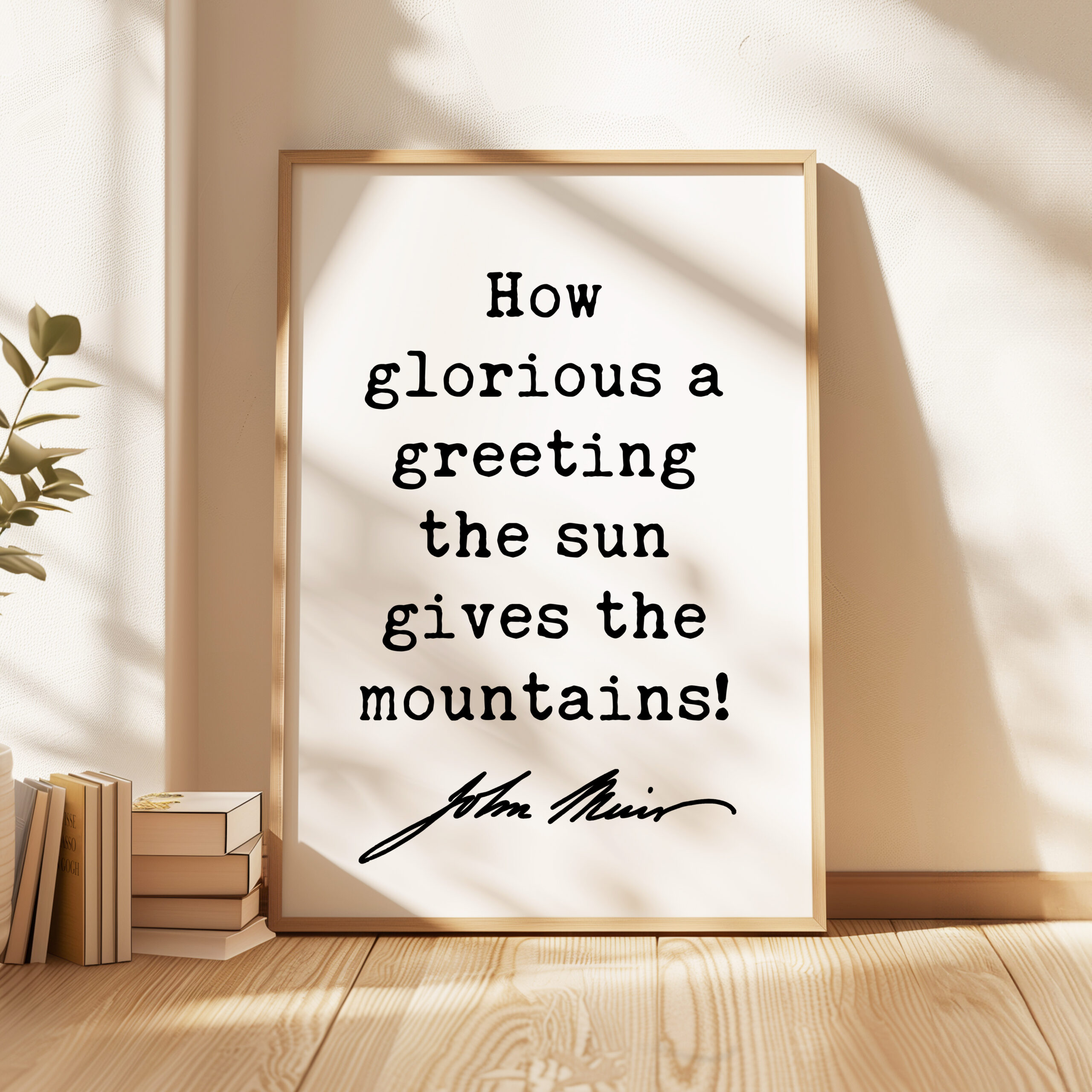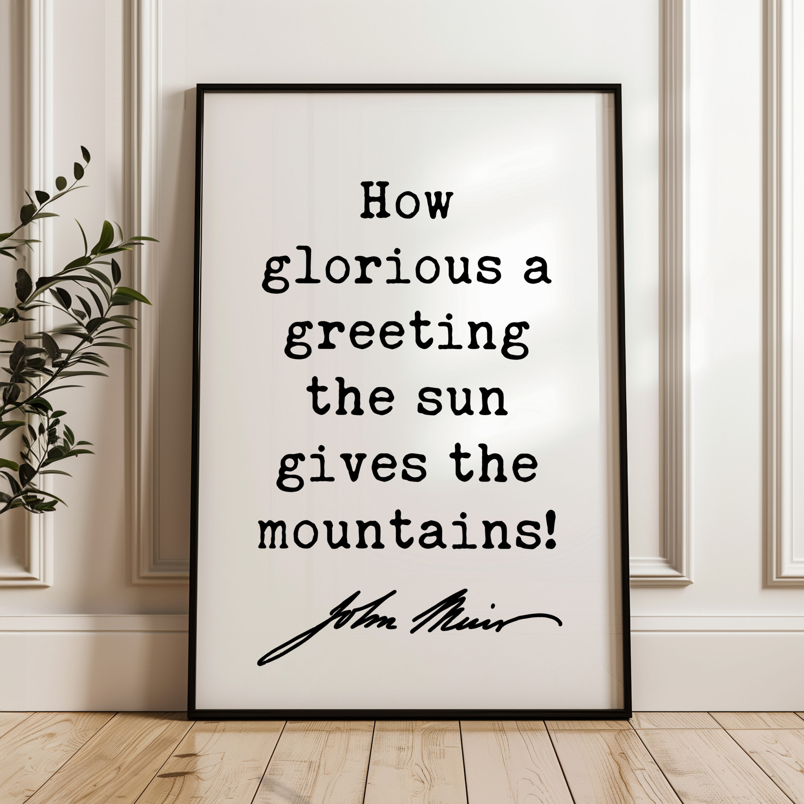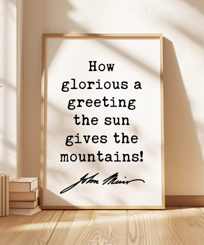 Bring the inspirational words of John Muir into your home with this elegant typography art print. Featuring the quote “How glorious a greeting the sun gives the mountains!”, this piece captures the breathtaking beauty of nature’s daily spectacle. This art print adds a touch of natural wonder and thoughtful sentiment to any space. It makes a great gift for nature lovers, hikers, dreamers, and anyone who appreciates the simple yet profound beauty of the world around us.