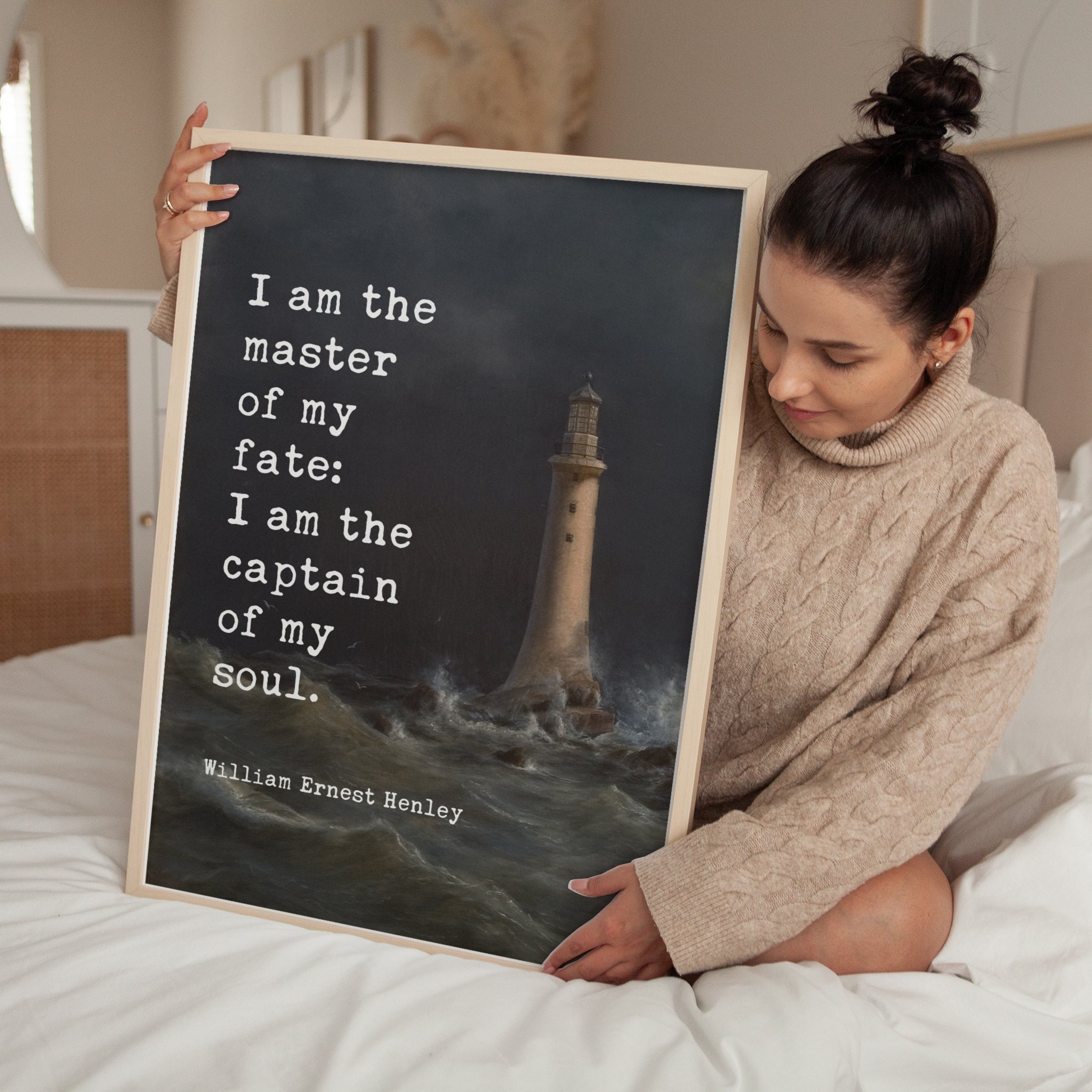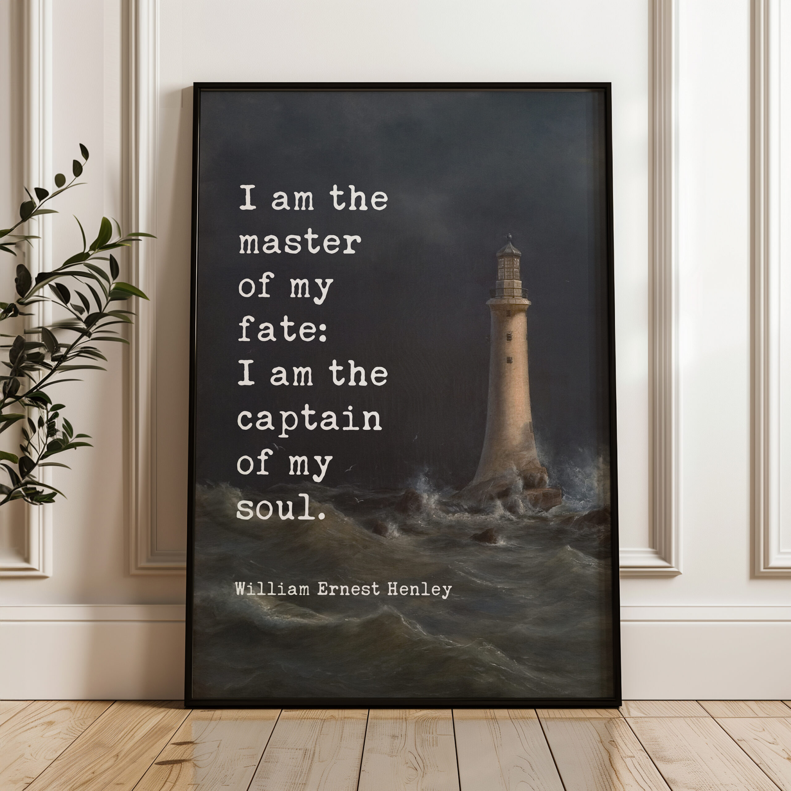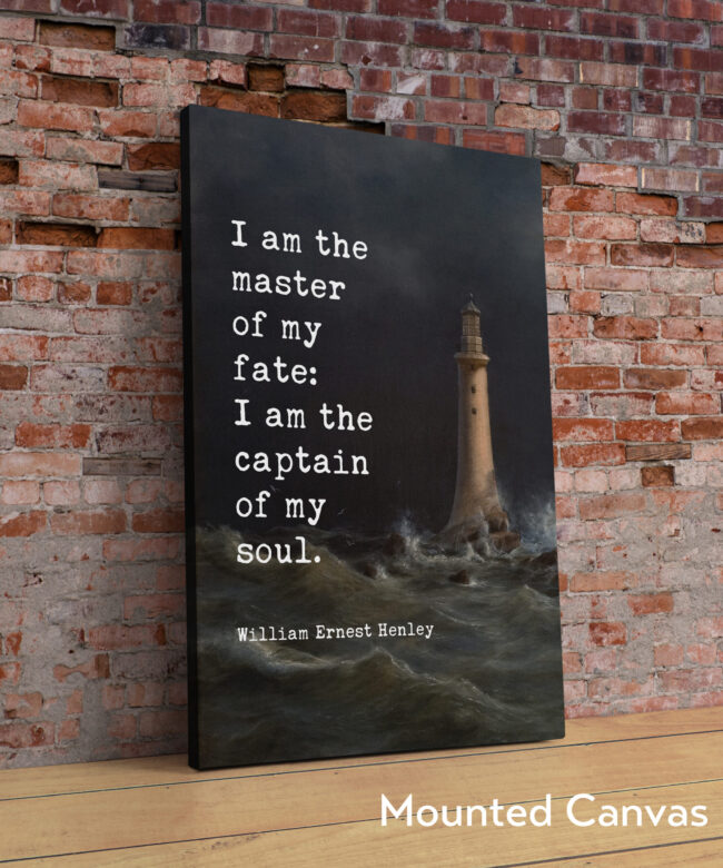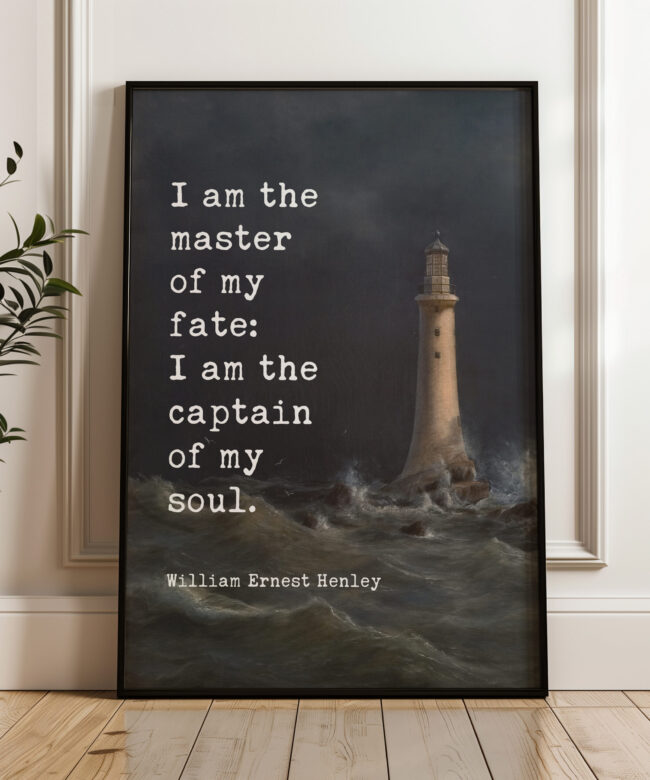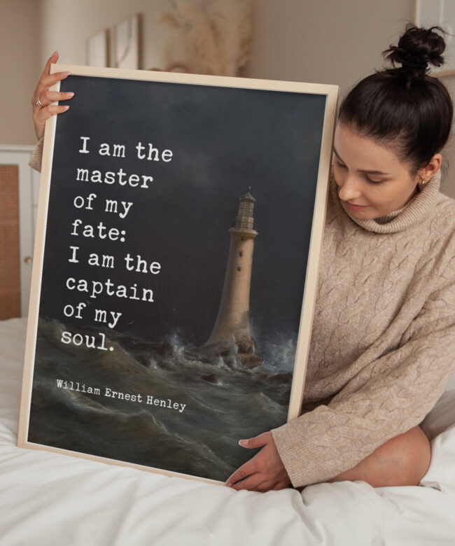 The empowering quote “I am the master of my fate: I am the captain of my soul” is displayed in a bold typewriter font, echoing the resolute spirit of a captain at the helm. Juxtaposed against the backdrop of Anton Melbye’s dramatic lighthouse painting, the artwork creates a powerful visual representation of Henley’s words.