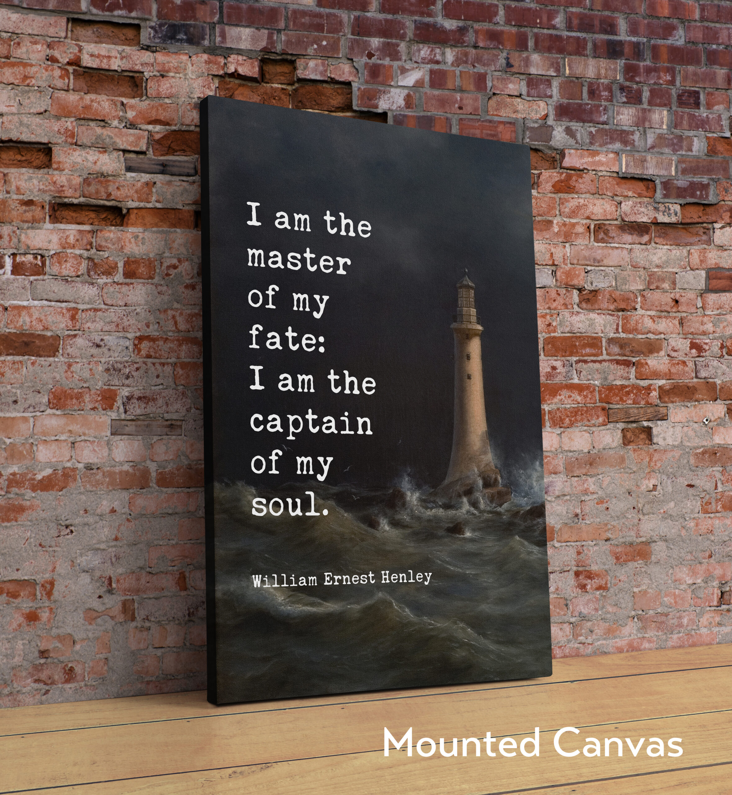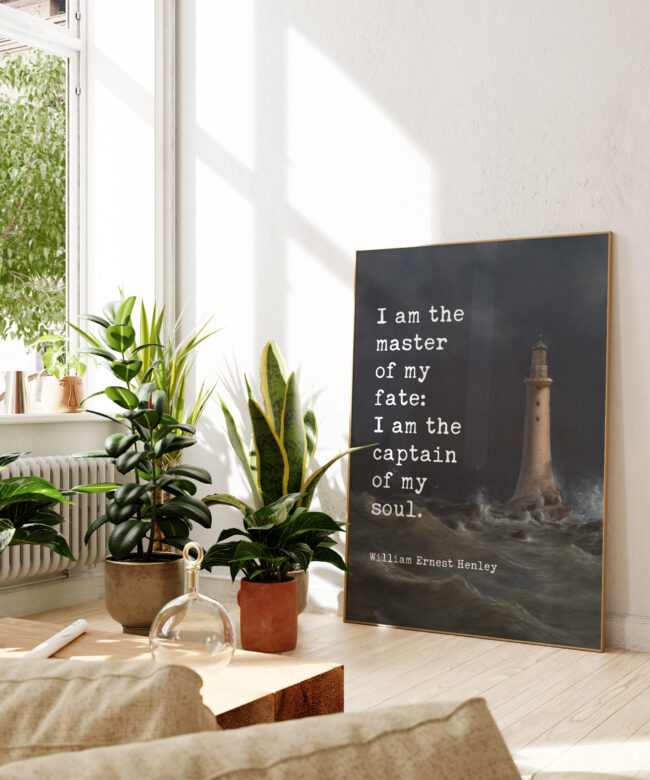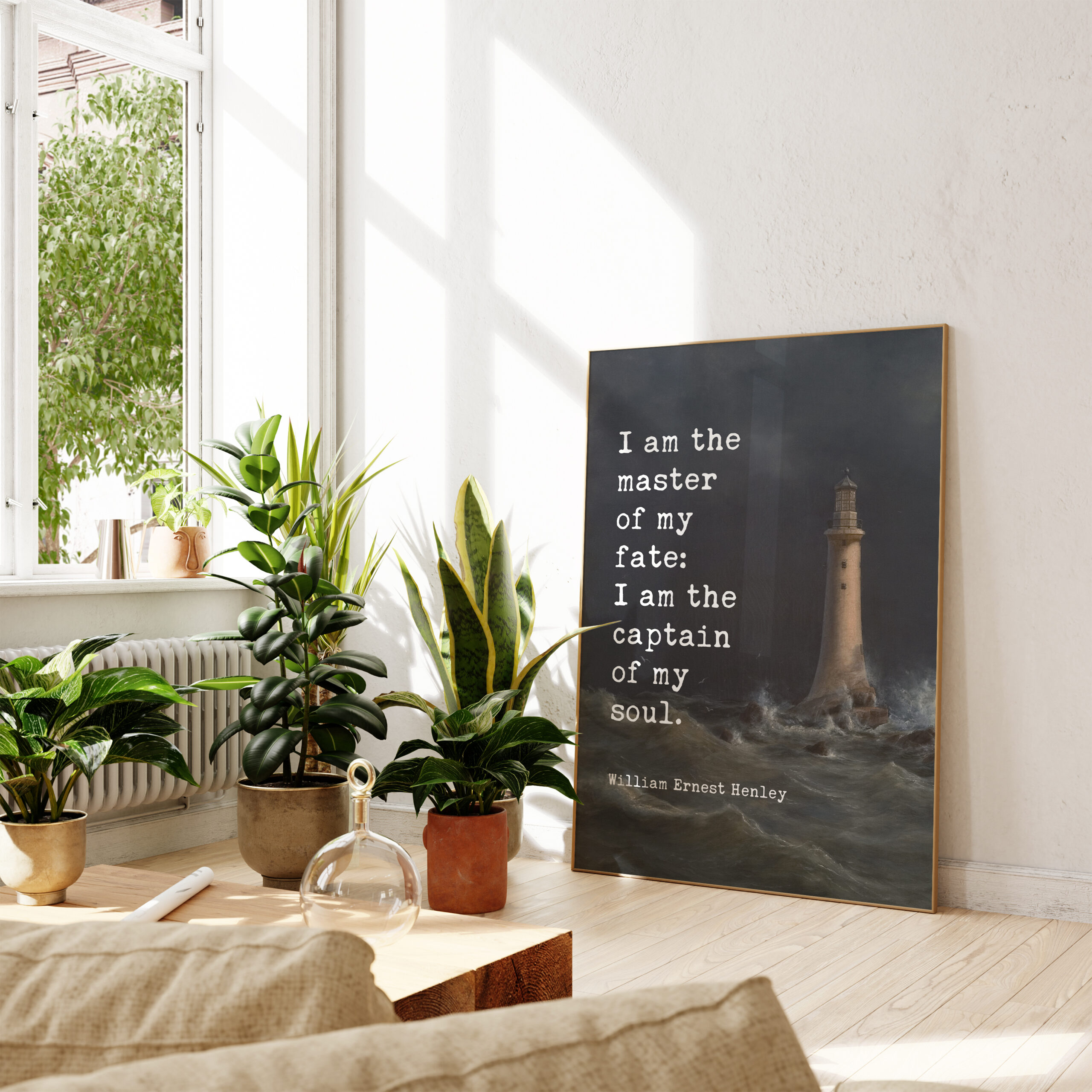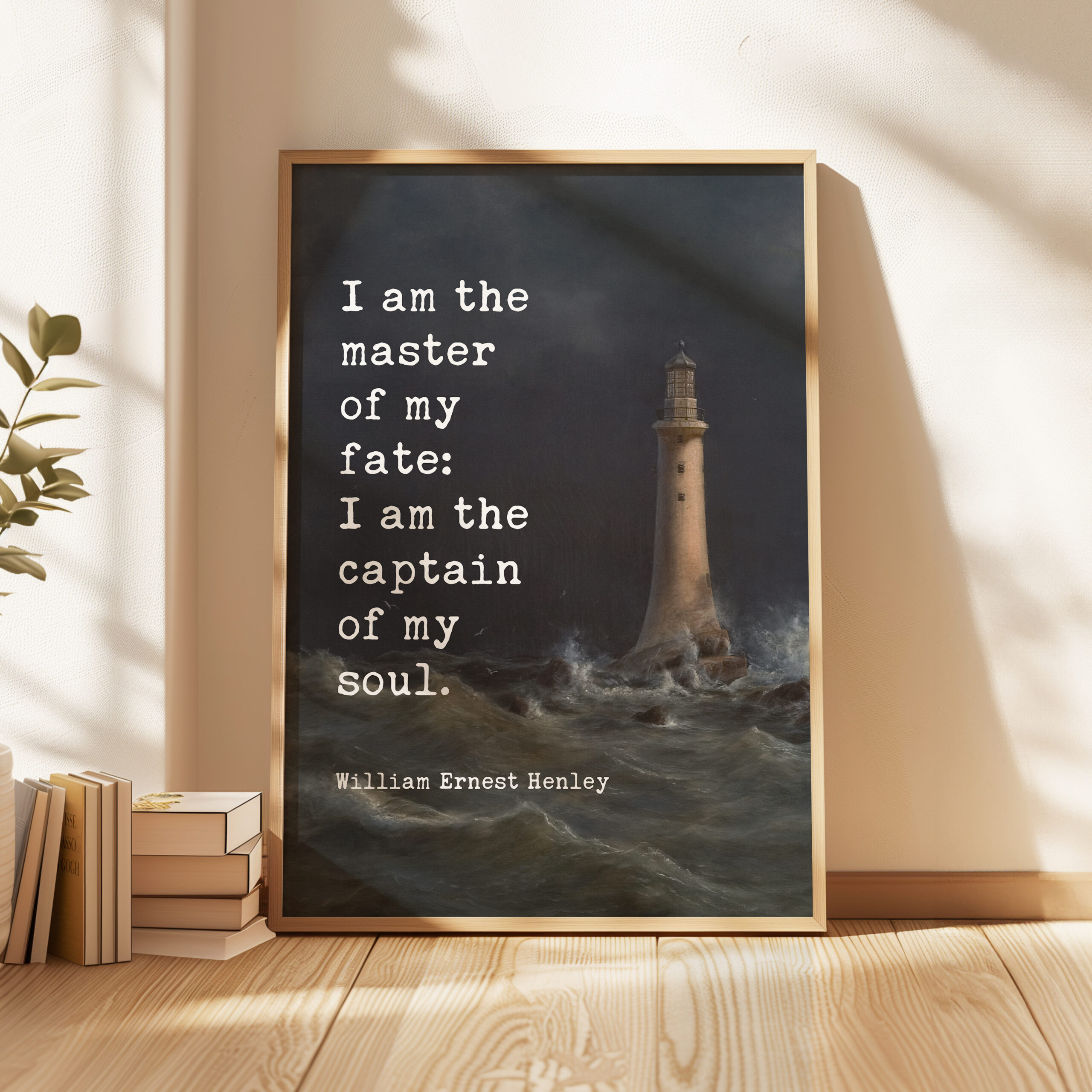 The empowering quote “I am the master of my fate: I am the captain of my soul” is displayed in a bold typewriter font, echoing the resolute spirit of a captain at the helm. Juxtaposed against the backdrop of Anton Melbye’s dramatic lighthouse painting, the artwork creates a powerful visual representation of Henley’s words.