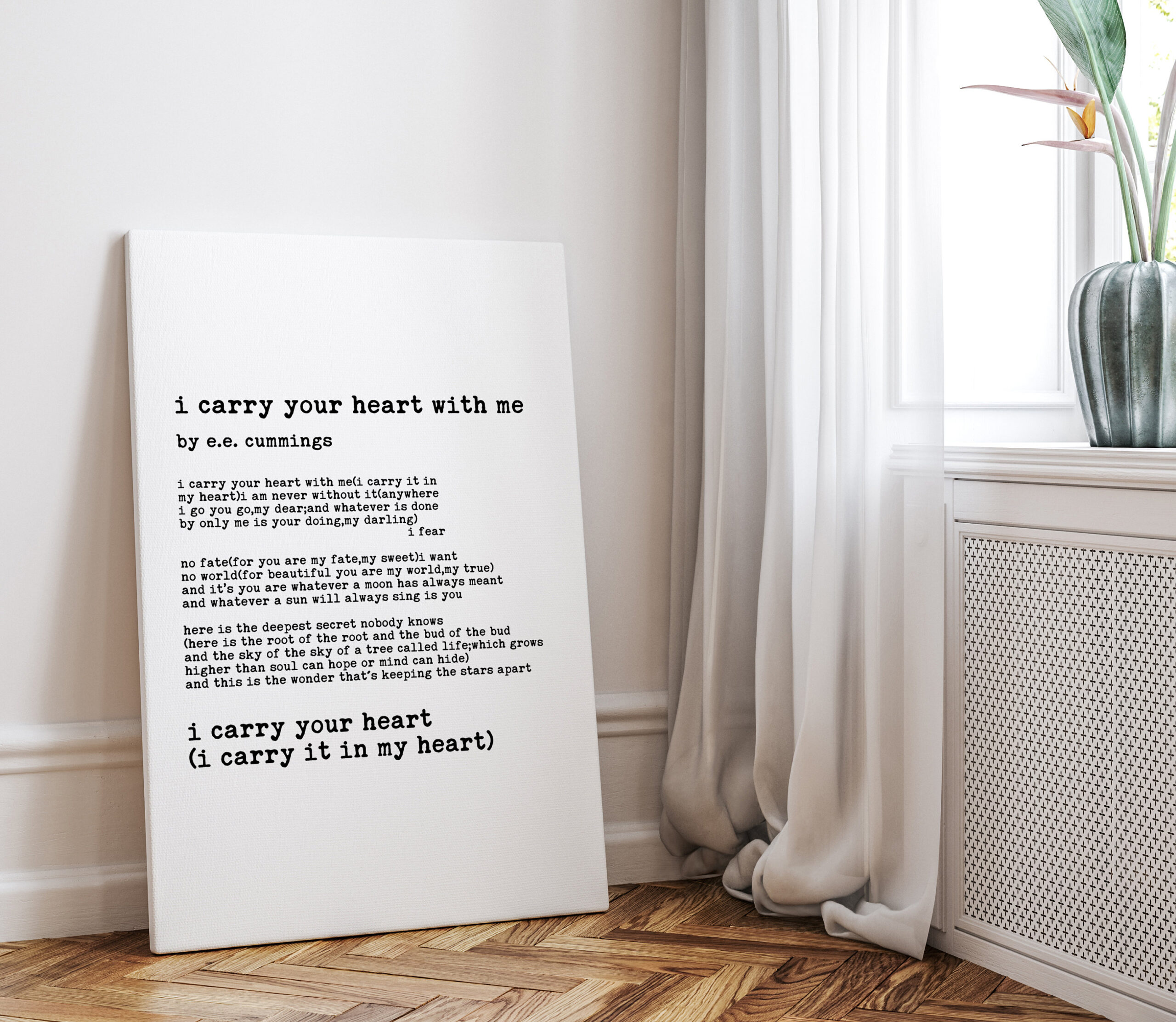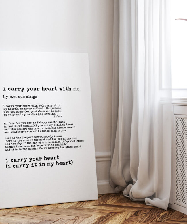 Celebrate the boundless power of love with this captivating typography art print featuring the iconic poem “i carry your heart with me (i carry it in my heart)” by E.E. Cummings.