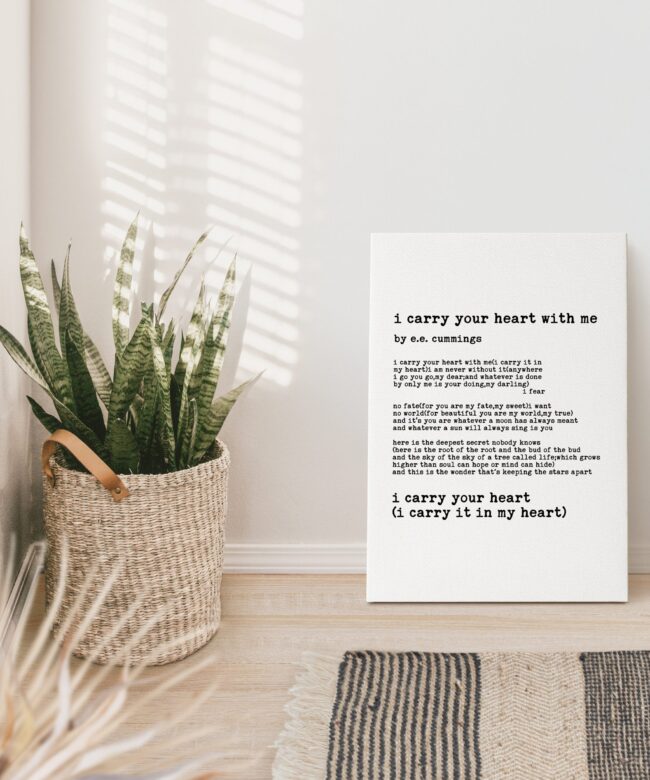 More than just words on a page, this artwork is a declaration of enduring love and connection. The elegant script of the poem intertwines with a minimalist design, creating a visually stunning expression of your deepest feelings. Cummings’ evocative language paints a picture of a love that is inseparable, like a cherished object carried close to the heart.