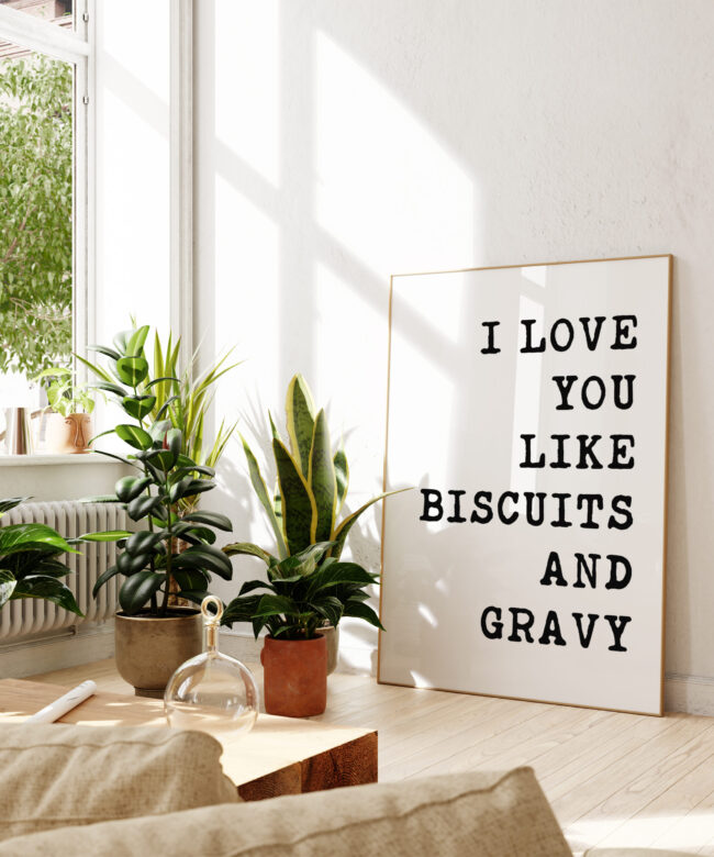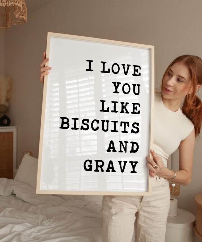Celebrate love with a twist! Our Typography Art Print features the charming phrase, “I love you like biscuits and gravy.” This whimsical quote adds a touch of humor and warmth to any space, making it perfect for kitchens, dining areas, or cozy nooks. The simple yet bold design enhances your decor while reminding you to cherish the joy and comfort of love. Ideal for gifting to a partner, friend, or family member, this print is a delightful way to express affection.