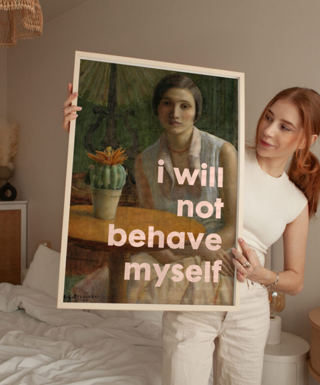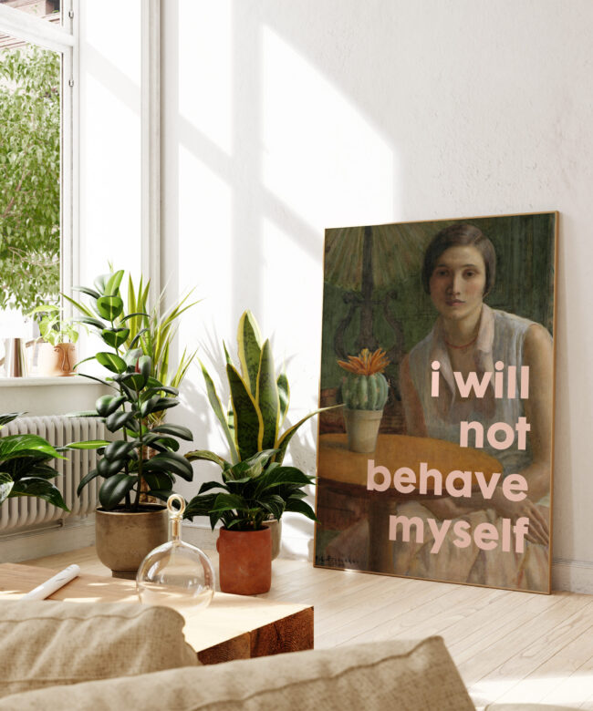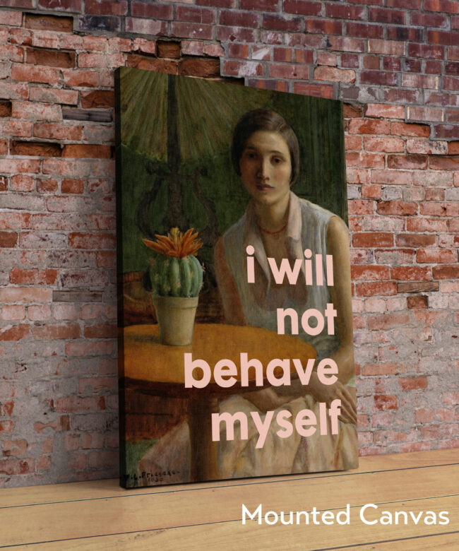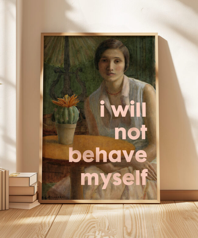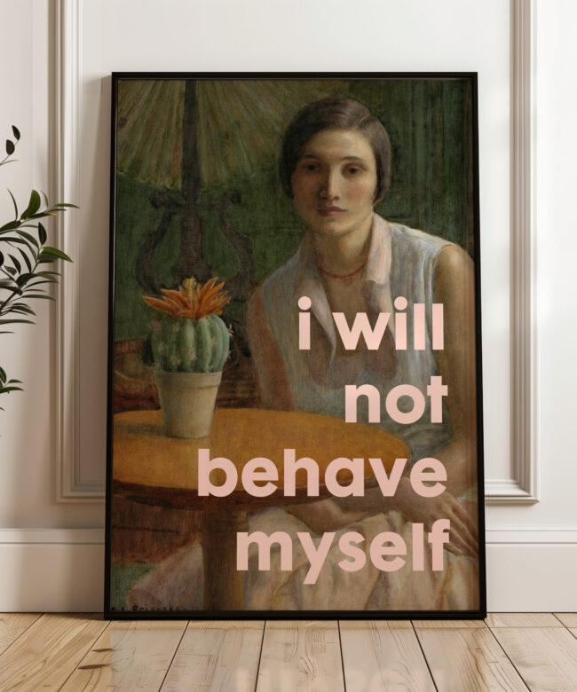 Make a bold statement with this striking Typography Art Print featuring the rebellious quote: “i will not behave myself.” Overlaid on the captivating painting, Portrait of a Woman with Cactus, this piece embodies a fierce sense of independence and unapologetic self-expression. The combination of the powerful quote and the vibrant artwork creates a visually stunning and thought-provoking piece, perfect for those who embrace their individuality and live life on their own terms.