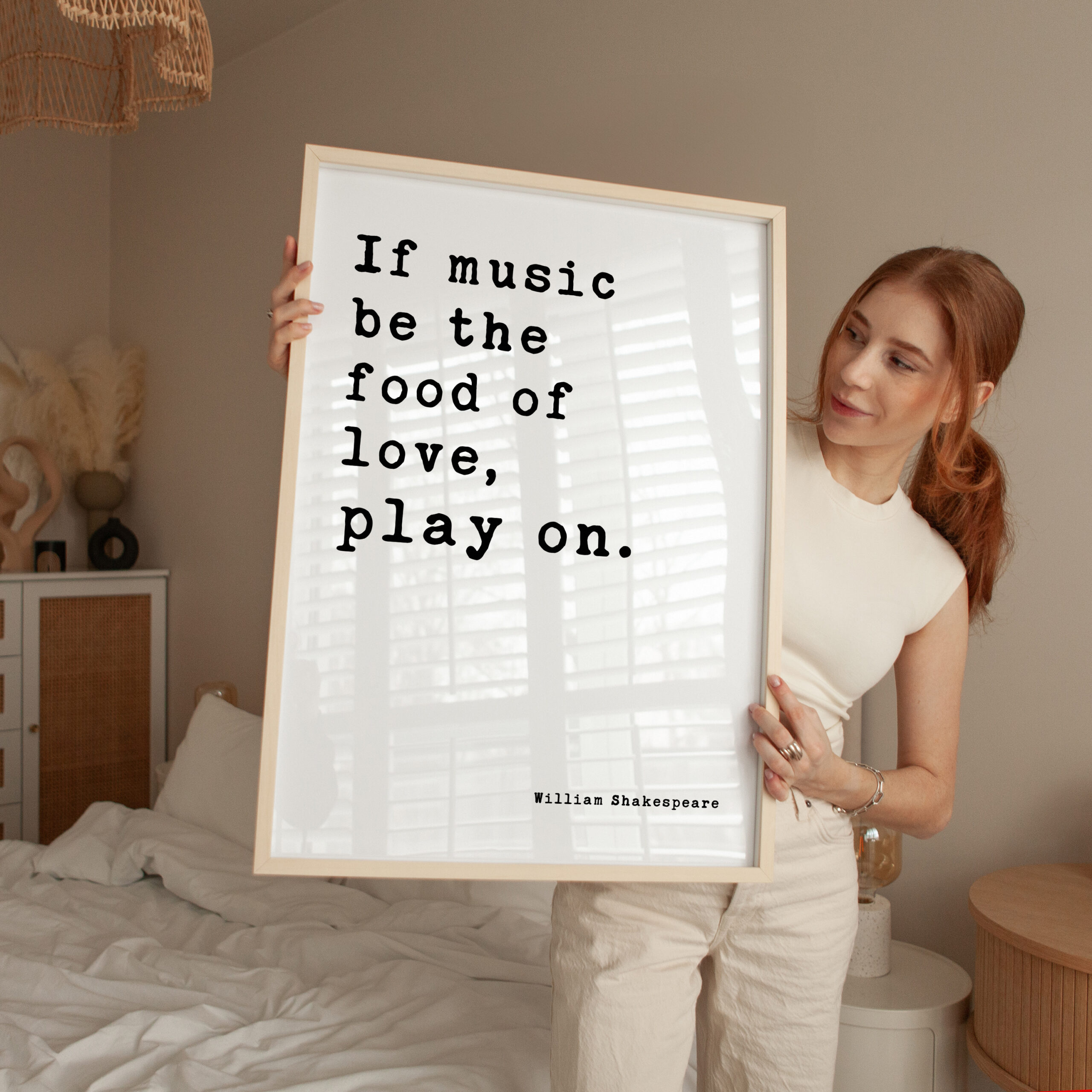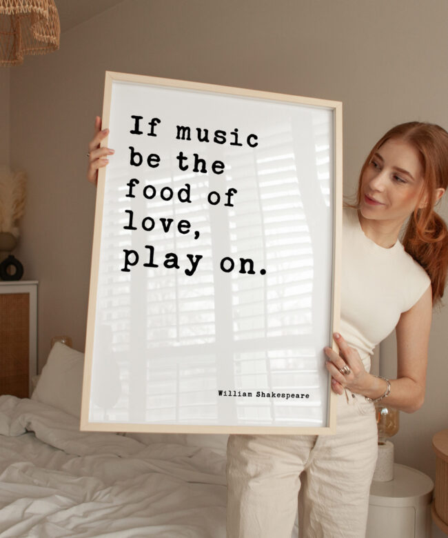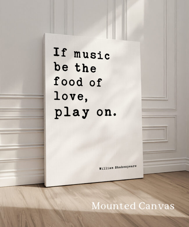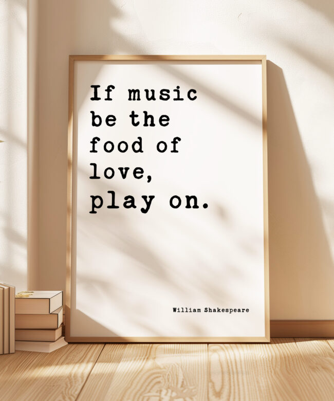 Celebrate the timeless union of music and love with this elegant Typography Art Print featuring Shakespeare’s immortal words: “If music be the food of love, play on.” Perfect for musicians, romantics, and Shakespeare enthusiasts alike, this piece blends classic literature with modern design. The delicate typography dances across the page, mirroring the harmony of melody and emotion. A harmonious gift for weddings, anniversaries, or anyone who believes in the soul-stirring power of music—because love, like a beautiful song, deserves to play on.