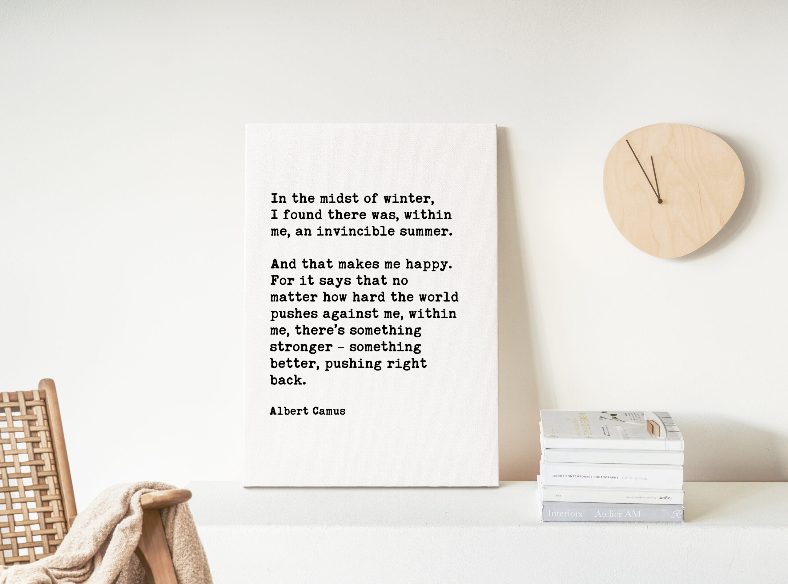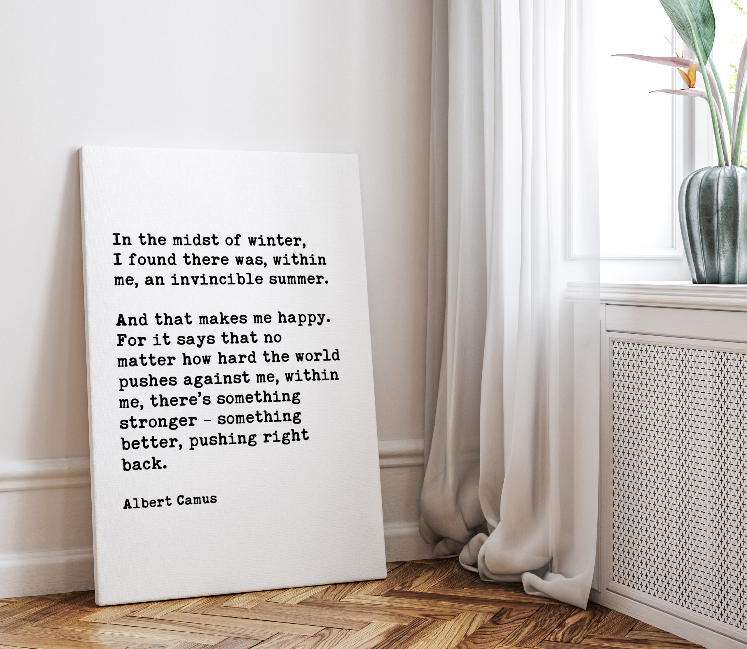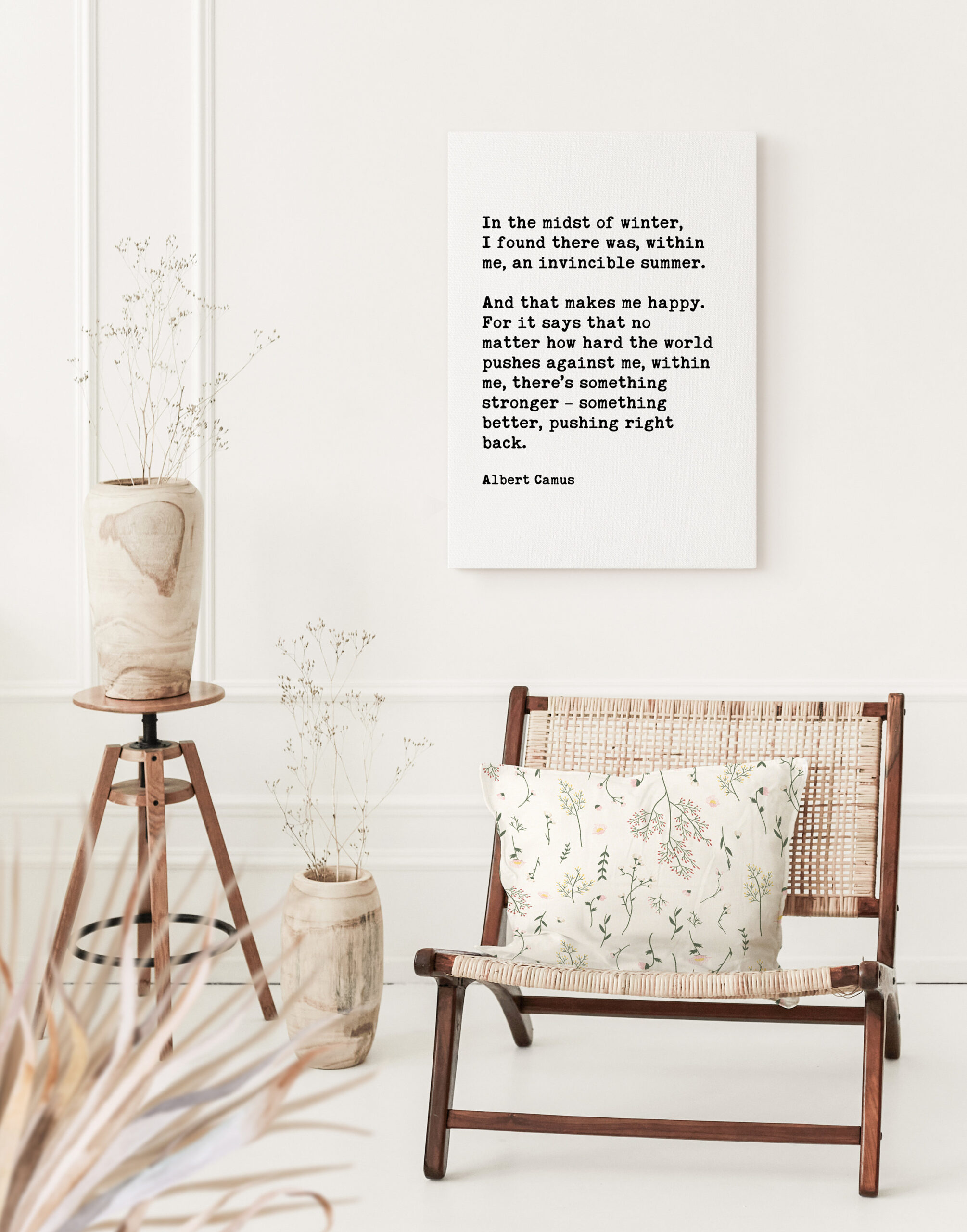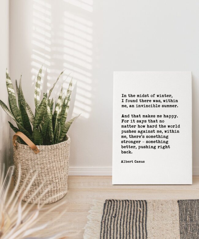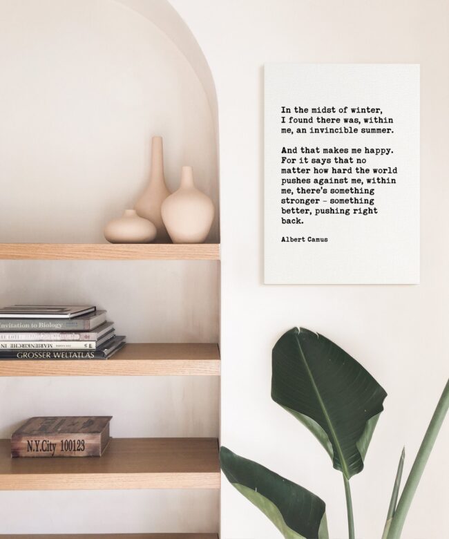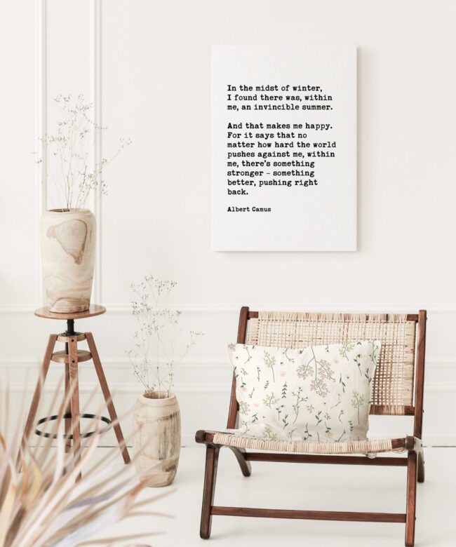 Bring the warmth of eternal summer into your space with this beautifully crafted typography art print. The powerful words of Albert Camus remind us that resilience resides within us, even during life’s coldest seasons.