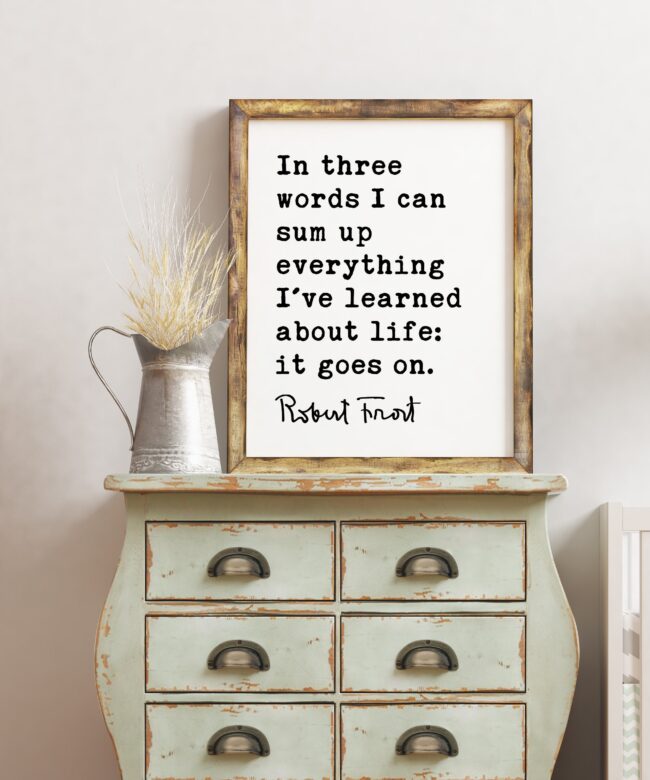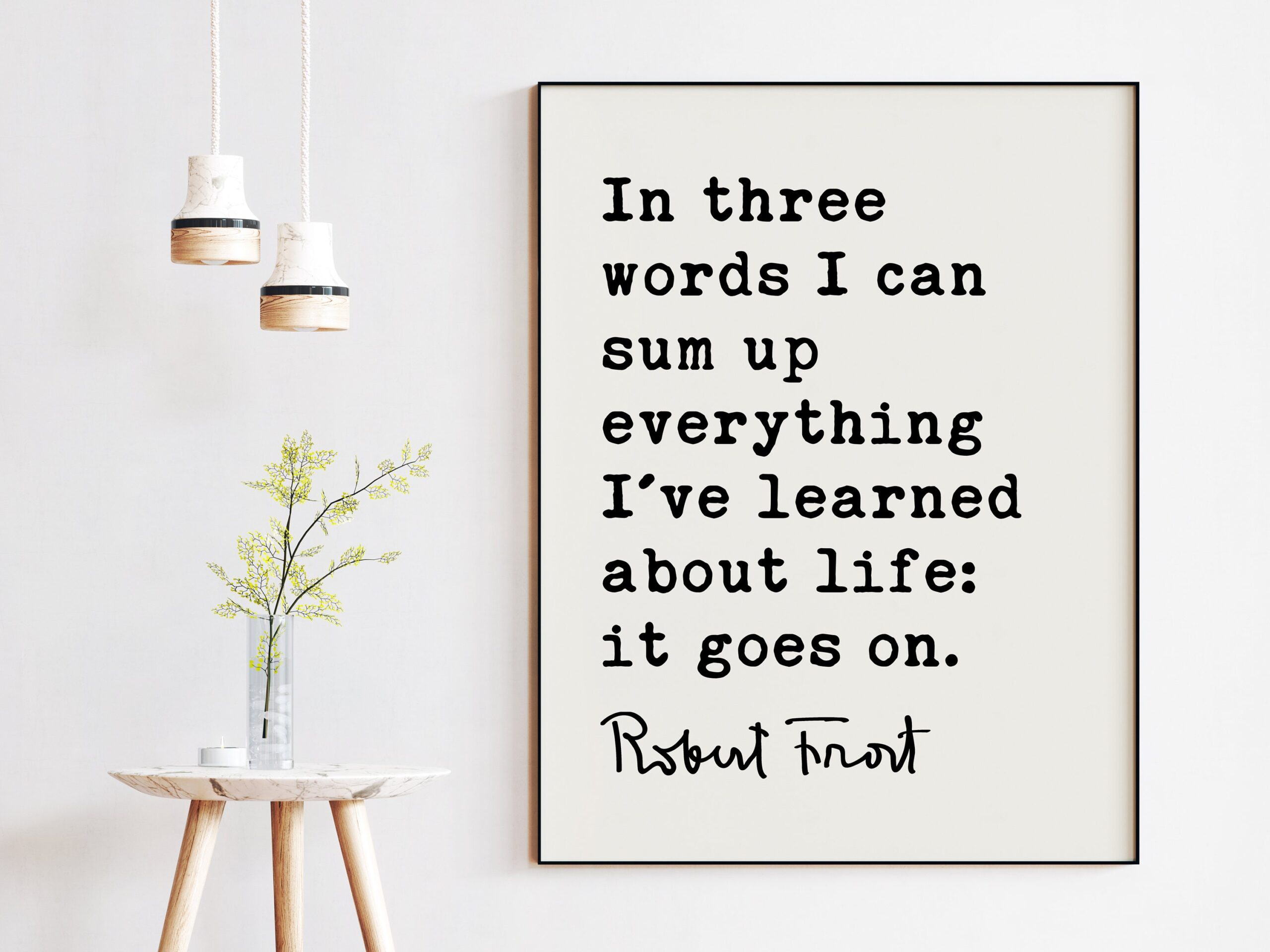 In three words I can sum up everything I’ve learned about life: it goes on. – Robert Frost Quote Print Art, Life Quotes, Moving On
