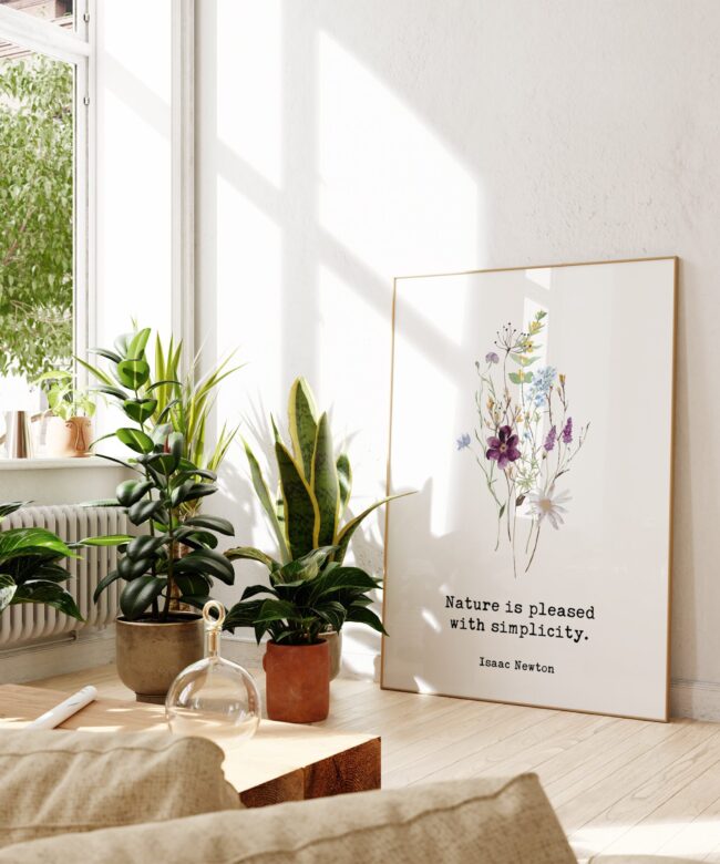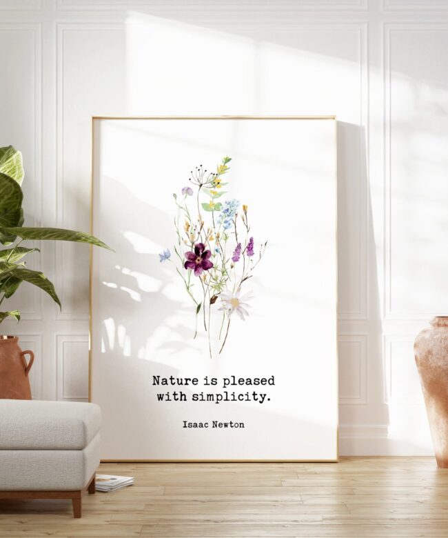 Isaac Newton Quote, “Nature is pleased with simplicity.” Typography Art Print with Wildflowers- Nature Lover – Environmentalist