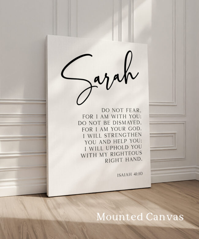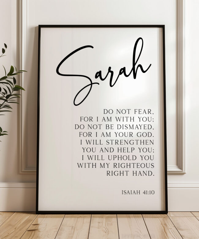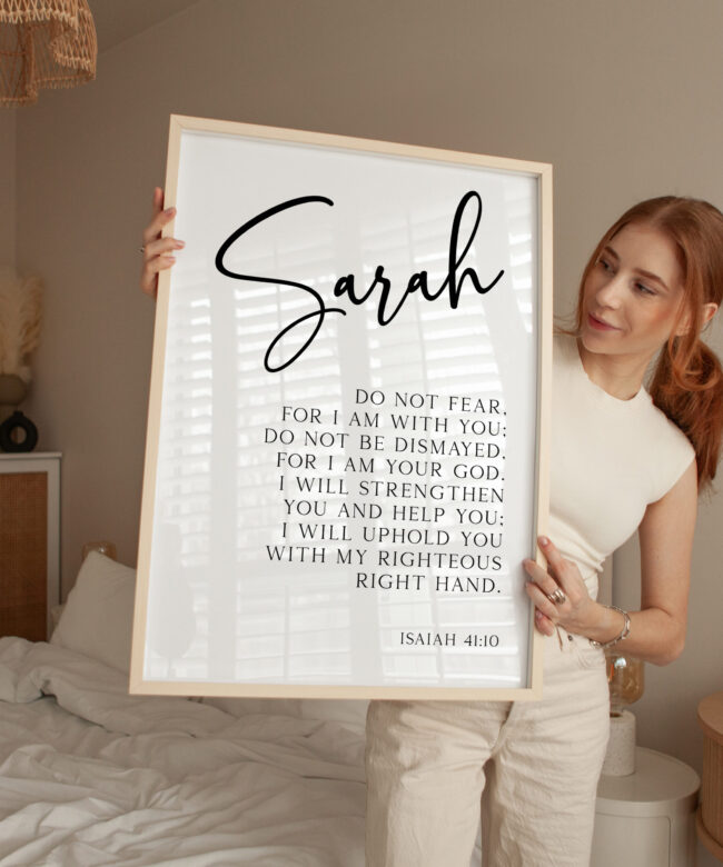 This inspiring Typography Art Print features the powerful message from Isaiah 41:10, beautifully designed and personalized with your name. “Do not fear, for I am with you; do not be dismayed, for I am your God. I will strengthen you and help you; I will uphold you with my righteous right hand.” This custom print is a perfect reminder of God’s presence and strength, bringing hope and encouragement to your space. Whether displayed in your home or gifted to someone special, it serves as a daily affirmation of faith.