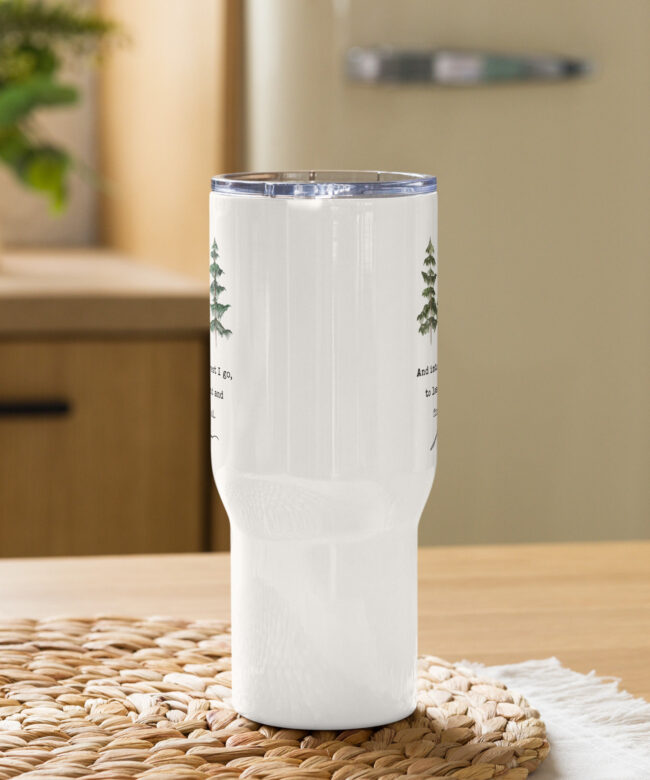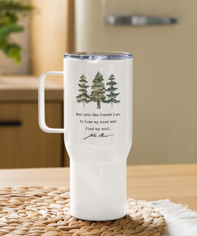Escape the daily grind and reconnect with nature’s embrace with our John Muir Wanderlust Mug. This 25 oz stainless steel travel mug features the iconic quote, “And into the forest I go, to lose my mind and find my soul,” beautifully hand-lettered featuring a backdrop of majestic watercolor evergreen trees.