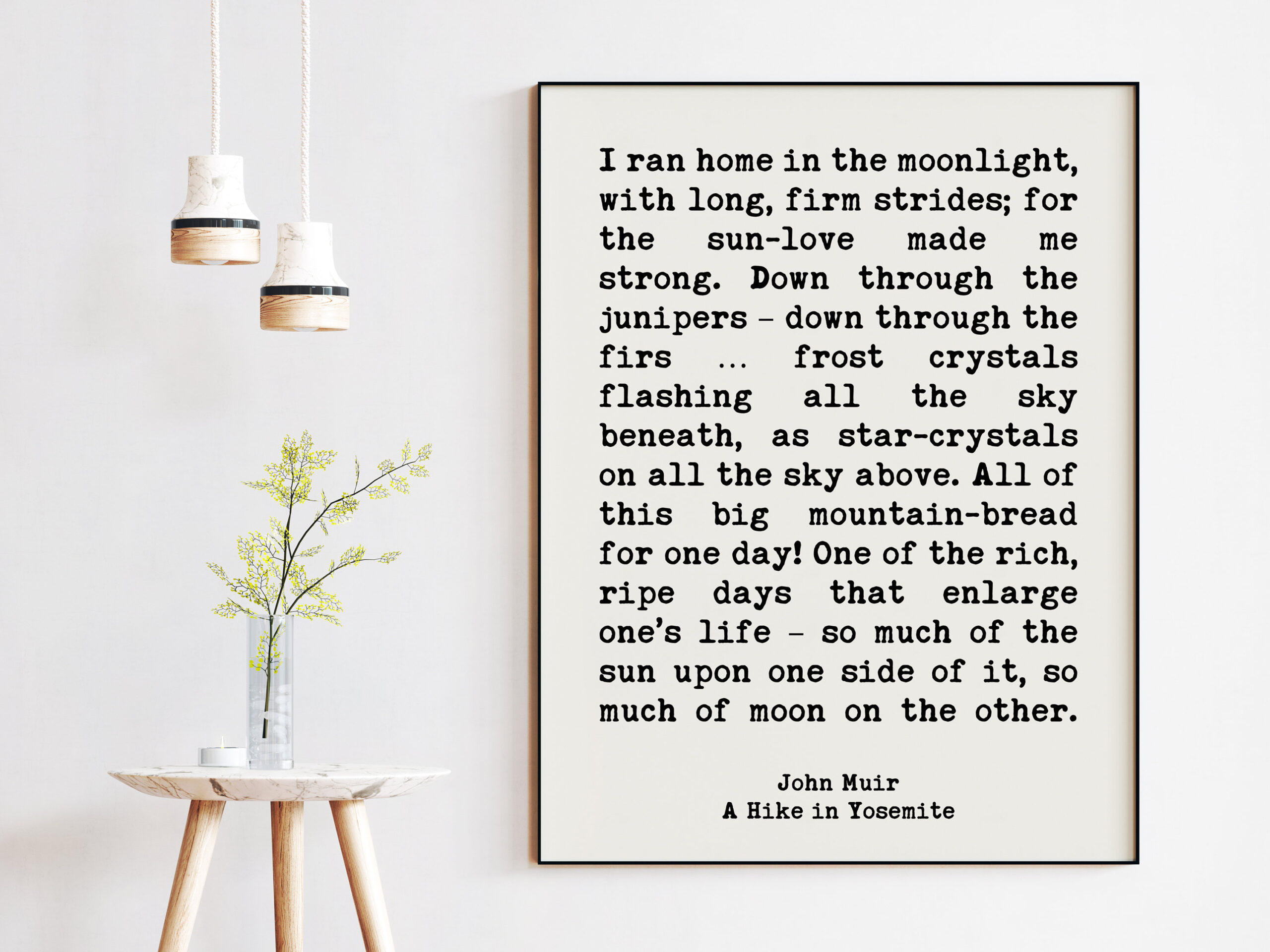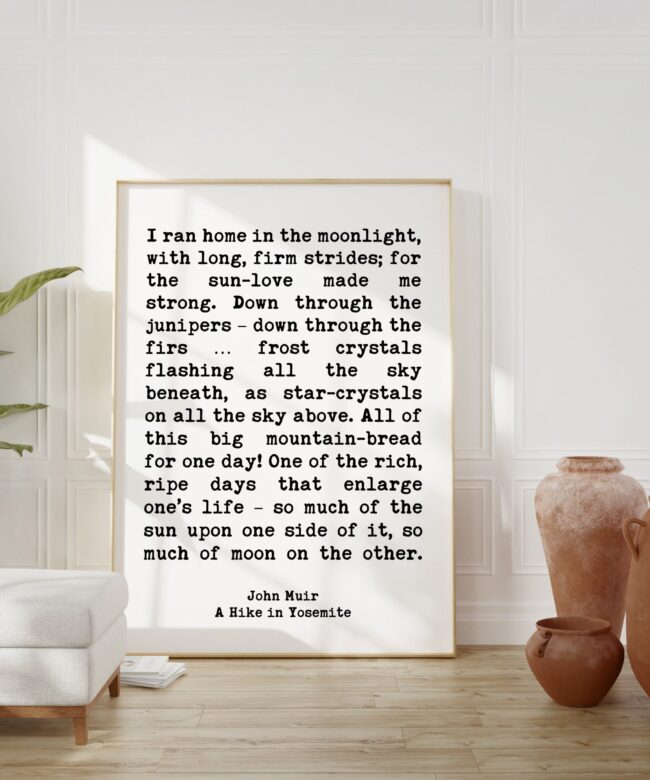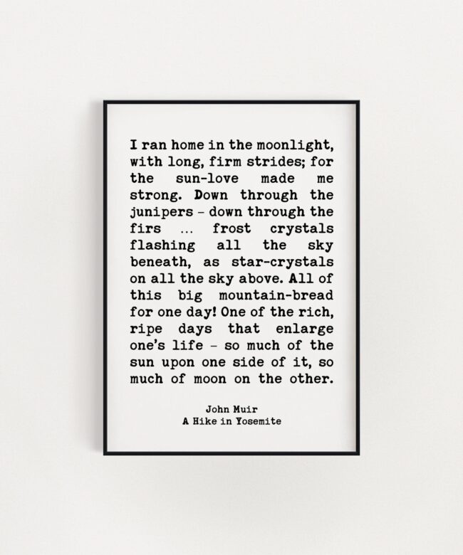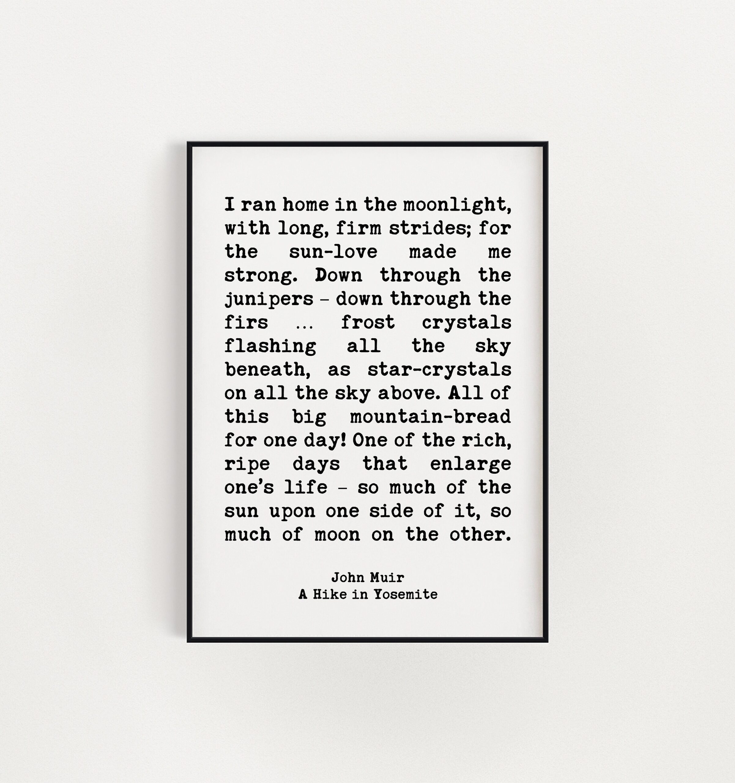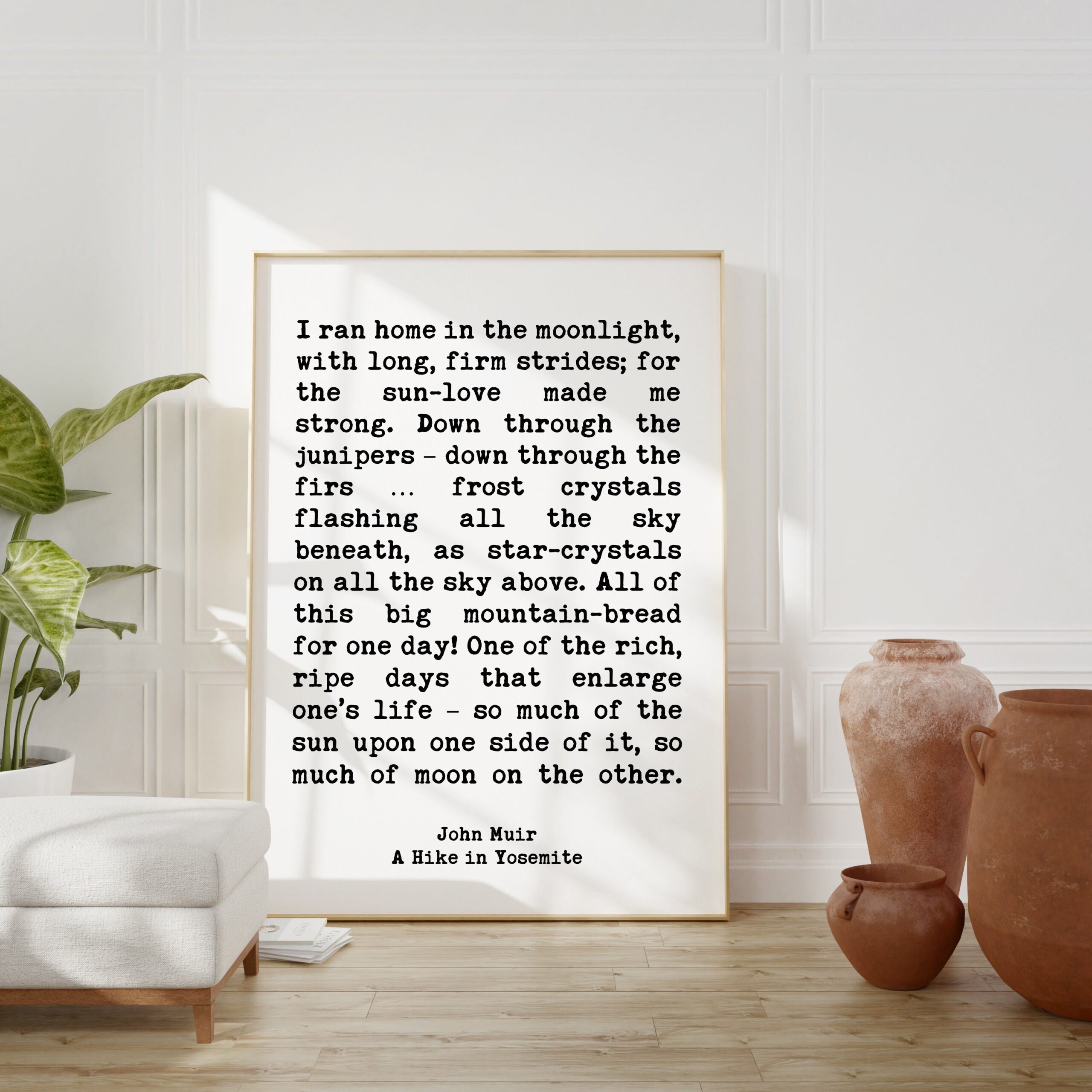 John Muir Quote I ran home in the moonlight, with long, firm strides; for the sun-love made me strong. Art Print – A Hike in Yosemite