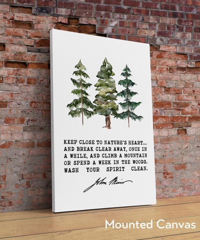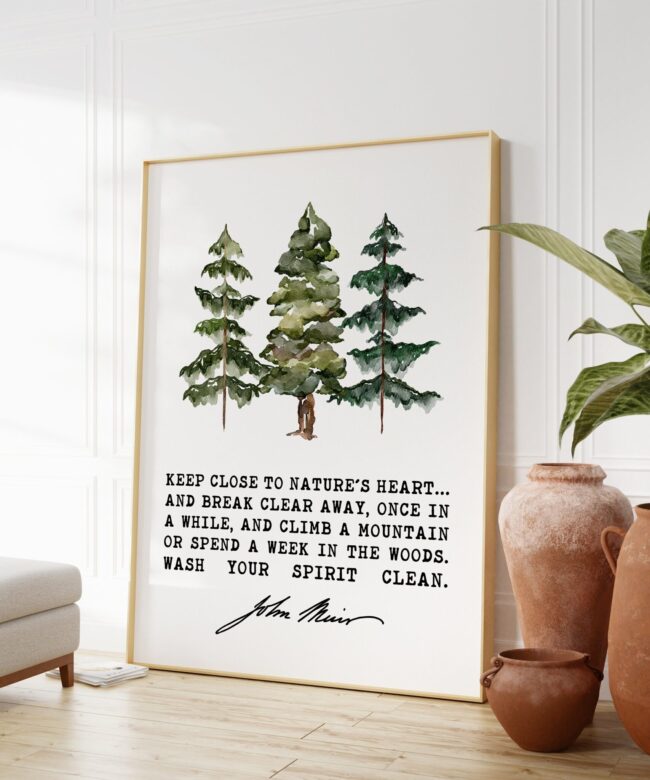 More than just words on a wall, this print is a vibrant invitation to embrace the transformative power of nature. Lush watercolor evergreen trees paint a serene backdrop, echoing the serenity found in the wilderness. Muir’s poignant quote serves as a gentle reminder to reconnect with our roots, to seek solace in the embrace of the natural world, and to wash away the stresses of daily life.