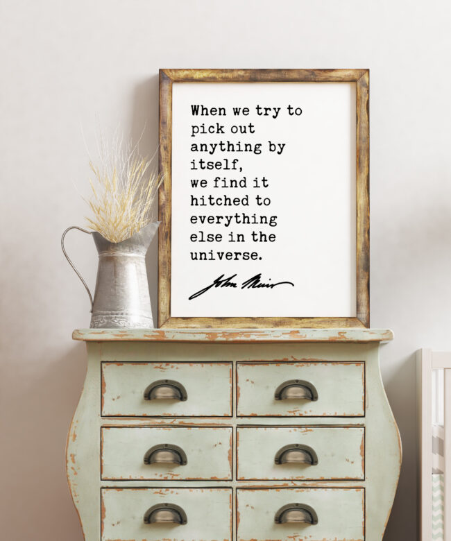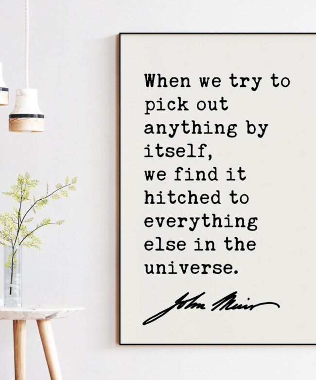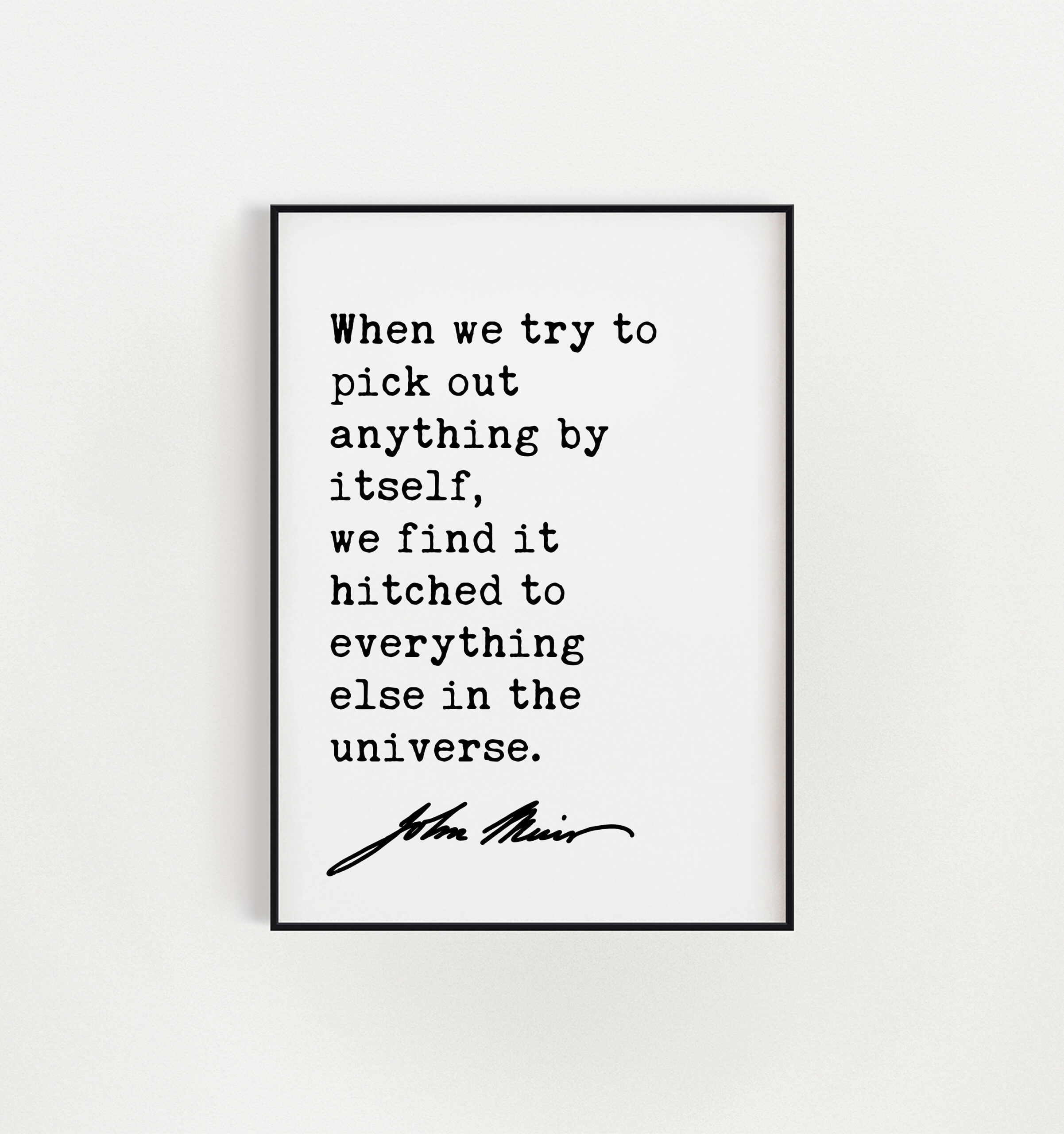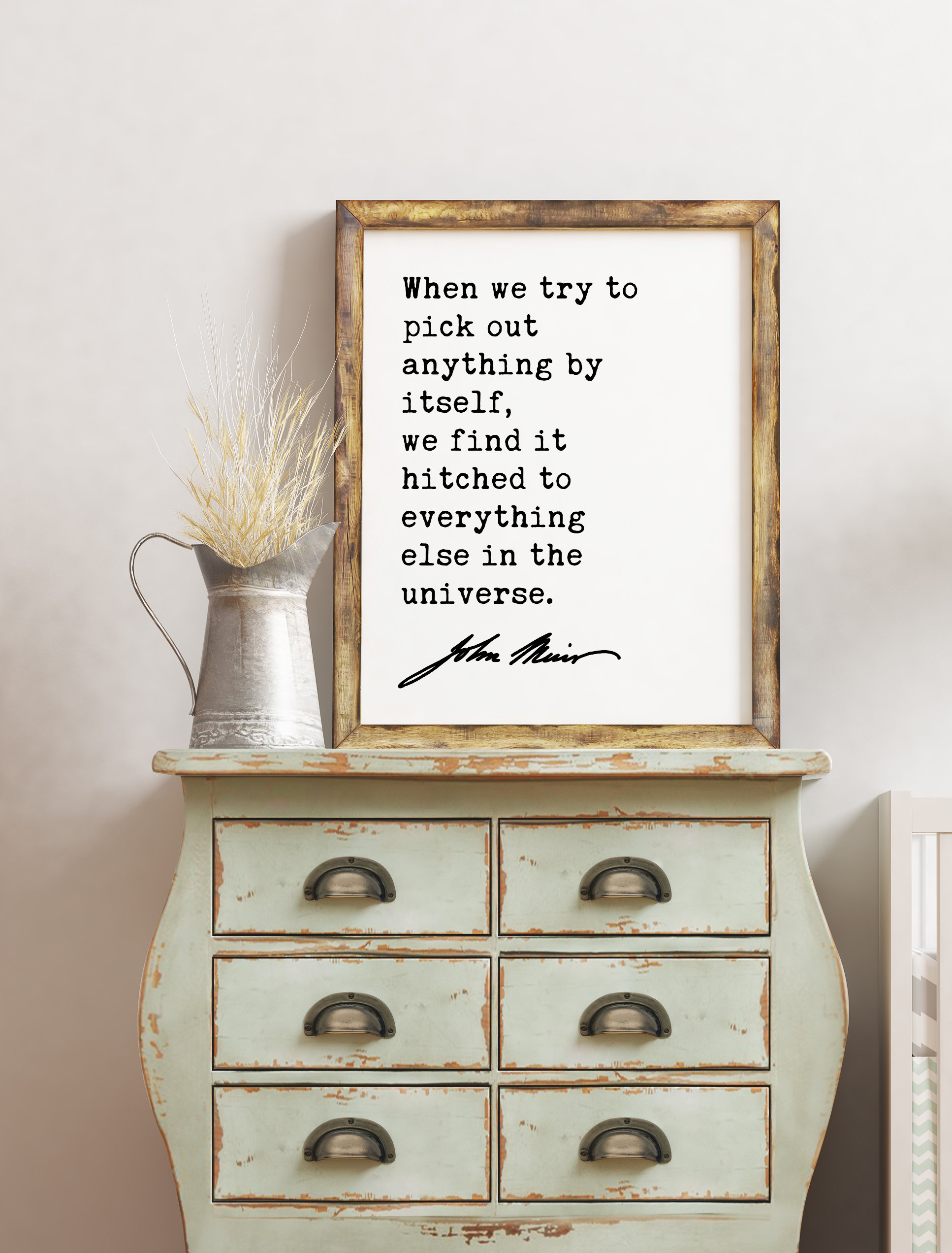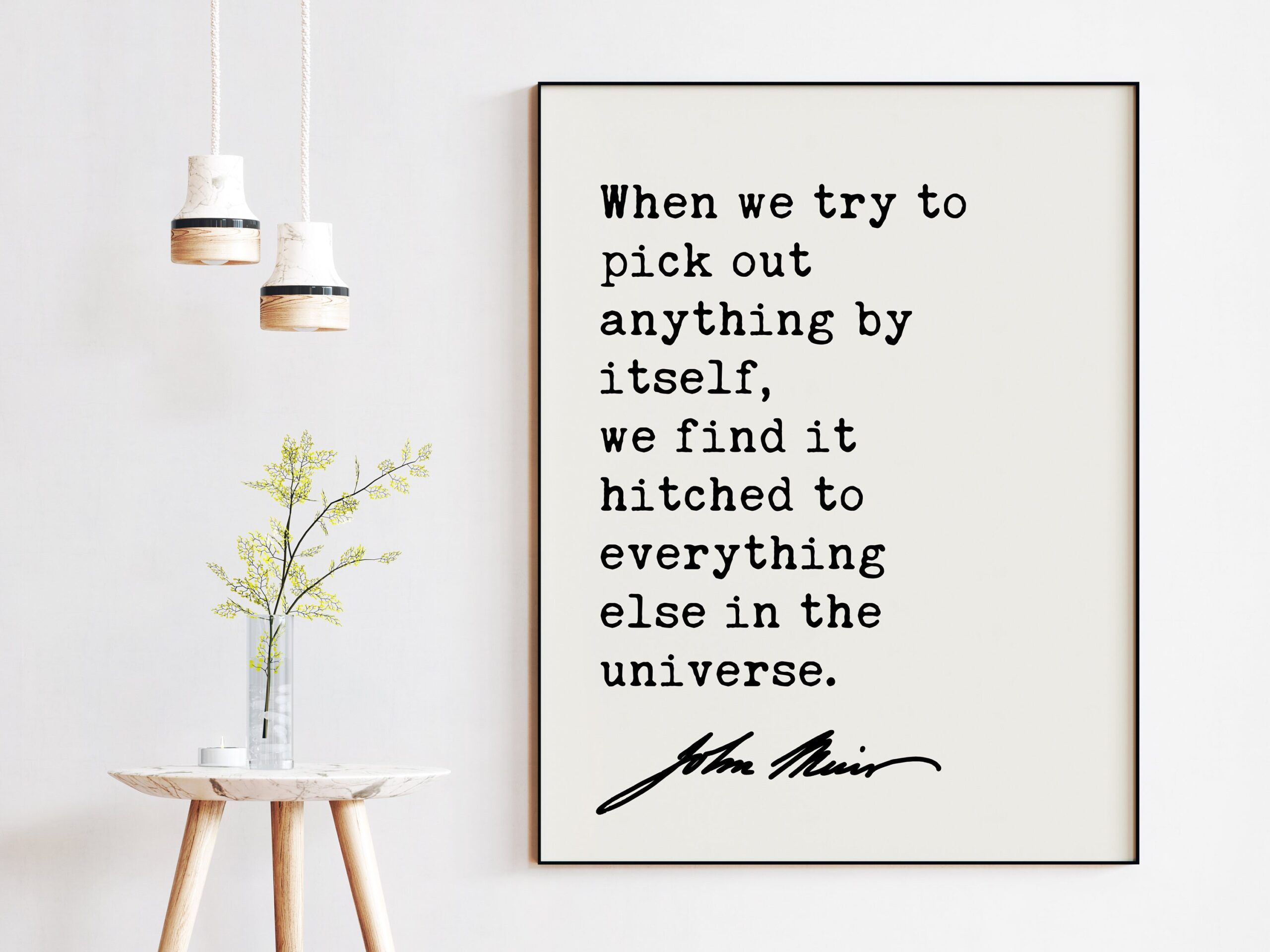 John Muir Quote – When we try to pick out anything by itself, we find it hitched to everything else in the universe. Art Print