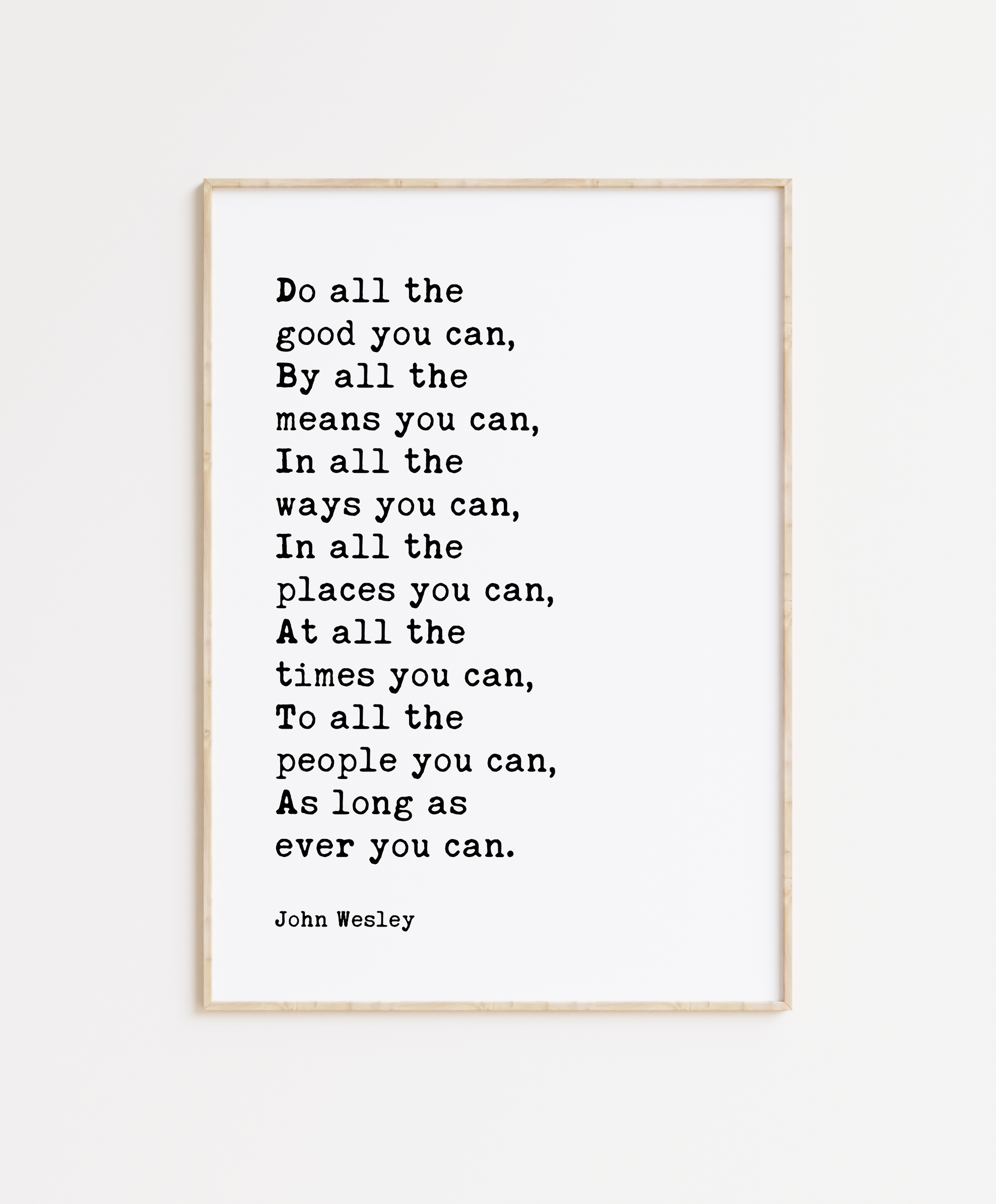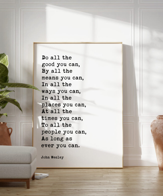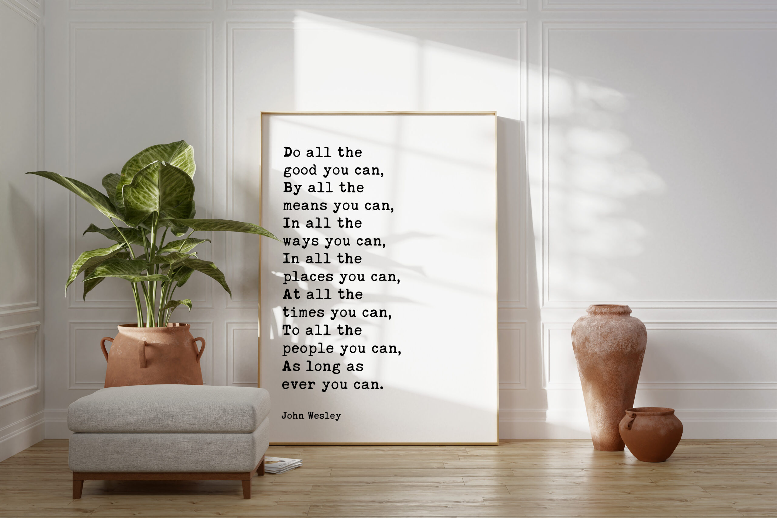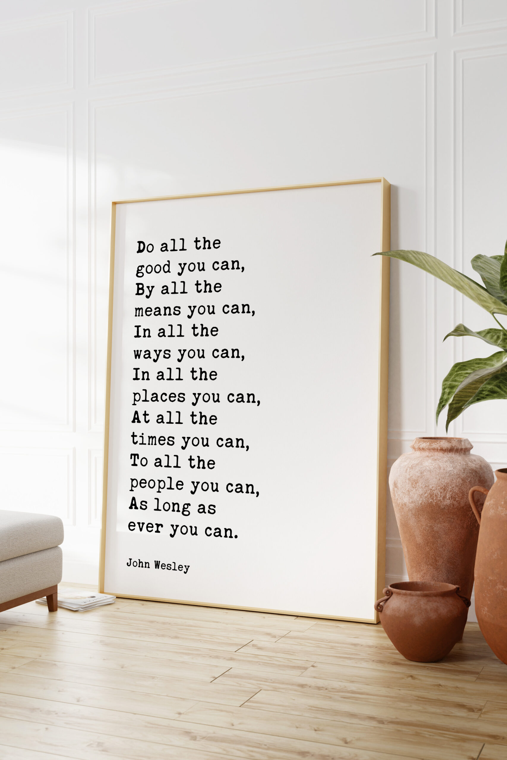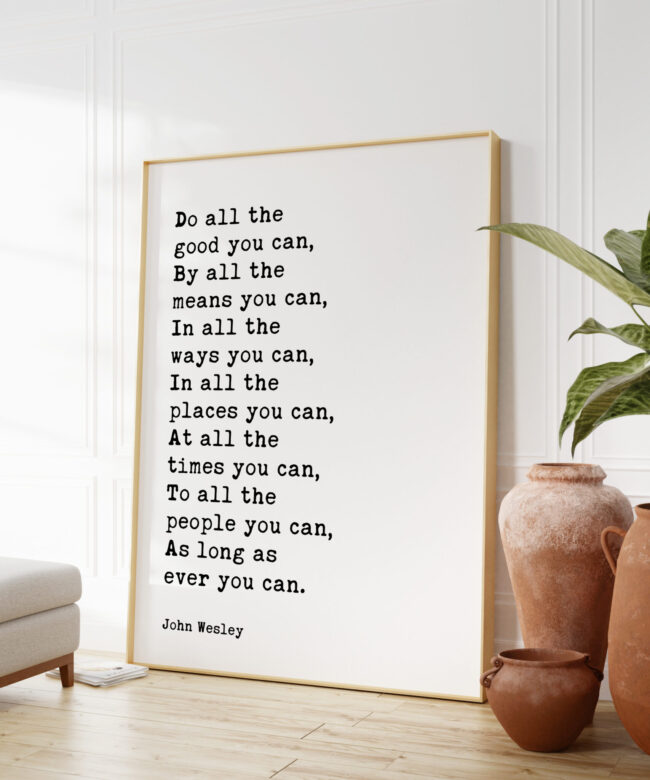 Illuminate your space with the profound wisdom of John Wesley with our Typography Art Print featuring the quote: “Do all the good you can. As long as ever you can.” This artful print embodies the timeless guidance of Wesley, encouraging a life dedicated to positive impact.
