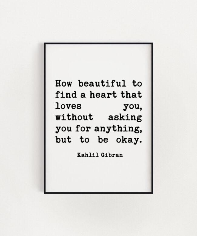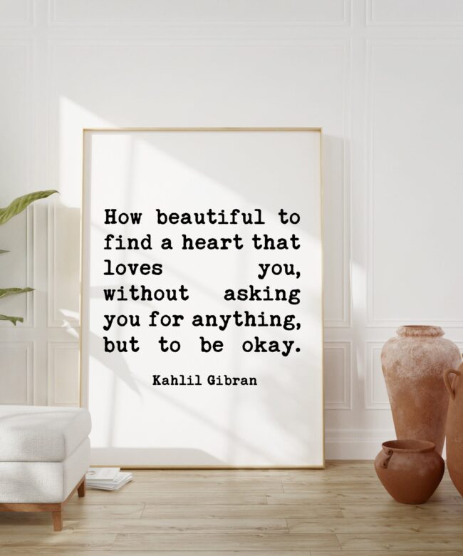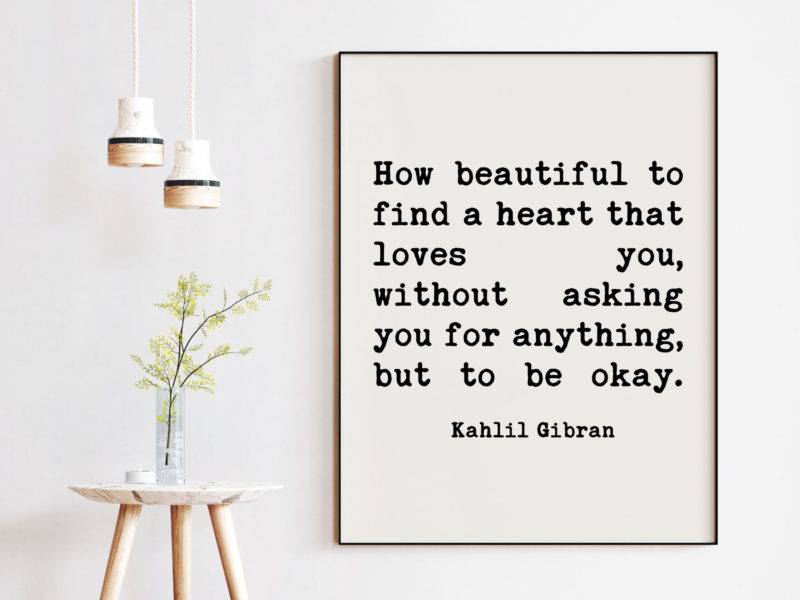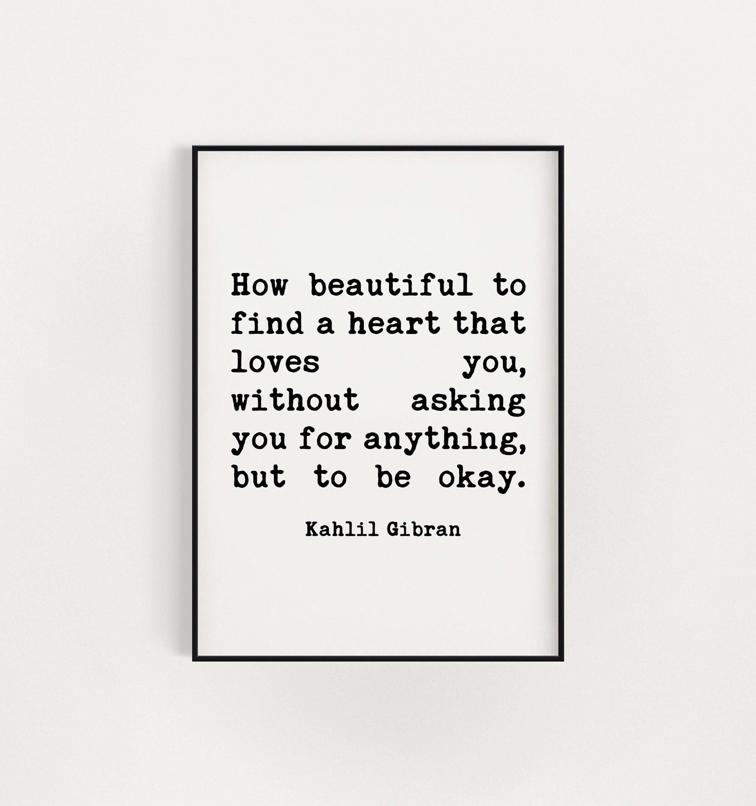 Kahlil Gibran Quote – How beautiful to find a heart that loves you, without asking you for anything, but to be okay. Art Print – Love Quote
