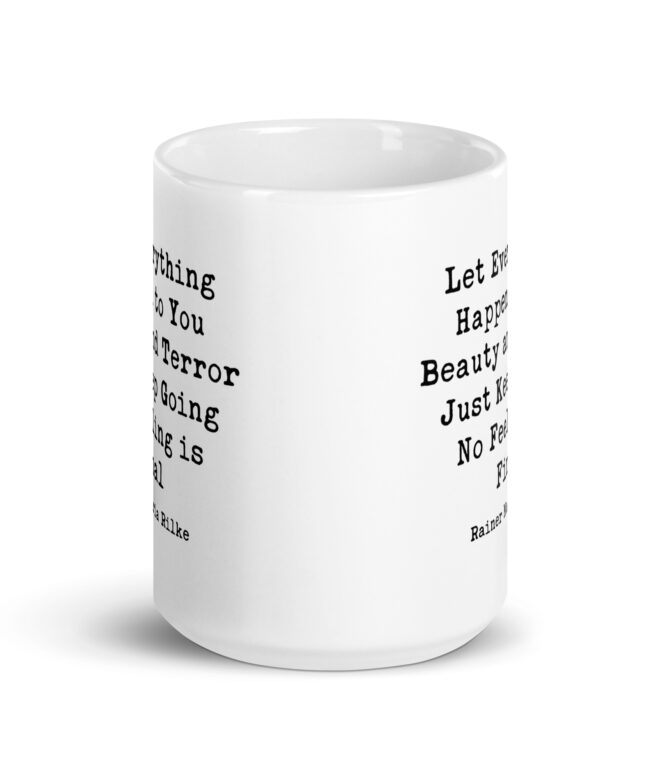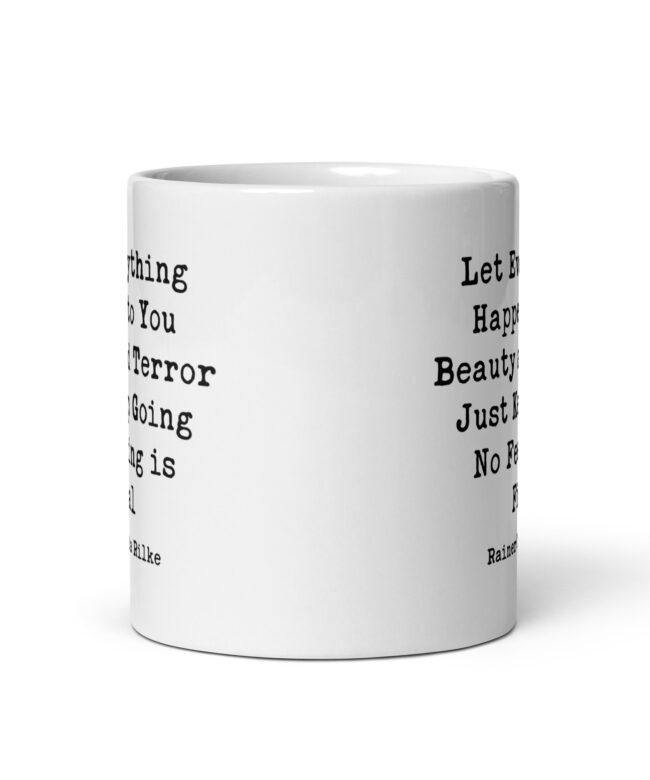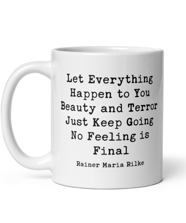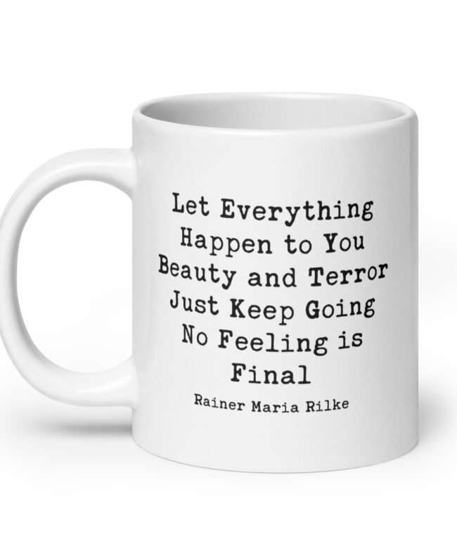 Introducing our Let Everything Happen To You coffee/tea mug, featuring a powerful quote by Rainer Maria Rilke. This mug is perfect for those who appreciate the beauty and struggles of life, and believe in the importance of perseverance. With its durable ceramic material and comfortable handle, this mug is perfect for sipping your favorite beverage while reflecting on the wisdom of this timeless quote. Start your day off right with a reminder that no feeling is final, and that you have the strength to keep going through anything life throws your way. Get your Let Everything Happen To You mug today and add a touch of inspiration to your daily routine!
