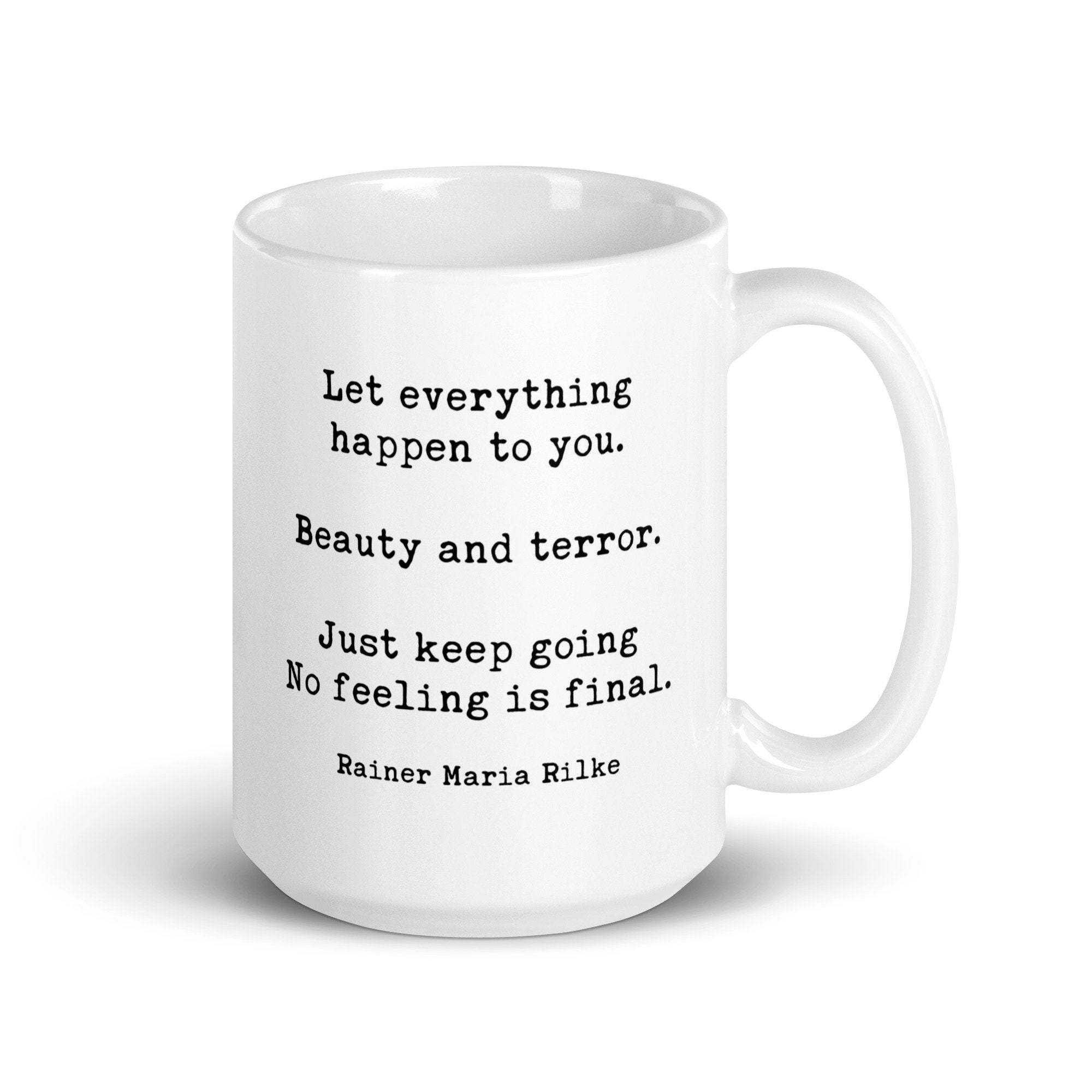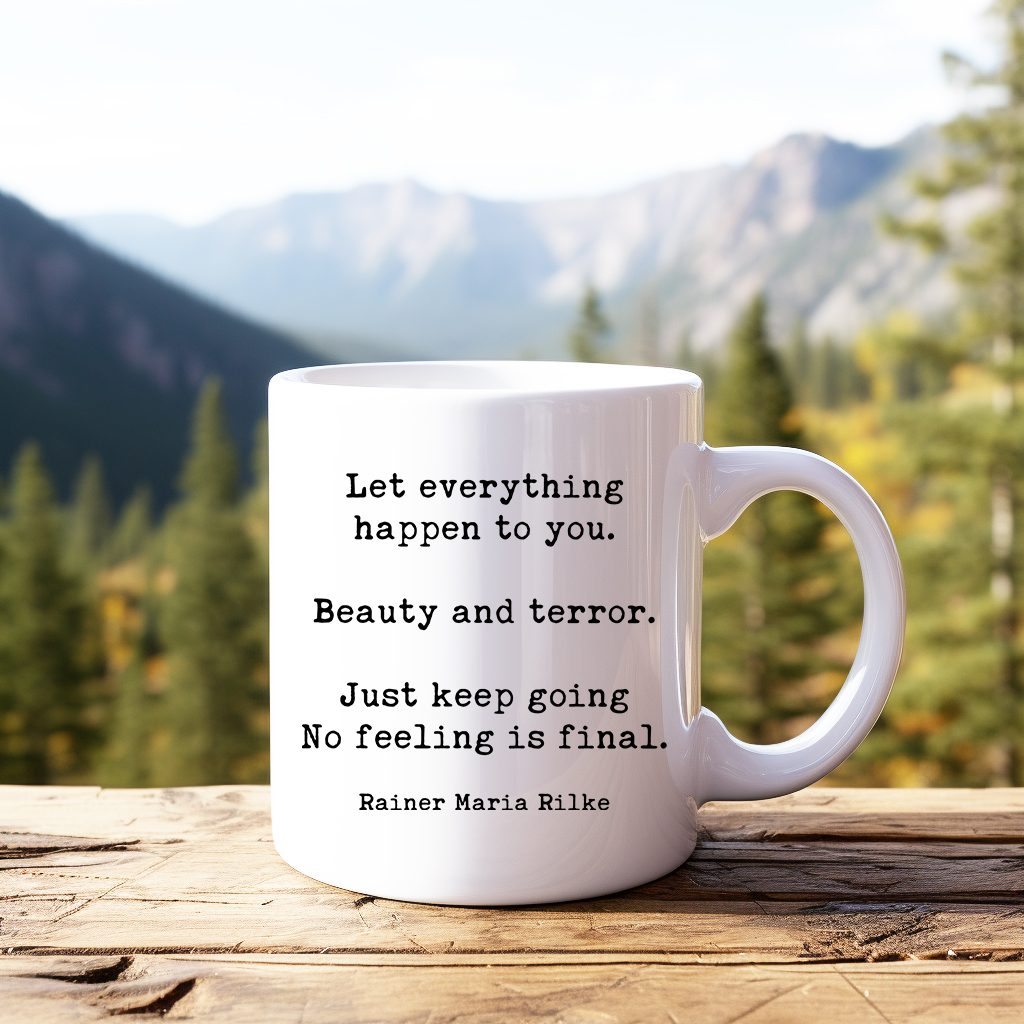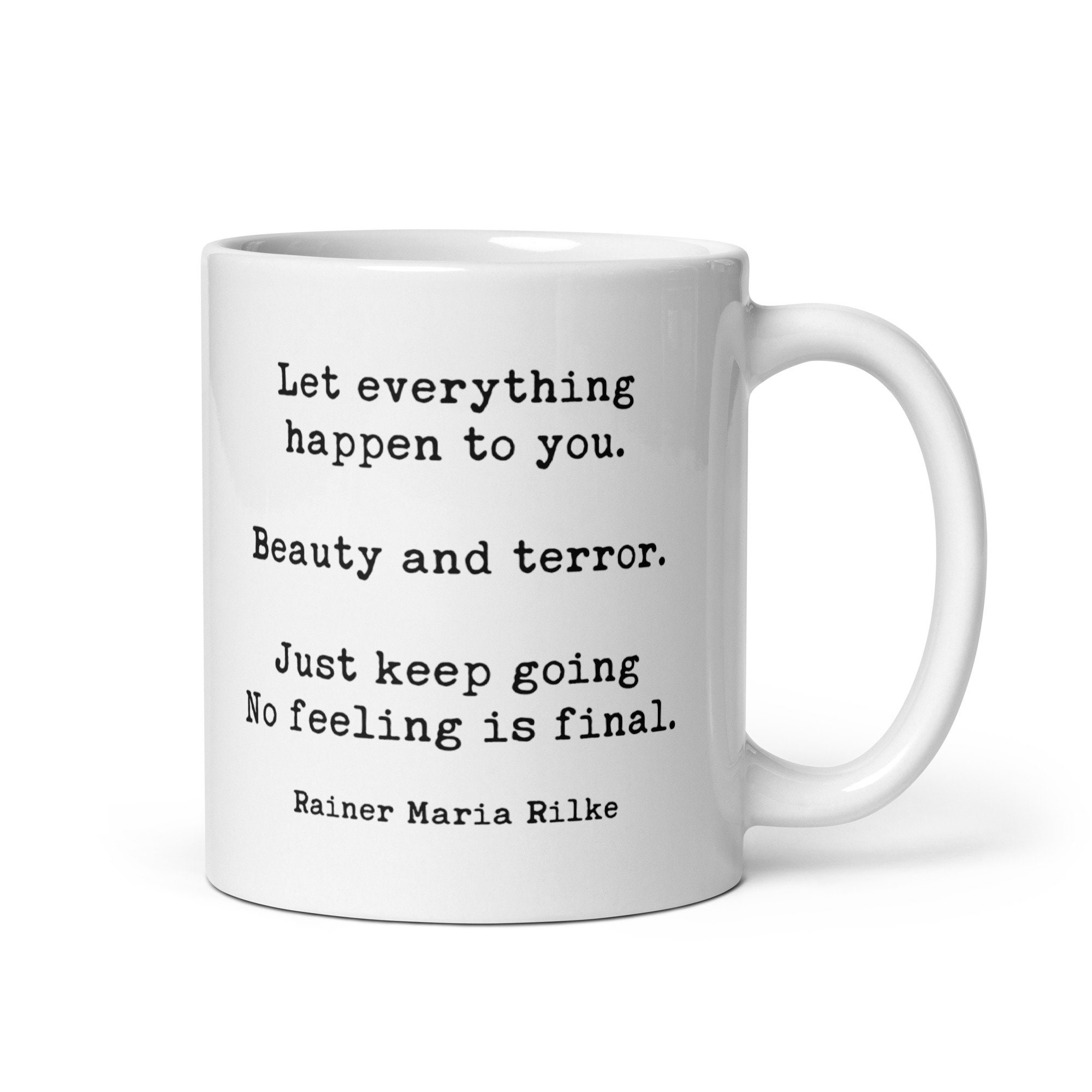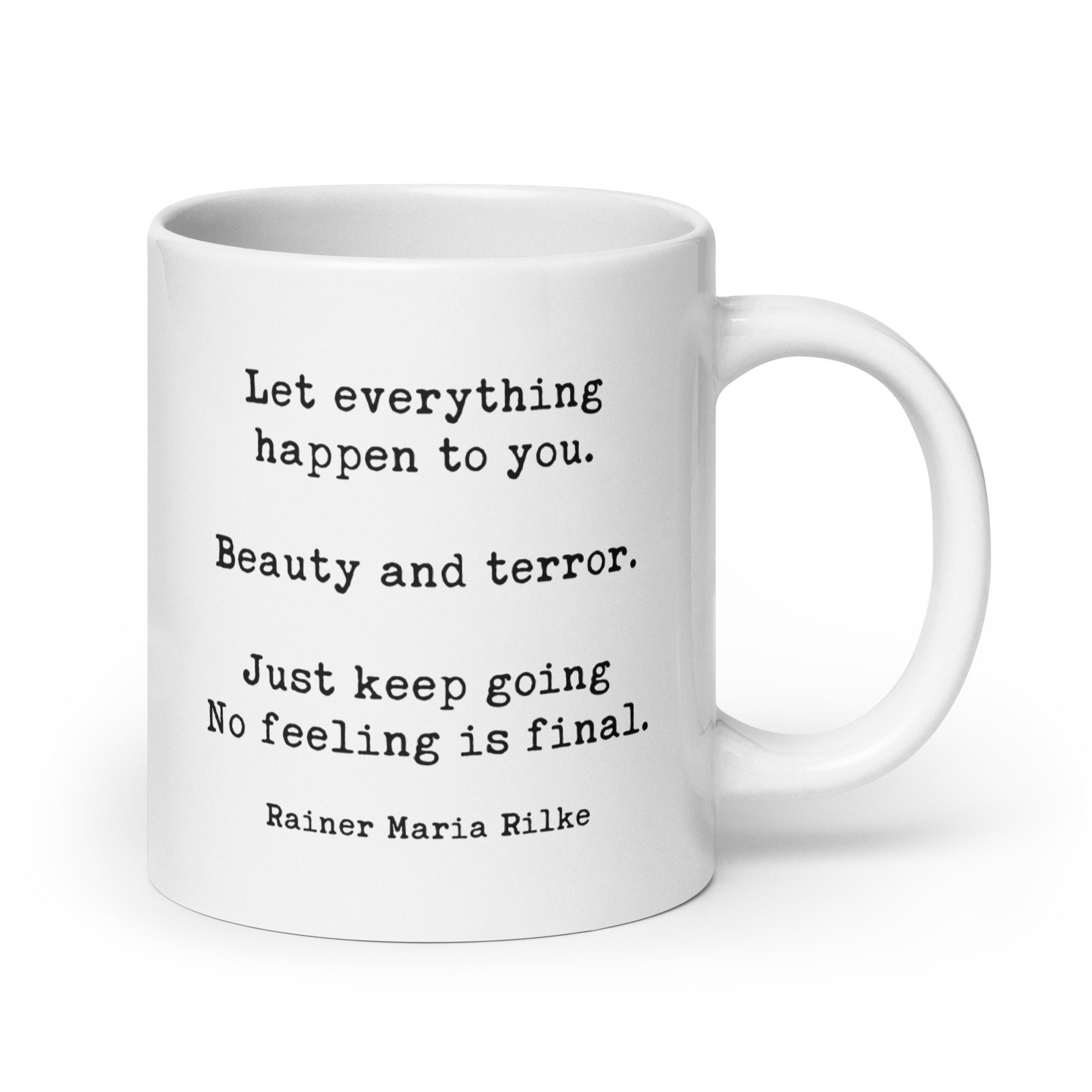 Start your day with a powerful reminder with this captivating ceramic coffee mug featuring the evocative words of Rainer Maria Rilke: