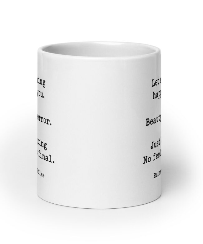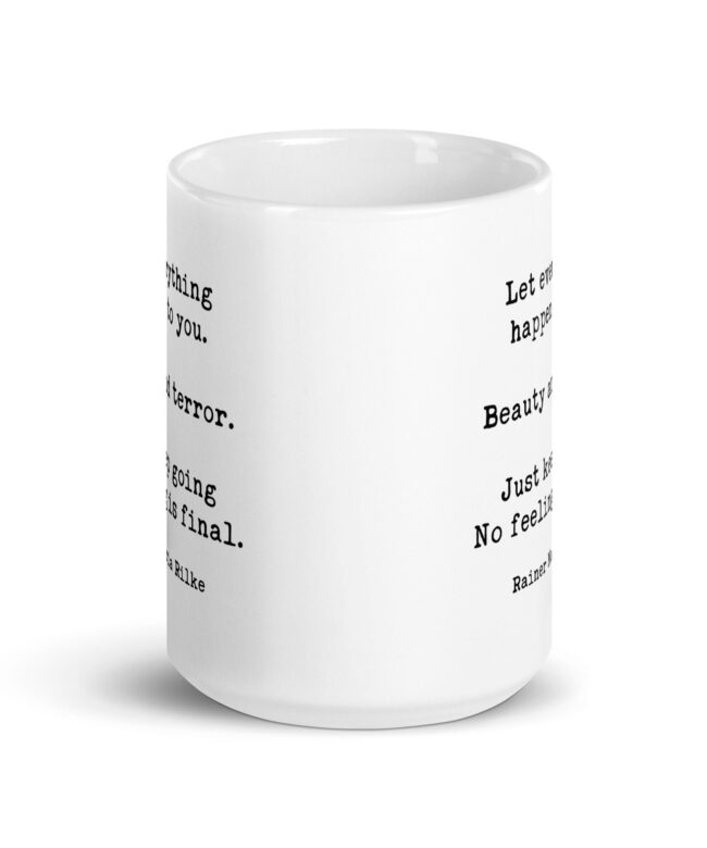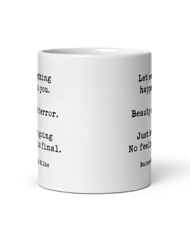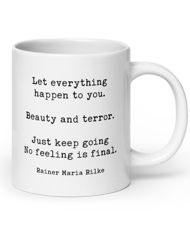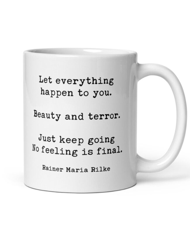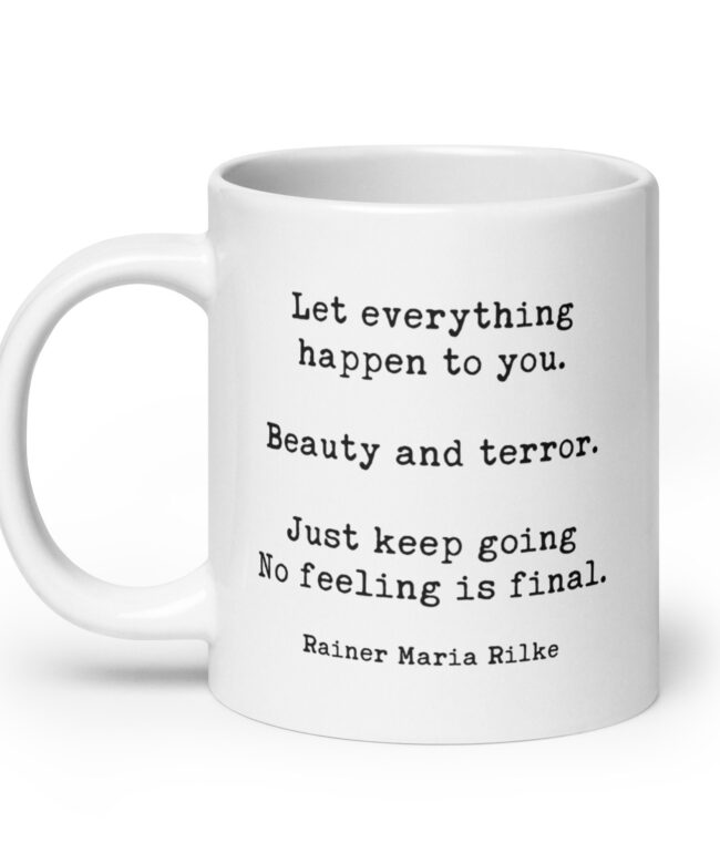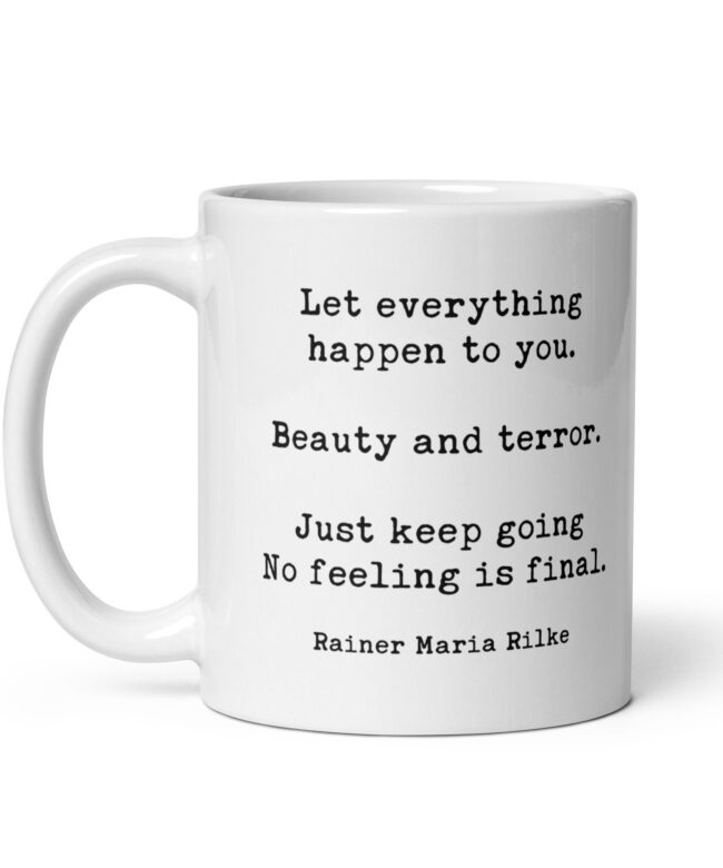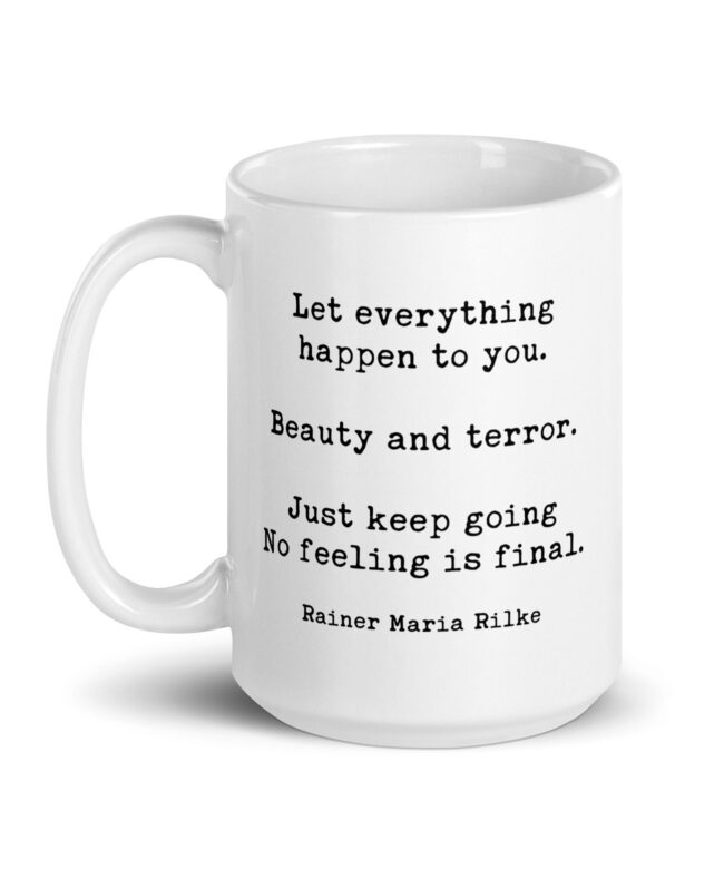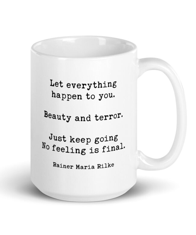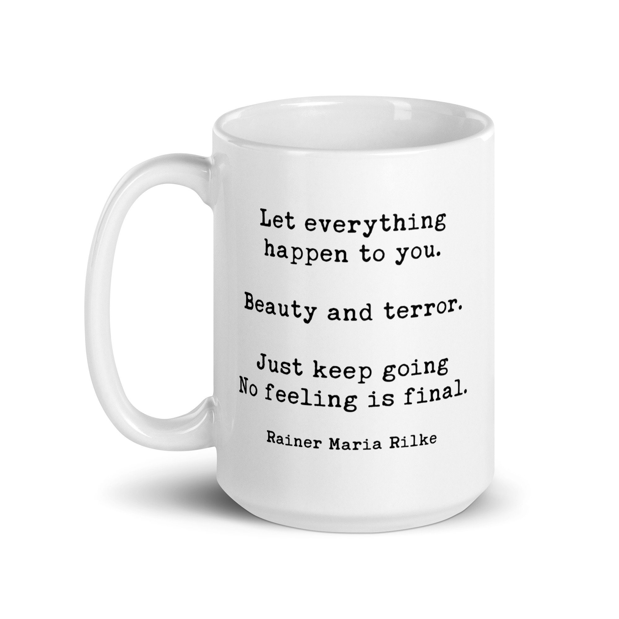 Start your day with a powerful reminder with this captivating ceramic coffee mug featuring the evocative words of Rainer Maria Rilke: