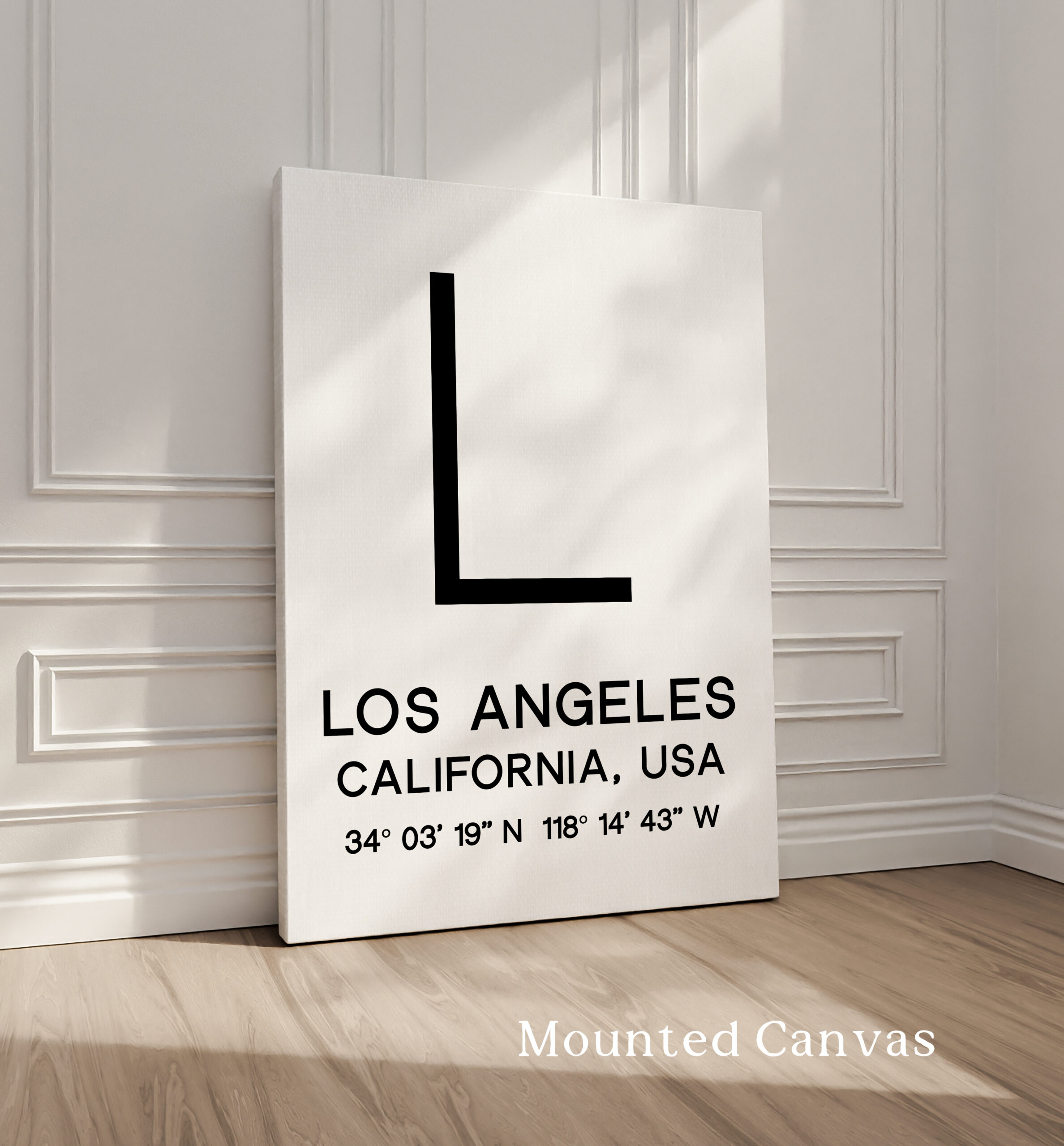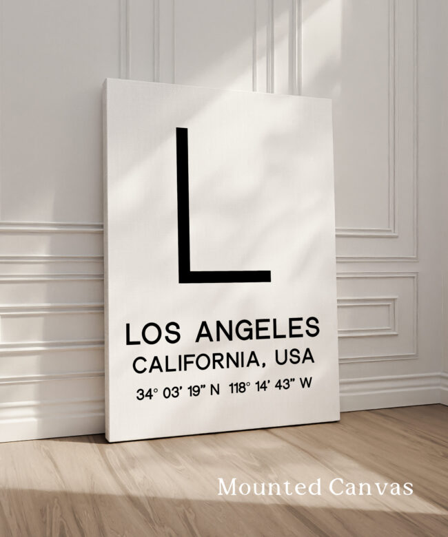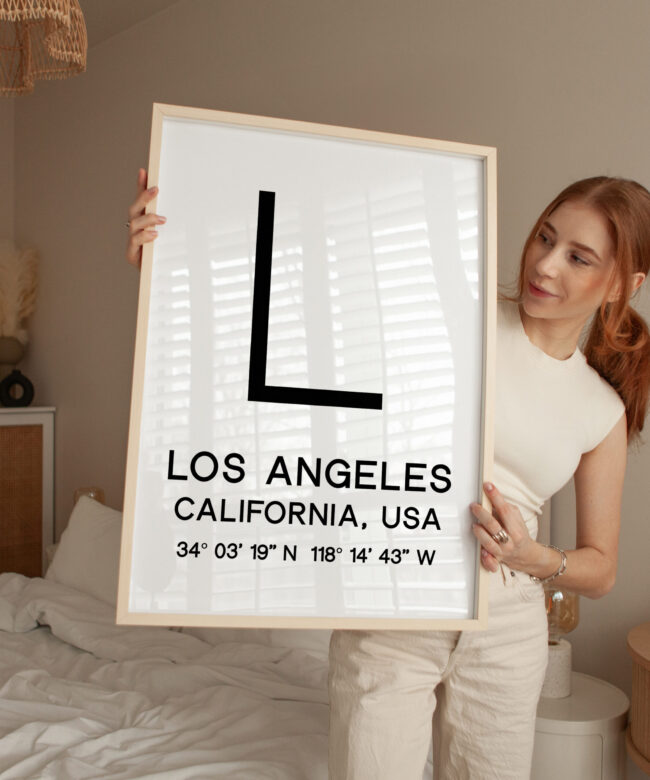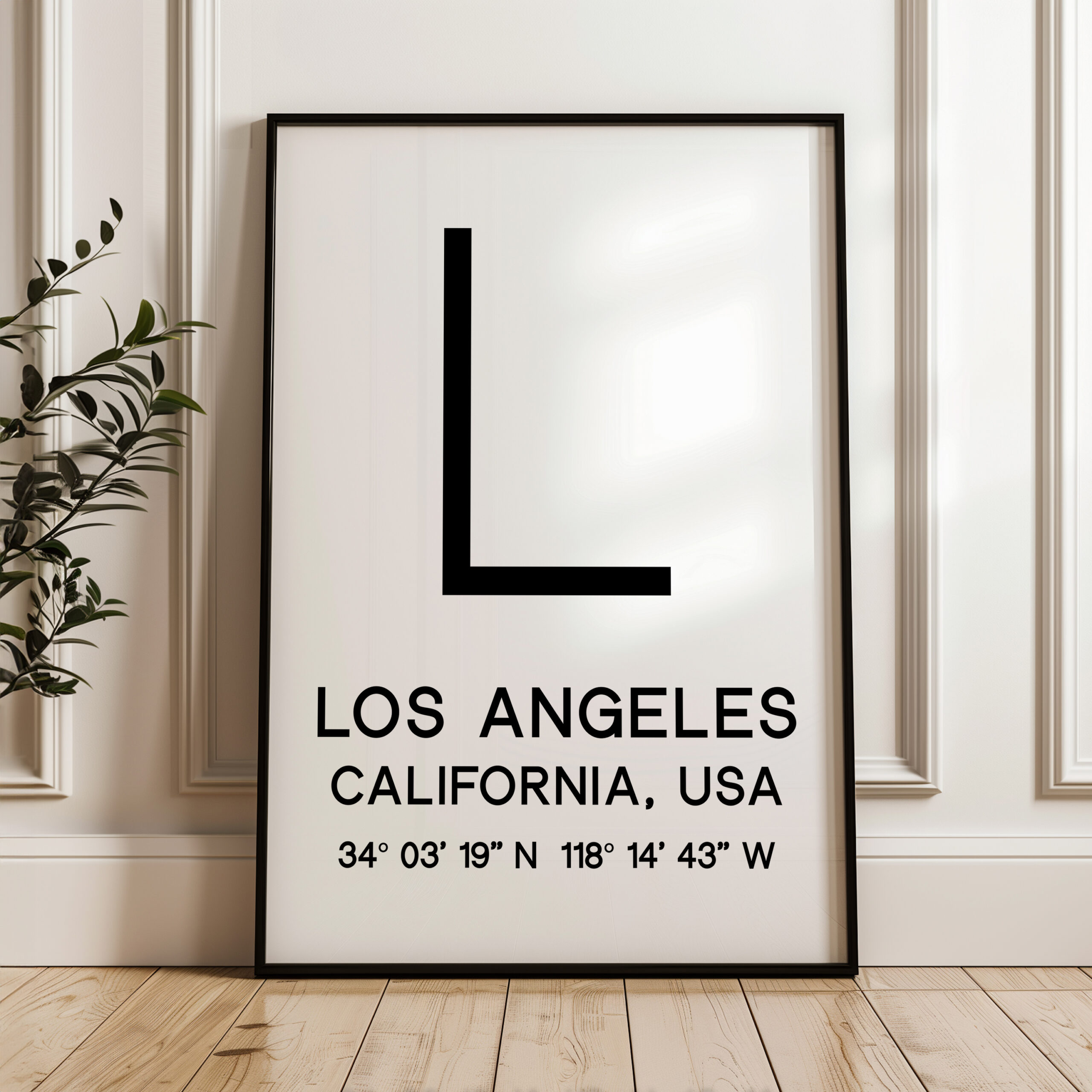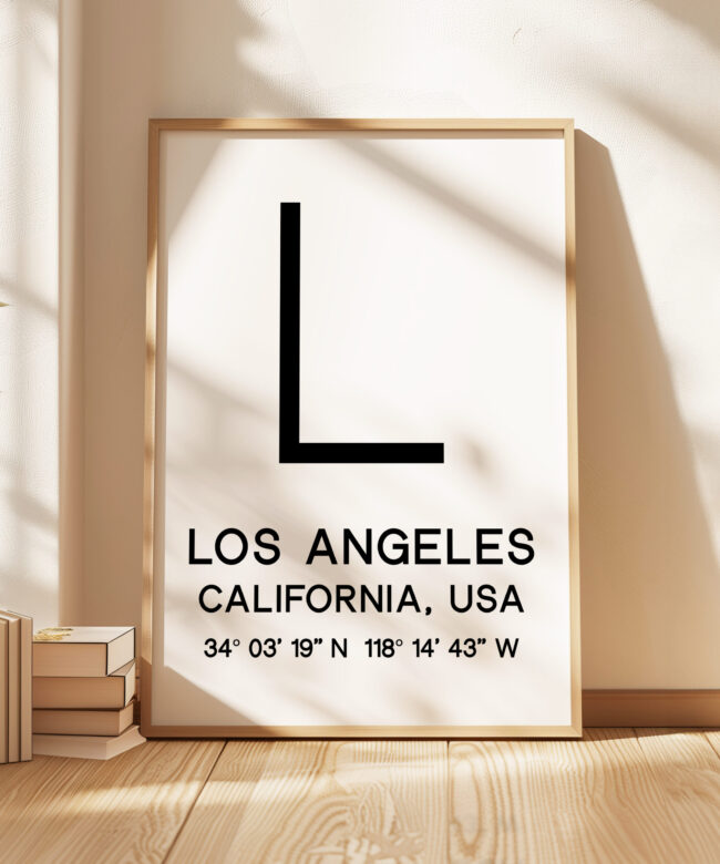 Showcase your love for the City of Angels with this elegant Typography Art Print. The minimalist design showcases the letter “L” alongside the geographic coordinates “34° 03′ 19″ N 118° 14′ 43″ W”, capturing the essence of Los Angeles in a modern and visually striking way. This artwork serves as a timeless and versatile addition to any space, whether in your home, office, or as a thoughtful gift for those with a connection to this dynamic metropolis. Embrace the energy and allure of Los Angeles with this sophisticated and stylish piece.