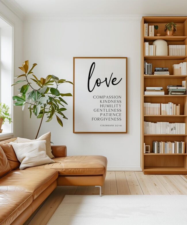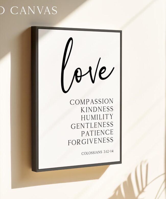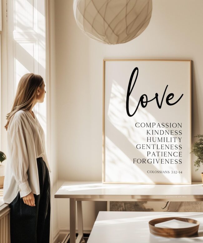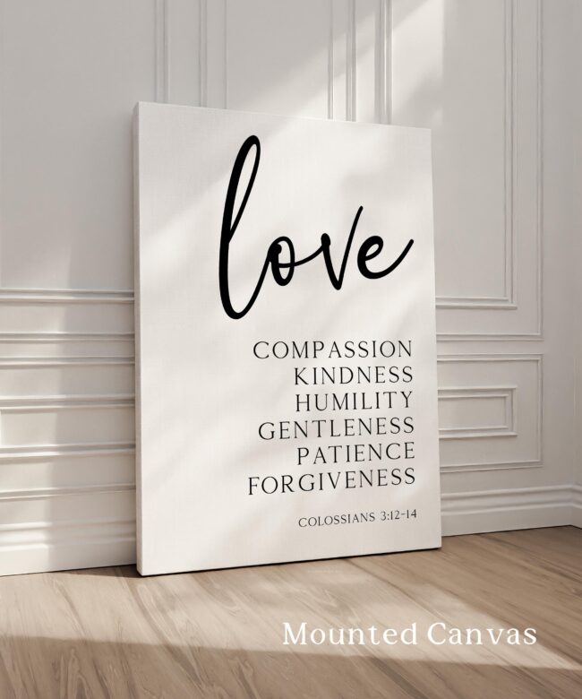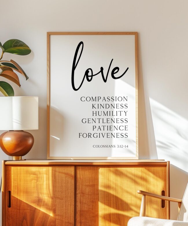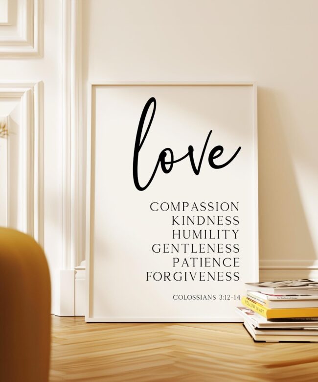 This minimalist typography art print beautifully captures the spirit of Colossians 3:12–14, listing virtues like compassion, kindness, humility, and love. With its clean design and inspiring message, it serves as a gentle daily reminder to live with grace and purpose. Makes a wonderful gift for weddings, baptisms, confirmations, or housewarmings—especially for those who value faith and character.