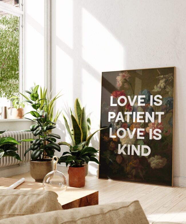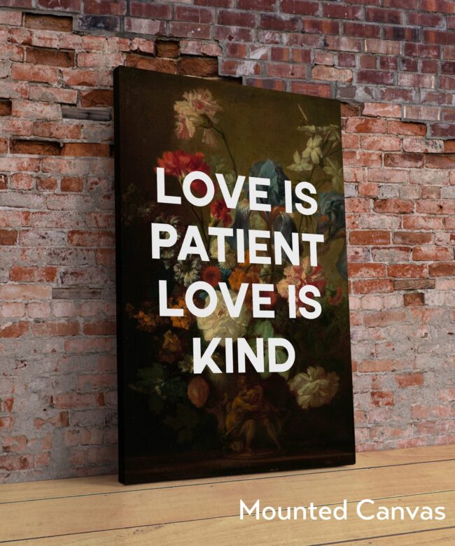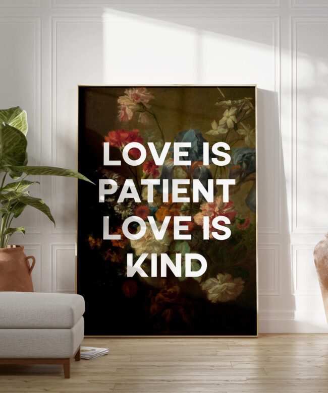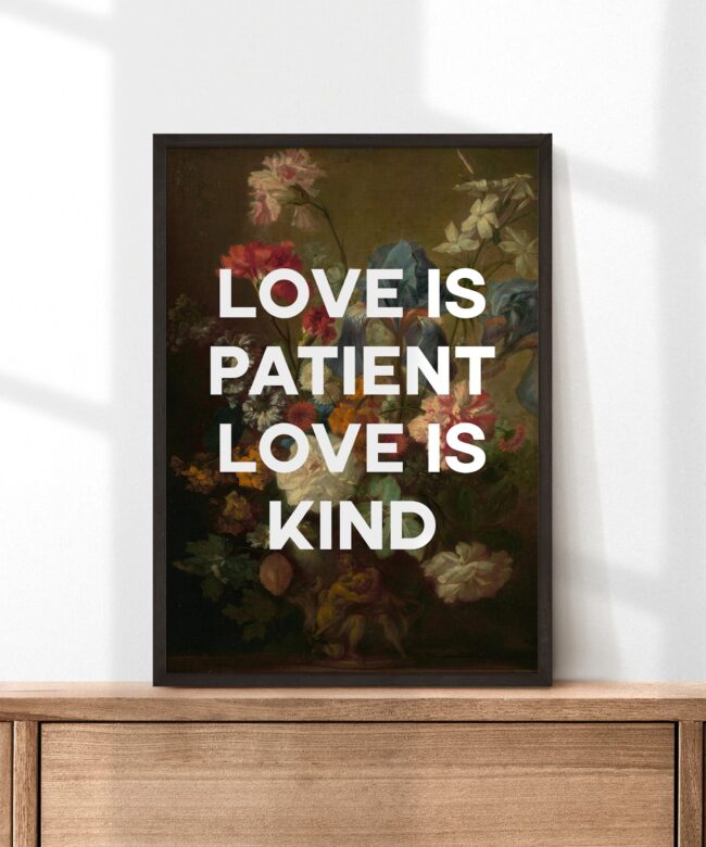 Celebrate the enduring beauty of love with this captivating typography art print. Featuring the timeless sentiment “Love Is Patient, Love Is Kind” intertwined with a stunning reproduction of flowers by the Dutch Golden Age master Jan van Huysum, this piece transcends words to create a visual testament to love’s enduring qualities.