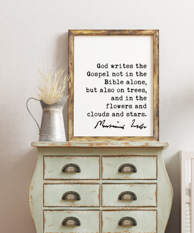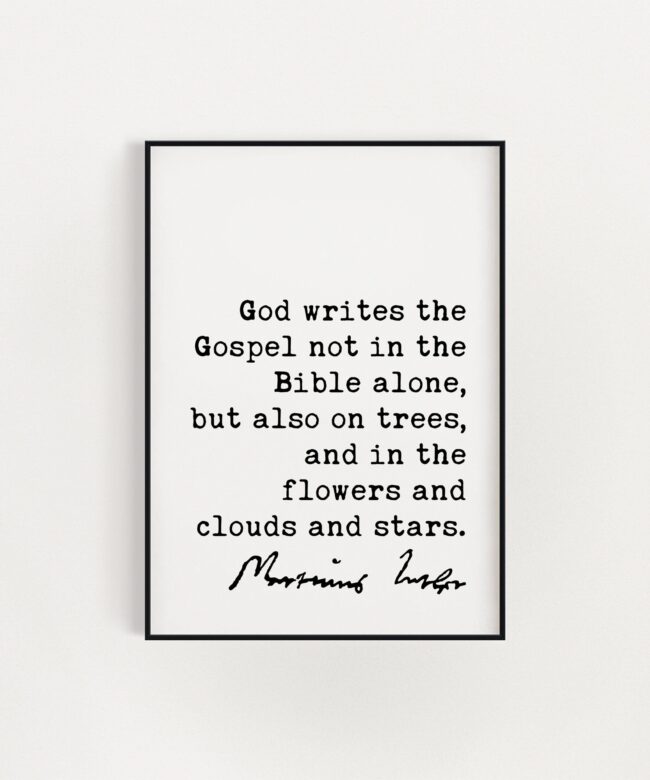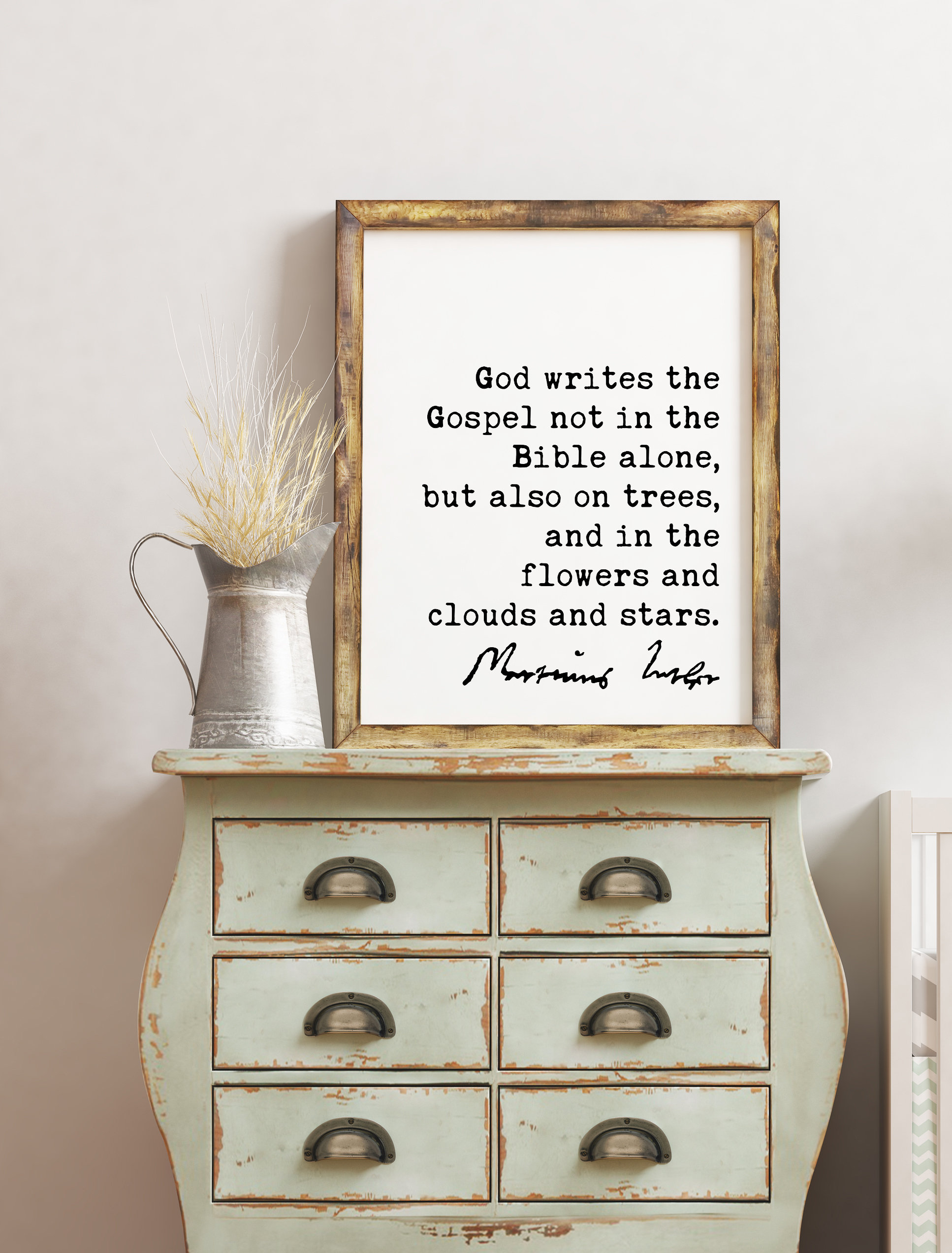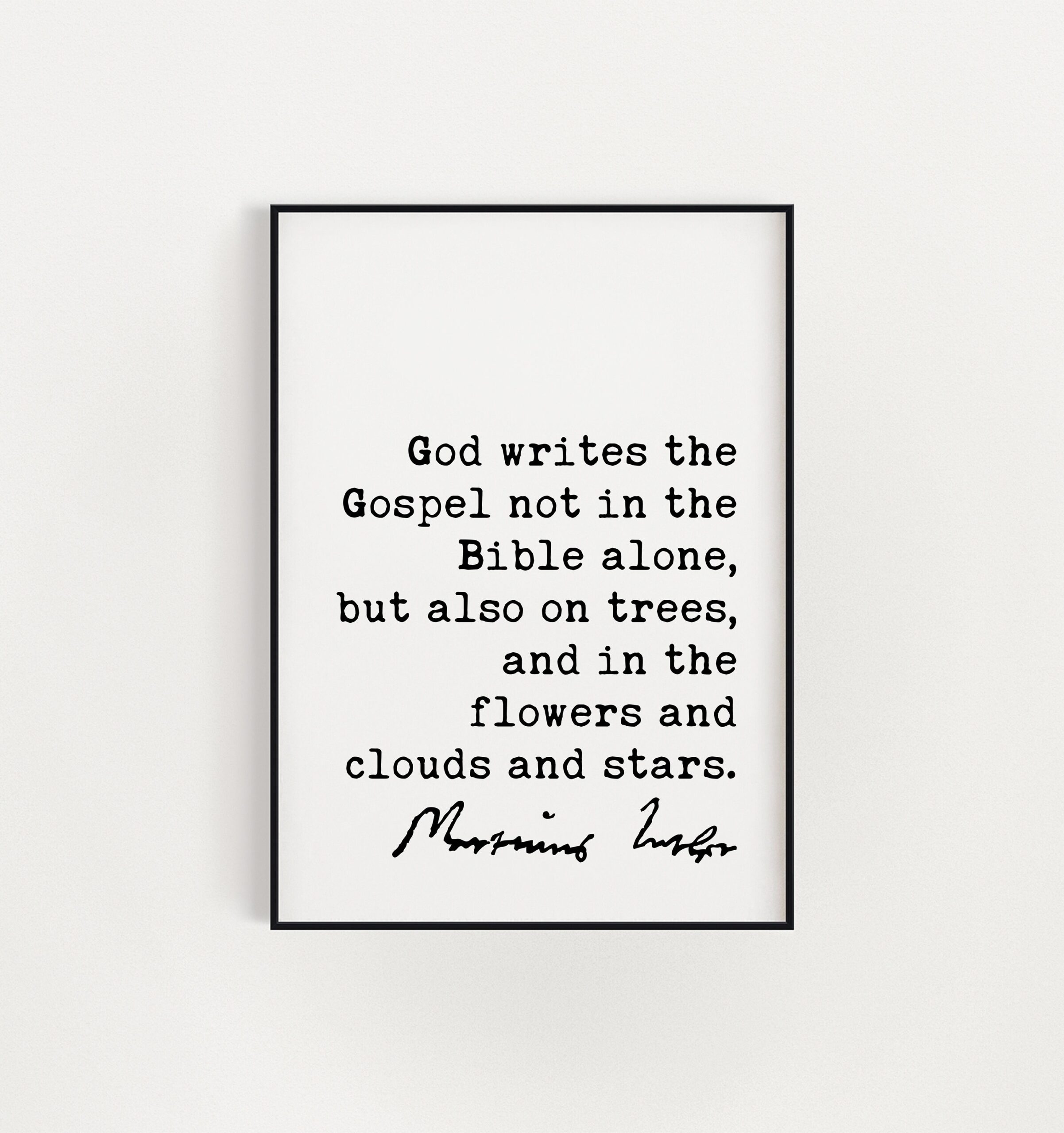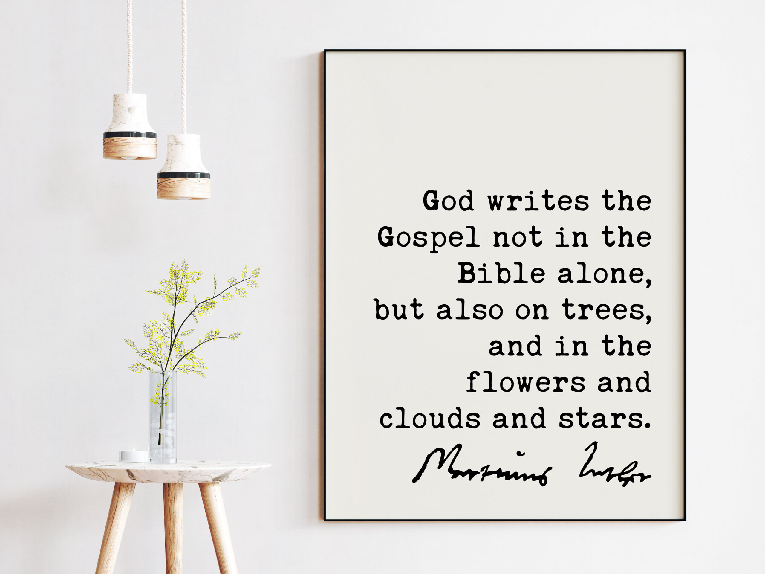 Martin Luther Quote God writes the Gospel not in the Bible alone, but also on trees, and in the flowers and clouds and stars. Art Print