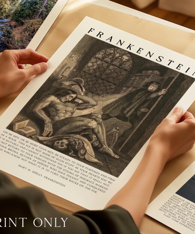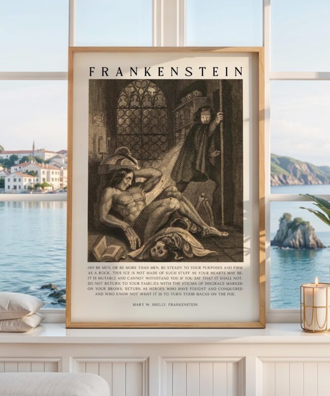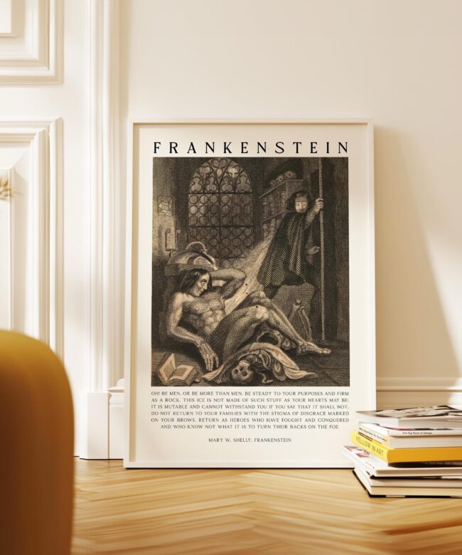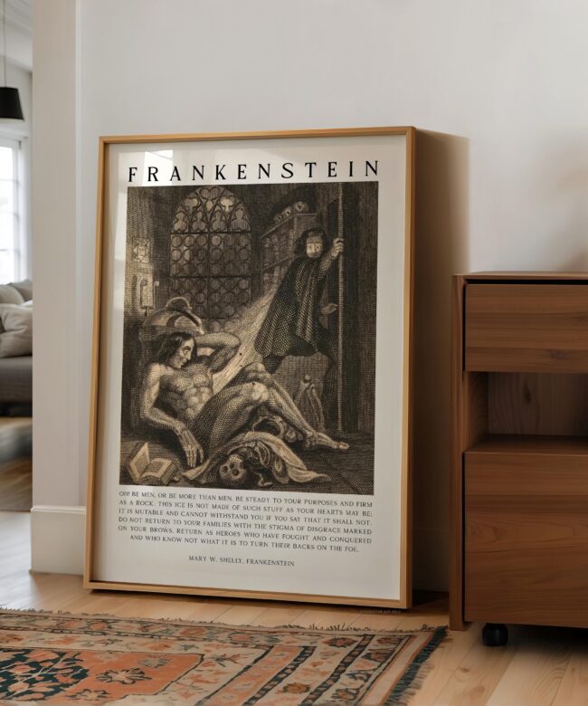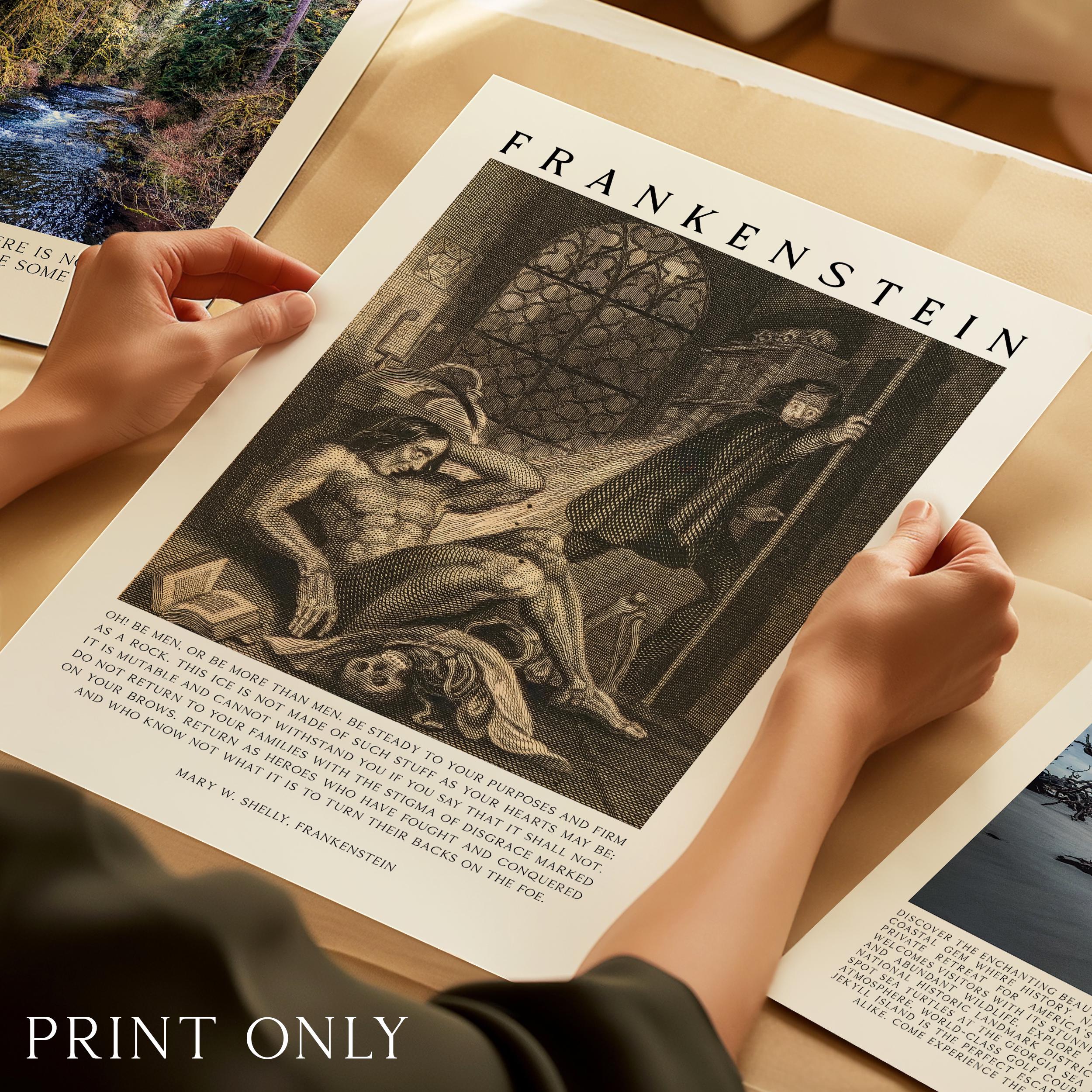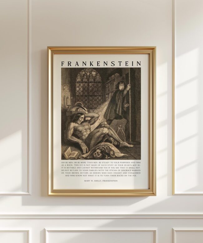 This elegant typography print pairs an 1831 Frankenstein engraving by W. Chevalier with one of the novel’s most evocative excerpts. Both powerful and poetic, it reflects Mary Shelley’s vision of creation, courage, and the human spirit. Printed with crisp, timeless typography, it’s a stunning addition to any home.
