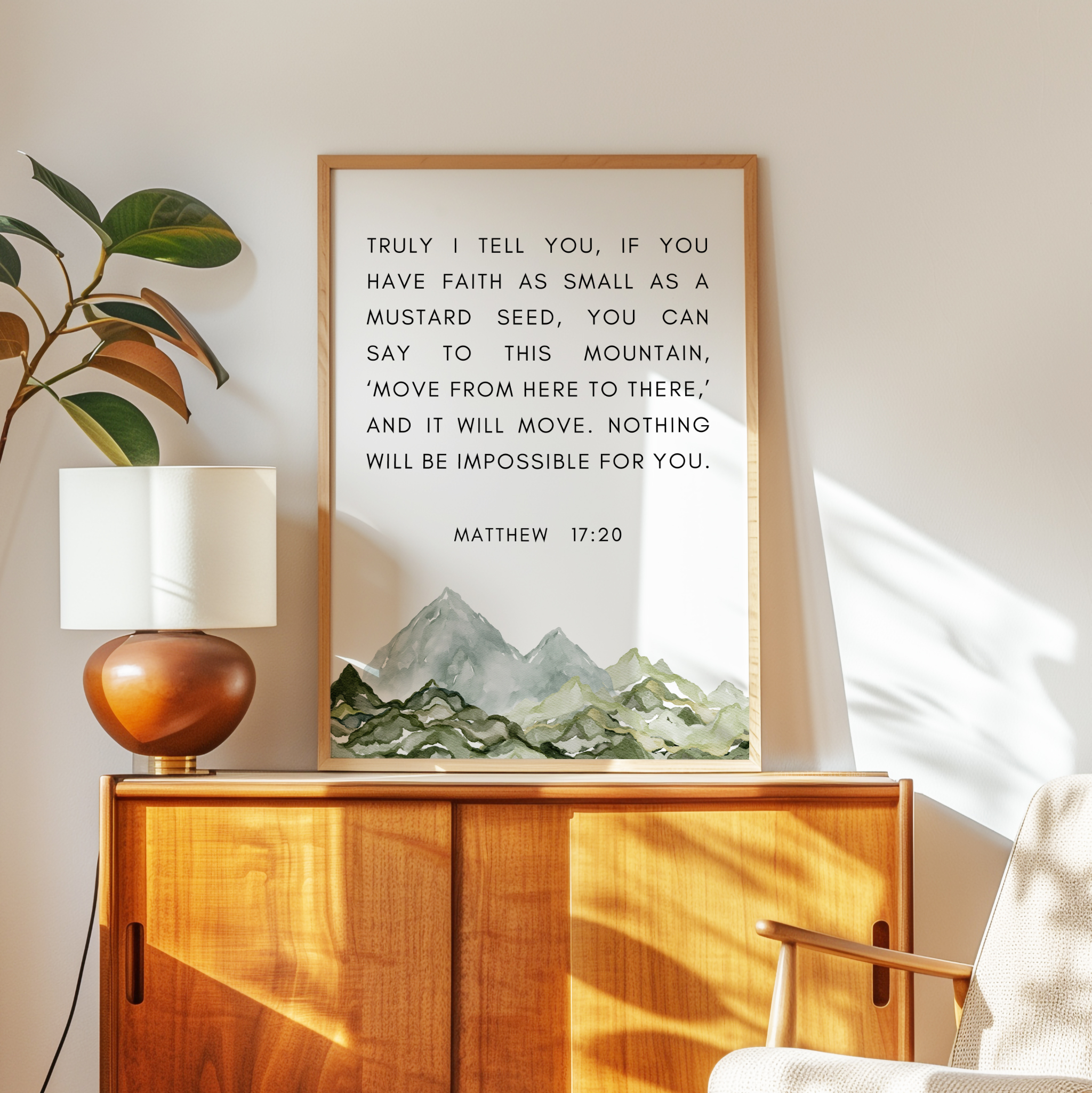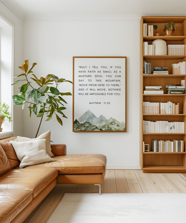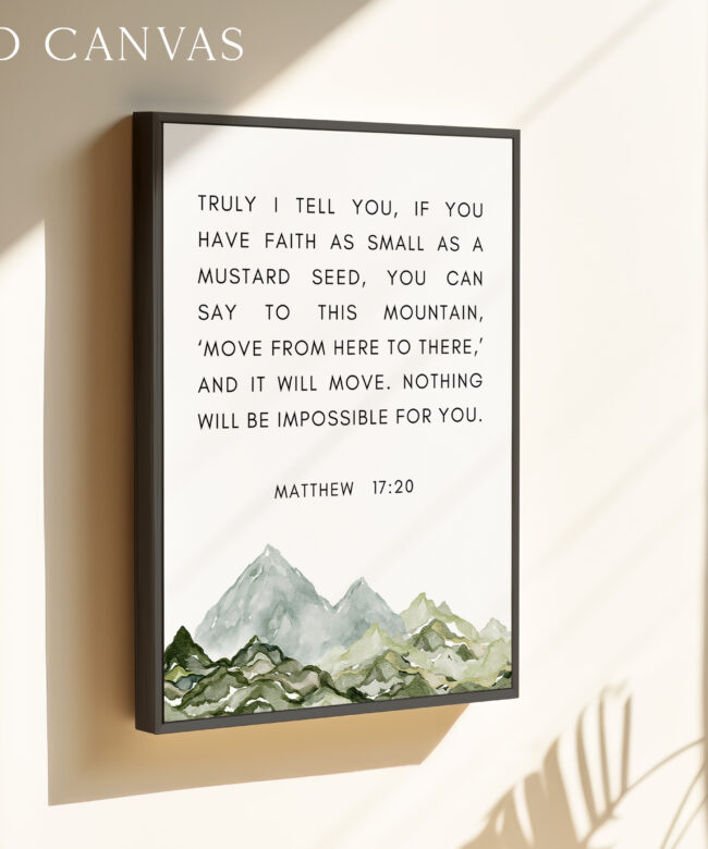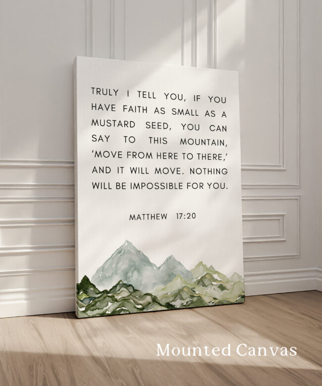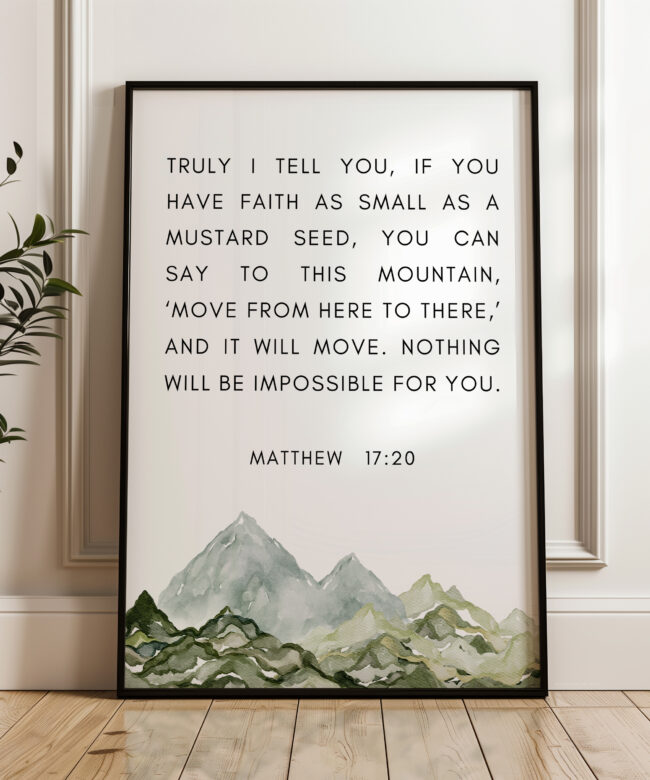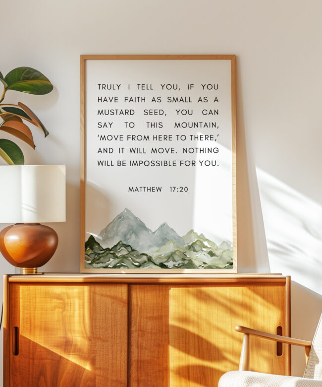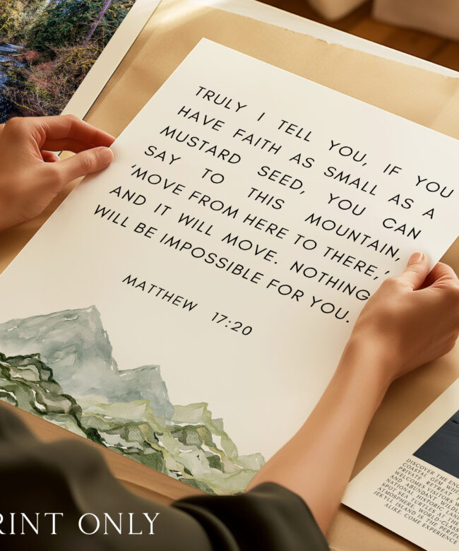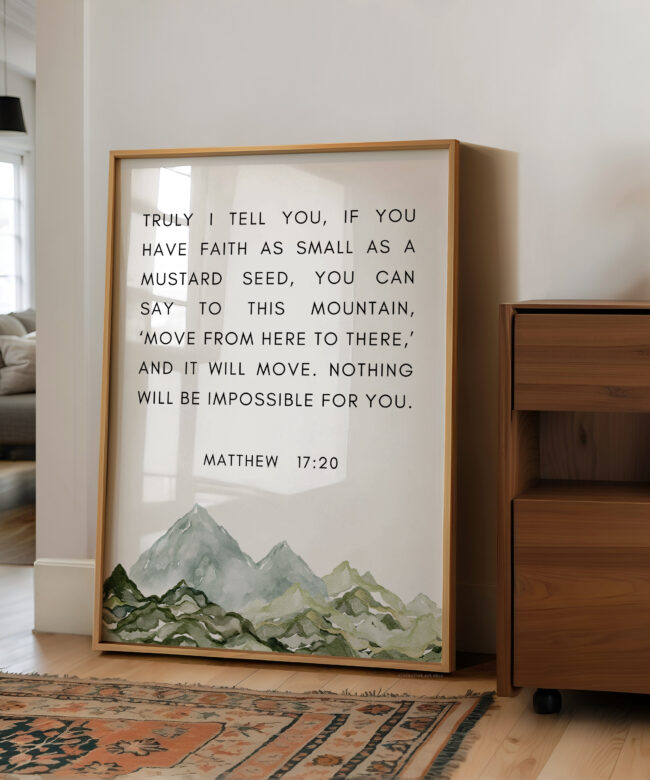 This uplifting typography art print features the powerful words of Matthew 17:20, reminding us that even the smallest measure of faith can move mountains. Paired with a soft watercolor mountain illustration, this piece brings encouragement and calm to any space.