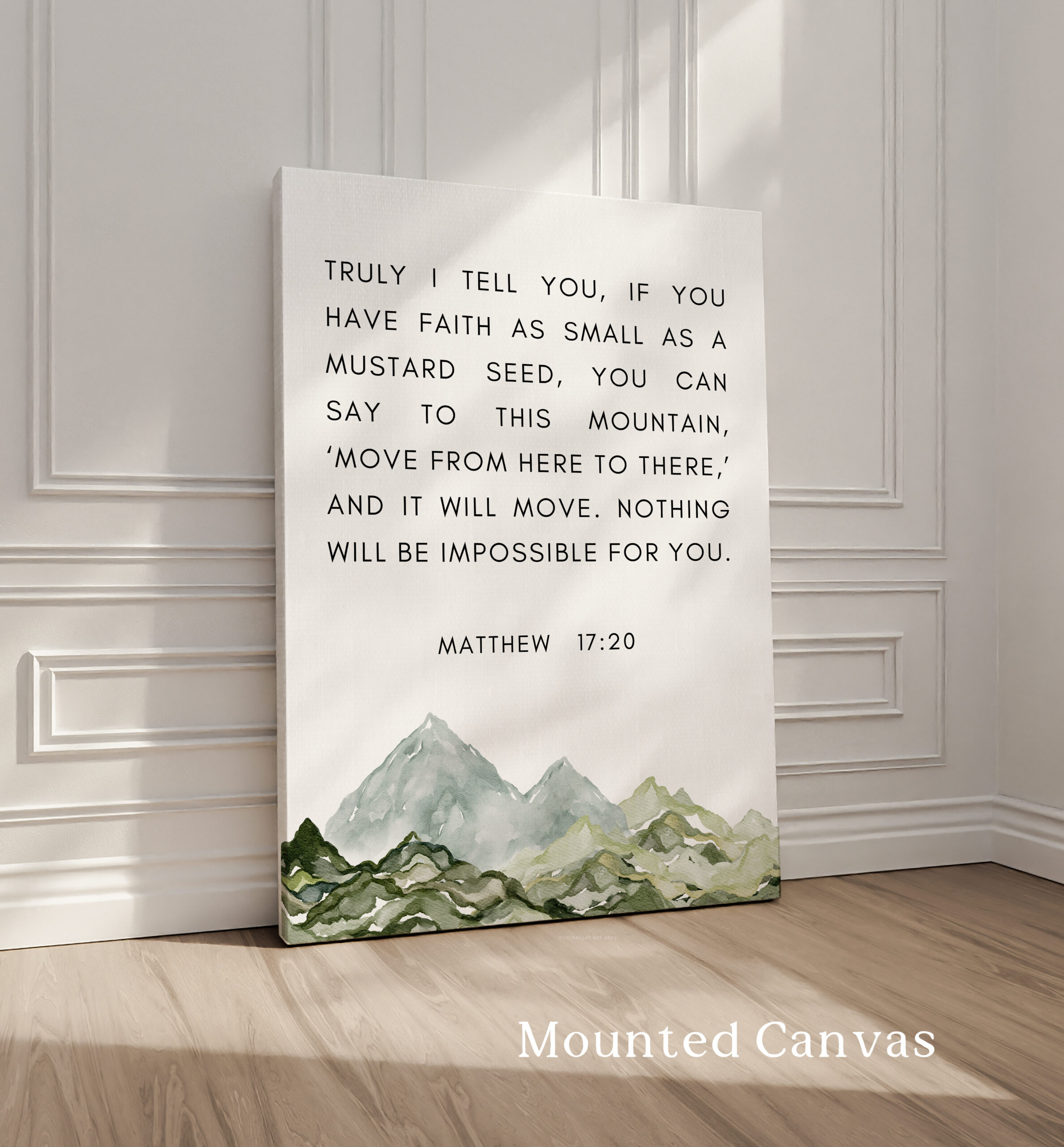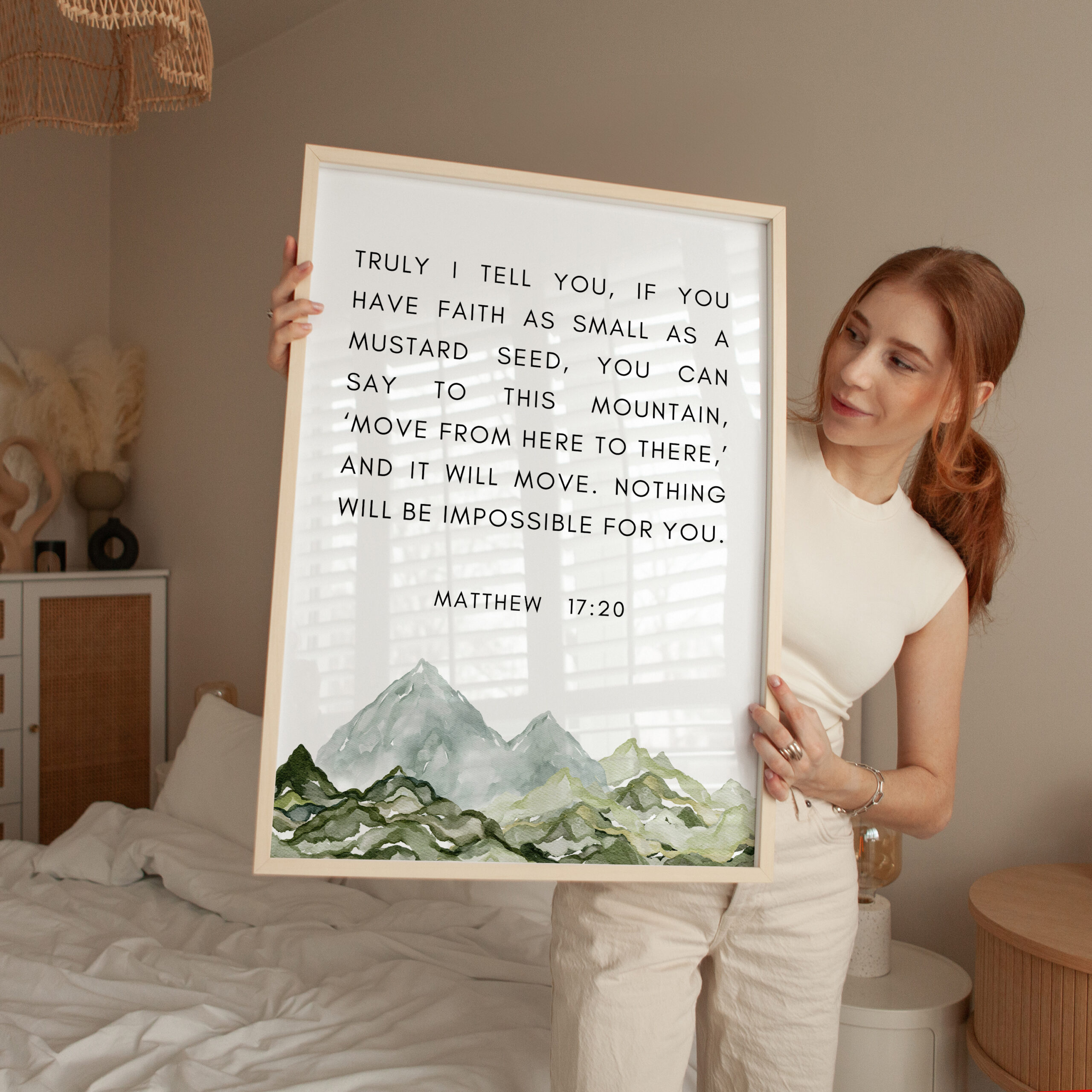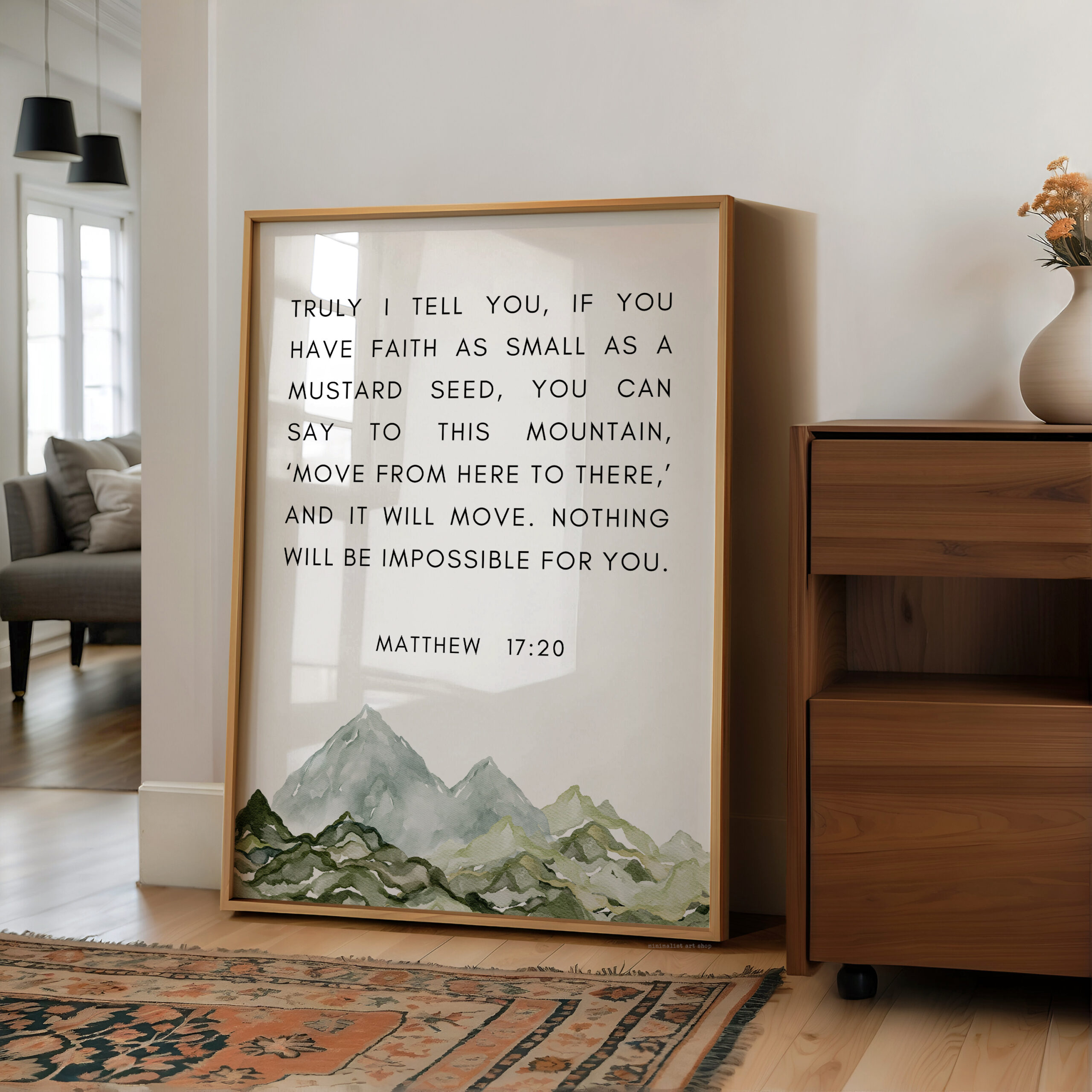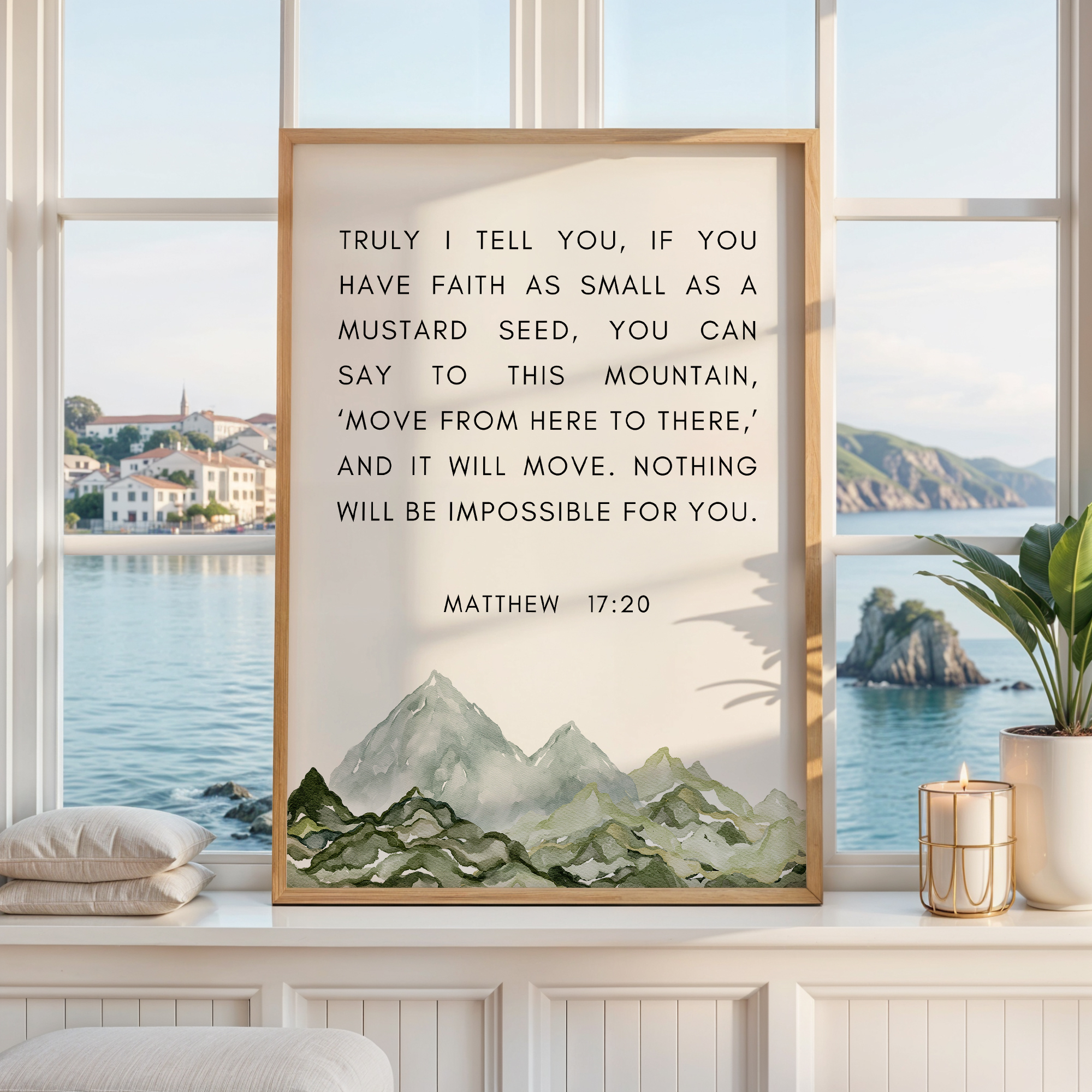 This uplifting typography art print features the powerful words of Matthew 17:20, reminding us that even the smallest measure of faith can move mountains. Paired with a soft watercolor mountain illustration, this piece brings encouragement and calm to any space.