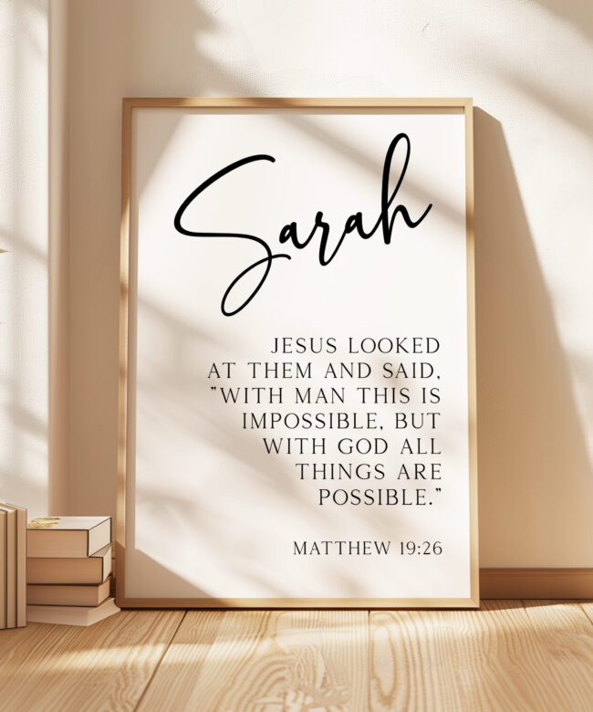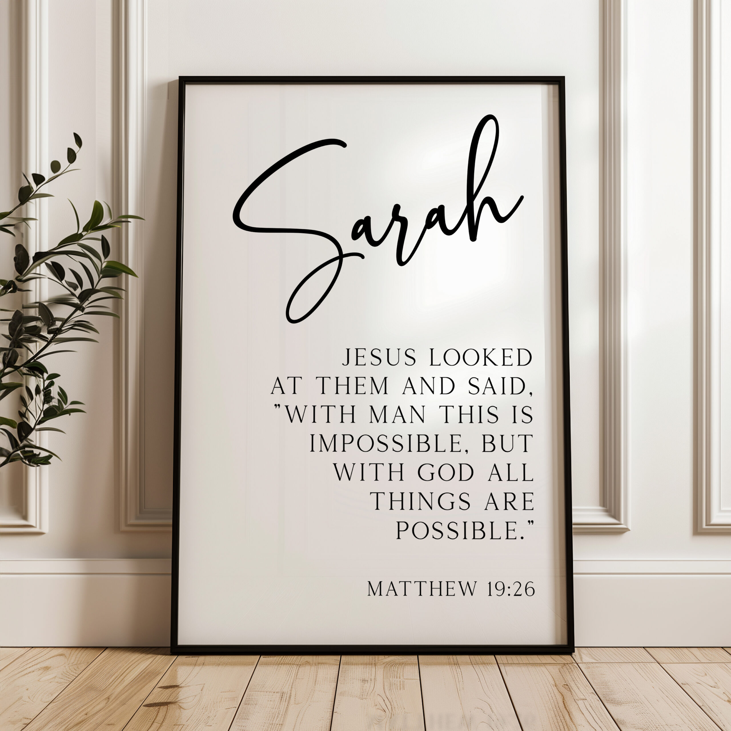Add a touch of faith and inspiration to your home with this beautiful typography print featuring Matthew 19:26: “With man this is impossible, but with God all things are possible.” Customized with your name or a loved one’s name in elegant script, this piece serves as a daily reminder of the power of faith. A perfect addition to any Christian home, prayer space, or gift for a special occasion.