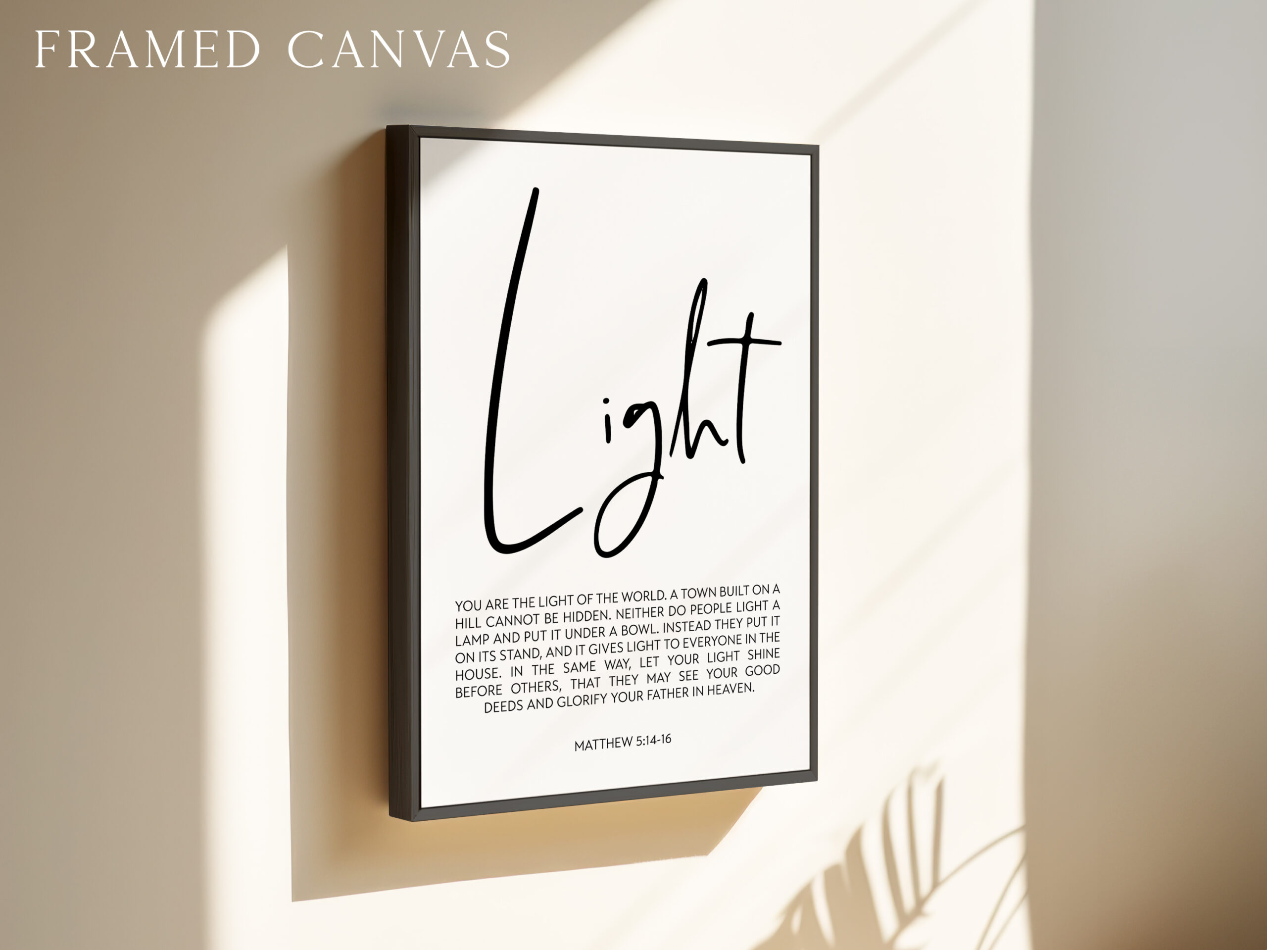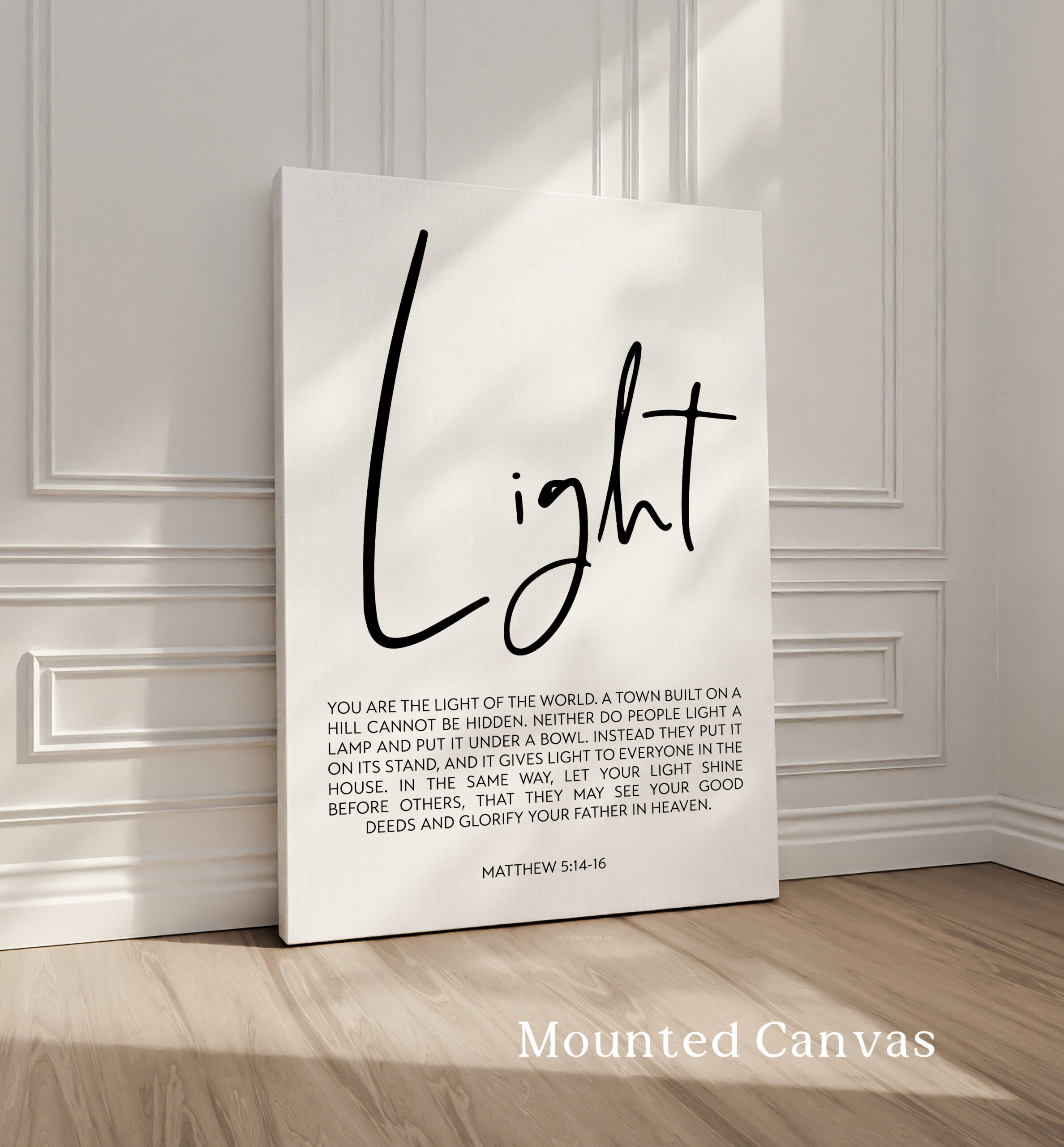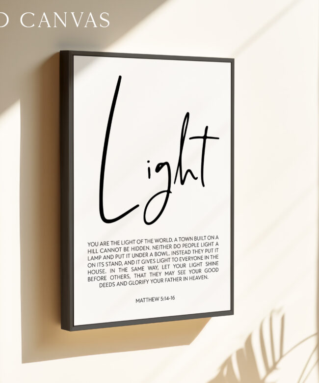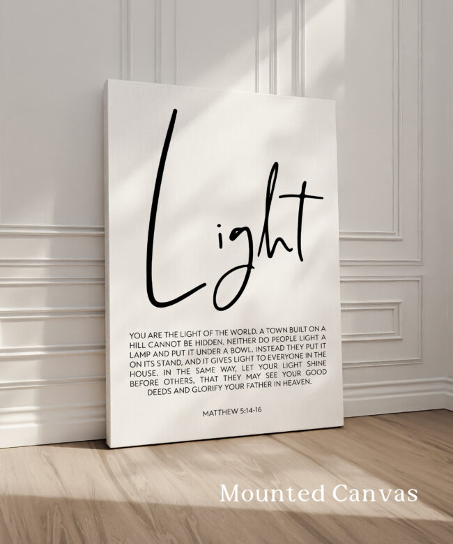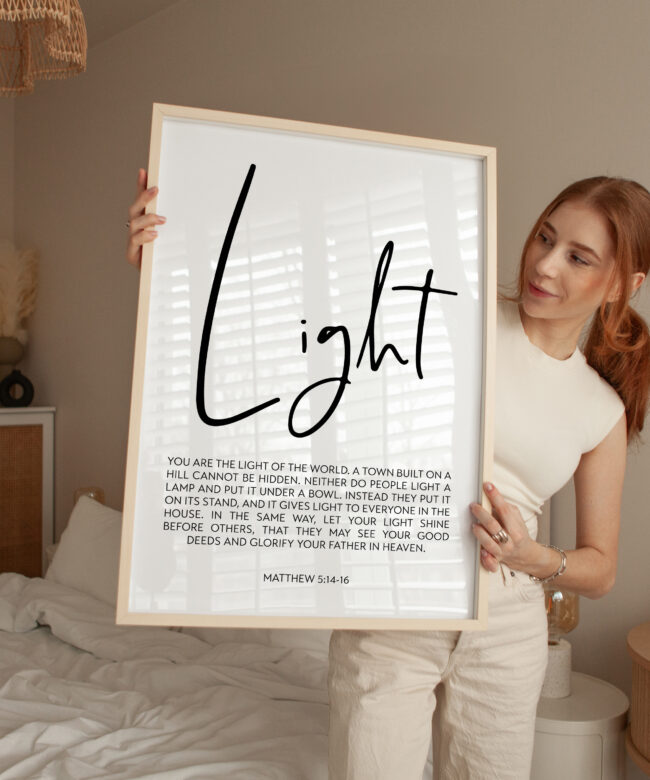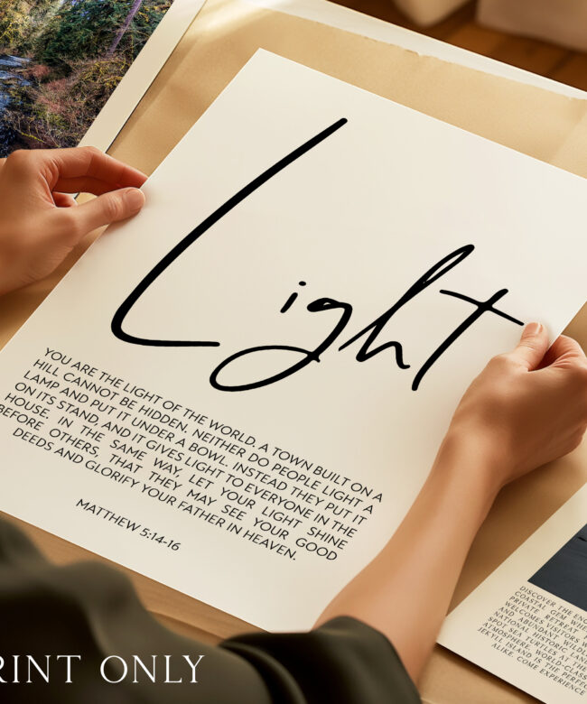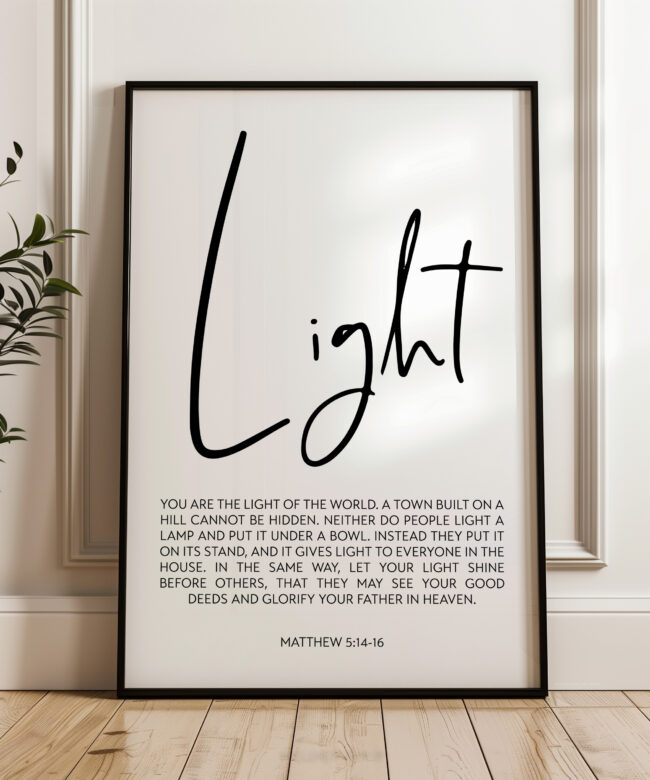 This elegant typography art print centers on the word “Light”, paired with the timeless scripture from Matthew 5:14–16. The flowing hand-lettered design and clean layout create a calm yet powerful statement, reminding us to live openly and shine with purpose.