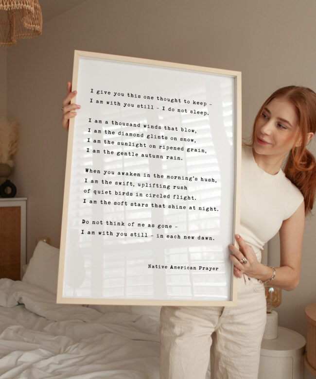 This Typography Art Print features a heartfelt Native American prayer that speaks of eternal love and presence. “I am with you still – I do not sleep,” the prayer reminds us that the spirit of a loved one is never truly gone. The powerful words are beautifully crafted into an elegant design that would be a meaningful addition to any home, meditation space, or memorial area. This art print evokes peace, remembrance, and connection, making it an ideal gift for those experiencing loss or anyone who finds comfort in spiritual affirmations.