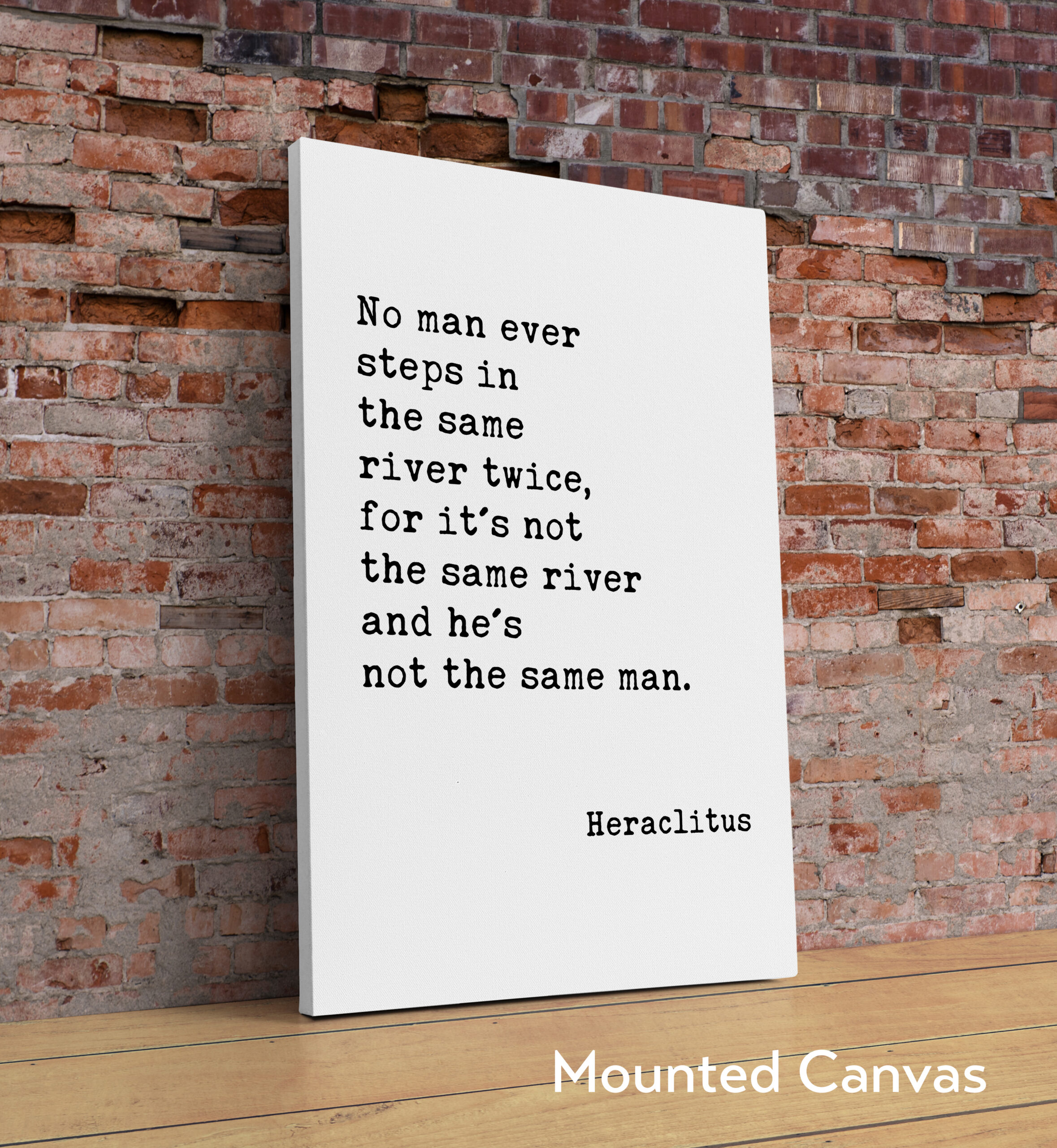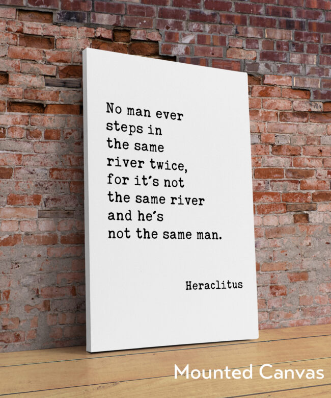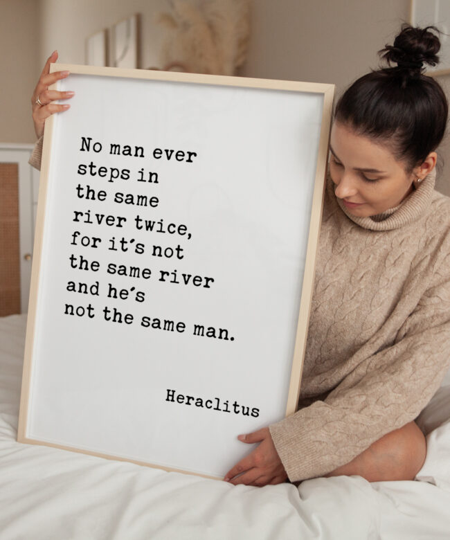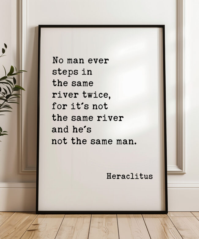 The profound quote, “No man ever steps in the same river twice, for it’s not the same river and he’s not the same man,” is displayed in a typewriter font. This powerful statement prompts reflection on the impermanence of life and the constant process of growth and transformation.