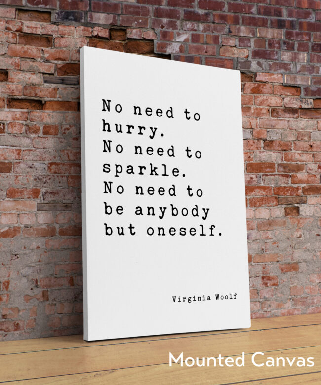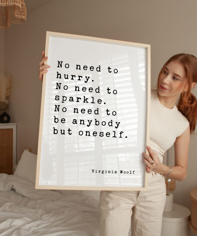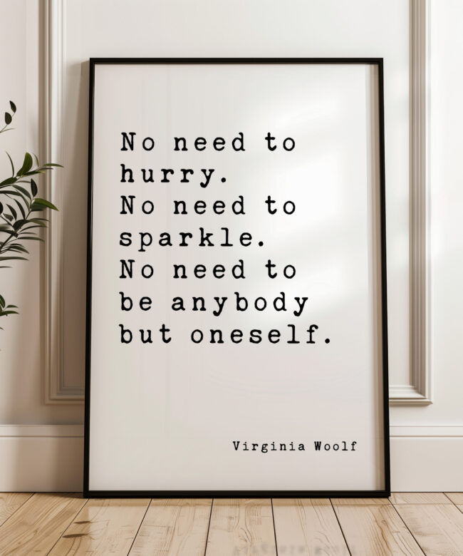 Embrace the art of self-acceptance with our stunning typography art print featuring a thoughtful quote from Virginia Woolf: “No need to hurry. No need to sparkle. No need to be anybody but oneself.” This print serves as a gentle reminder to take life at your own pace and celebrate your authentic self.
