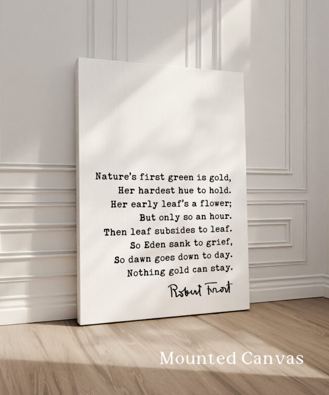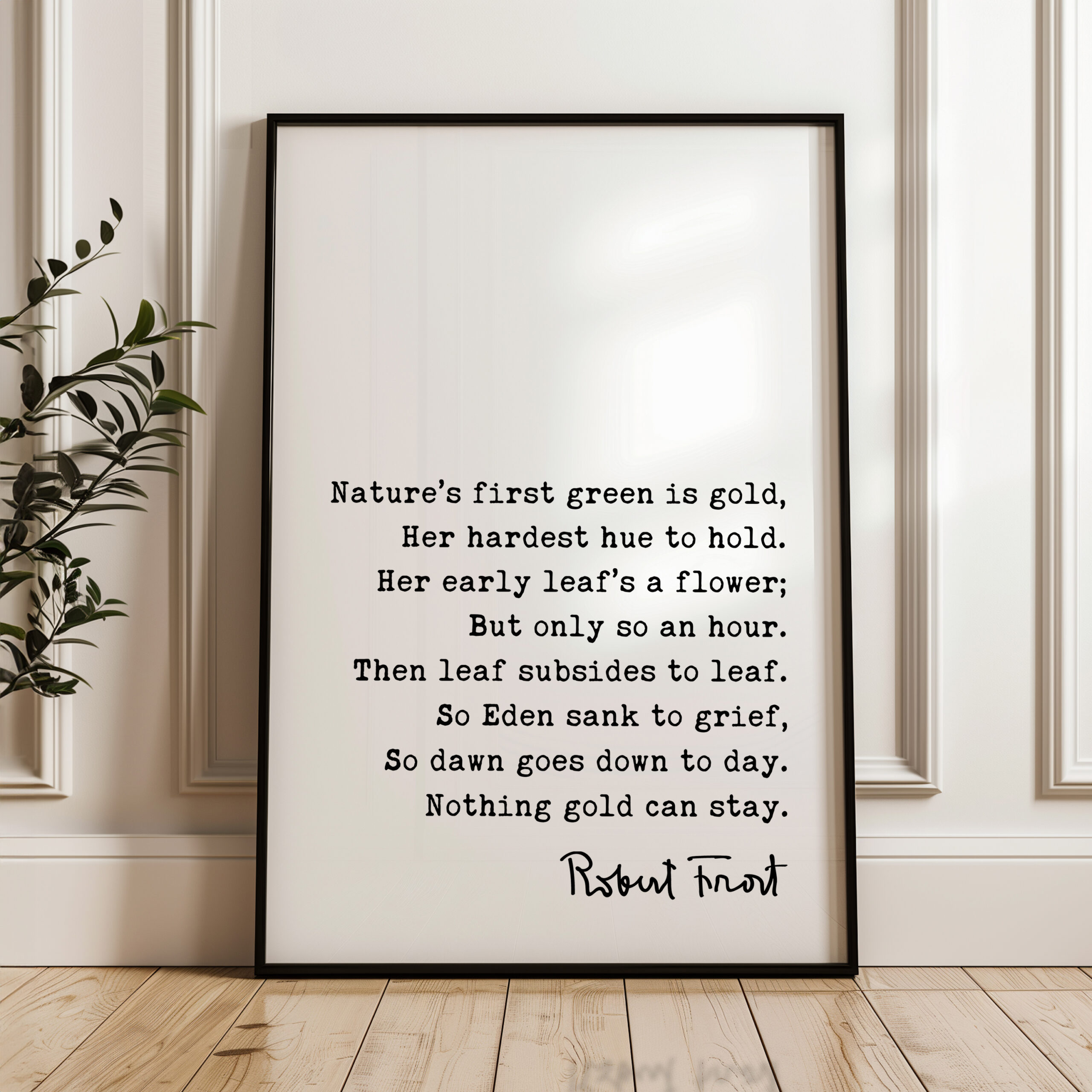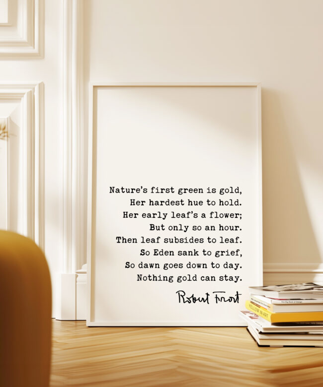 Celebrate the beauty of nature with this stunning typography art print featuring Robert Frost’s timeless words from his poem Nothing Gold Can Stay. “Nature’s first green is gold, Her hardest hue to hold”—these words speak to the fleeting beauty of life and nature. The minimalist design and profound message make it a perfect addition to any home or office space. This print is ideal for anyone who appreciates the delicate beauty of life and the natural world.