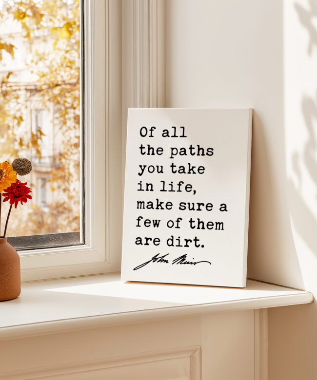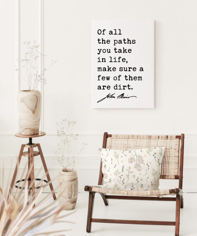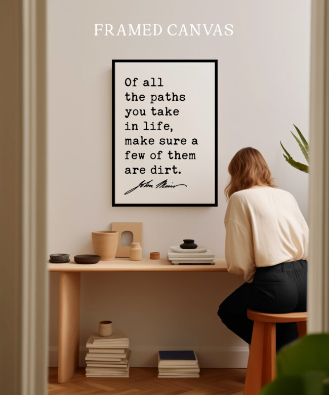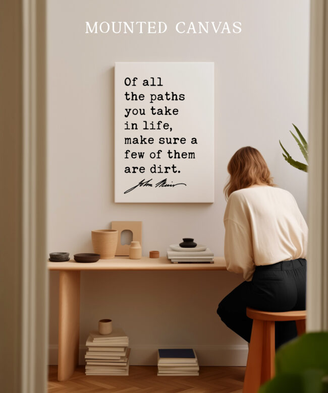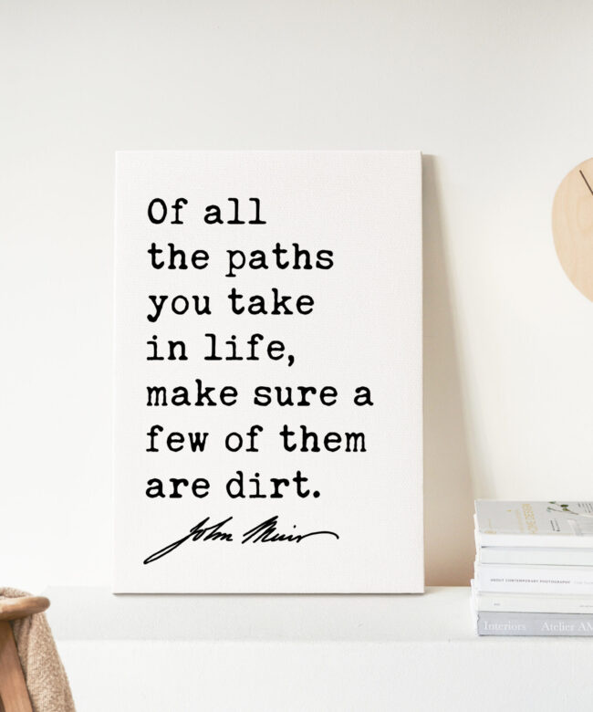 Add a touch of nature-inspired wisdom to your home with this stunning typography art print. Featuring the iconic quote from John Muir, “Of all the paths you take in life, make sure a few of them are dirt,” this piece encourages an adventurous spirit. Available in both mounted canvas and framed canvas options, it will make a beautiful addition to your living room, office, or entryway. The minimalist design and bold typography ensure that this piece stands out, while the message inspires both reflection and action.
