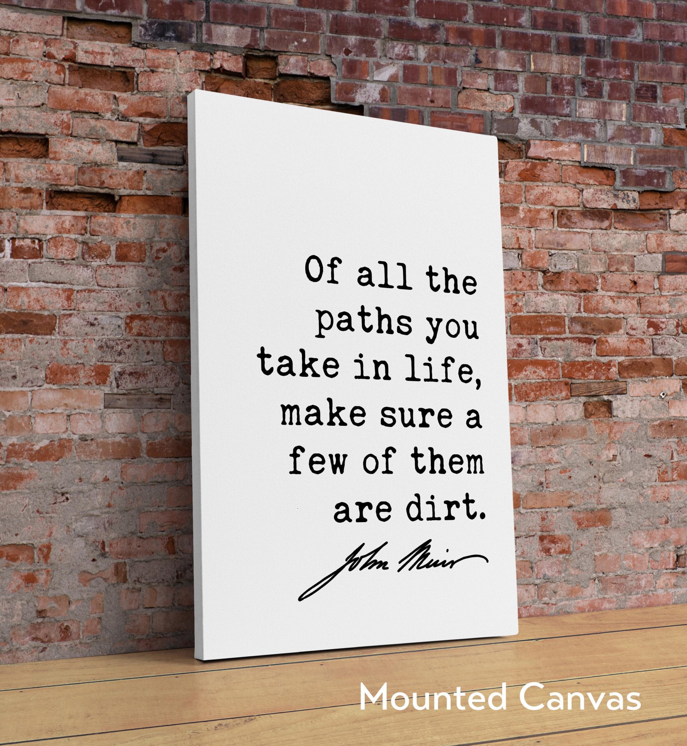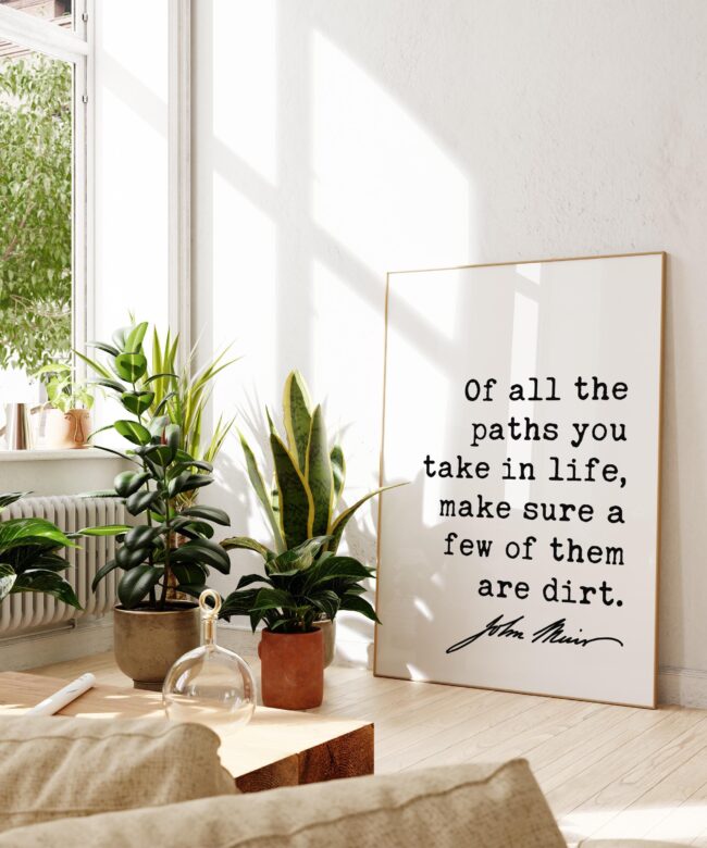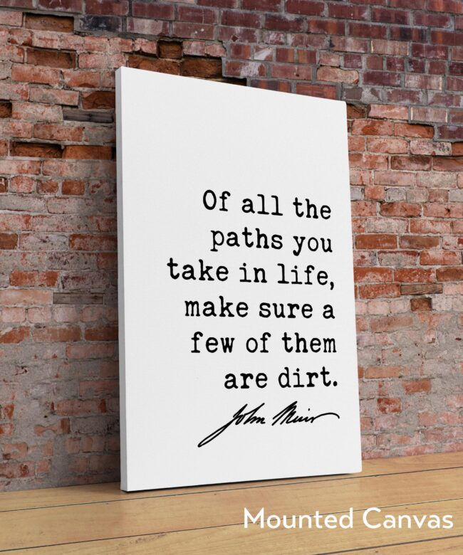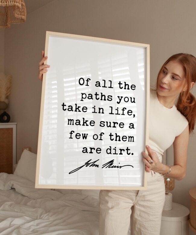 Introducing our “Of all the paths you take in life, make sure a few of them are dirt” typography art print, featuring the timeless wisdom of John Muir. This delightful art piece beautifully combines the inspirational quote with an elegant typewriter font typography to create a stunning visual display. Perfect for nature enthusiasts, adventurers, and anyone seeking a touch of wanderlust in their space. The high-quality print makes a thoughtful gift for friends and loved ones. Add a touch of inspiration to your home, office, or outdoor-themed decor with this charming art print that celebrates the joy of exploring the great outdoors.