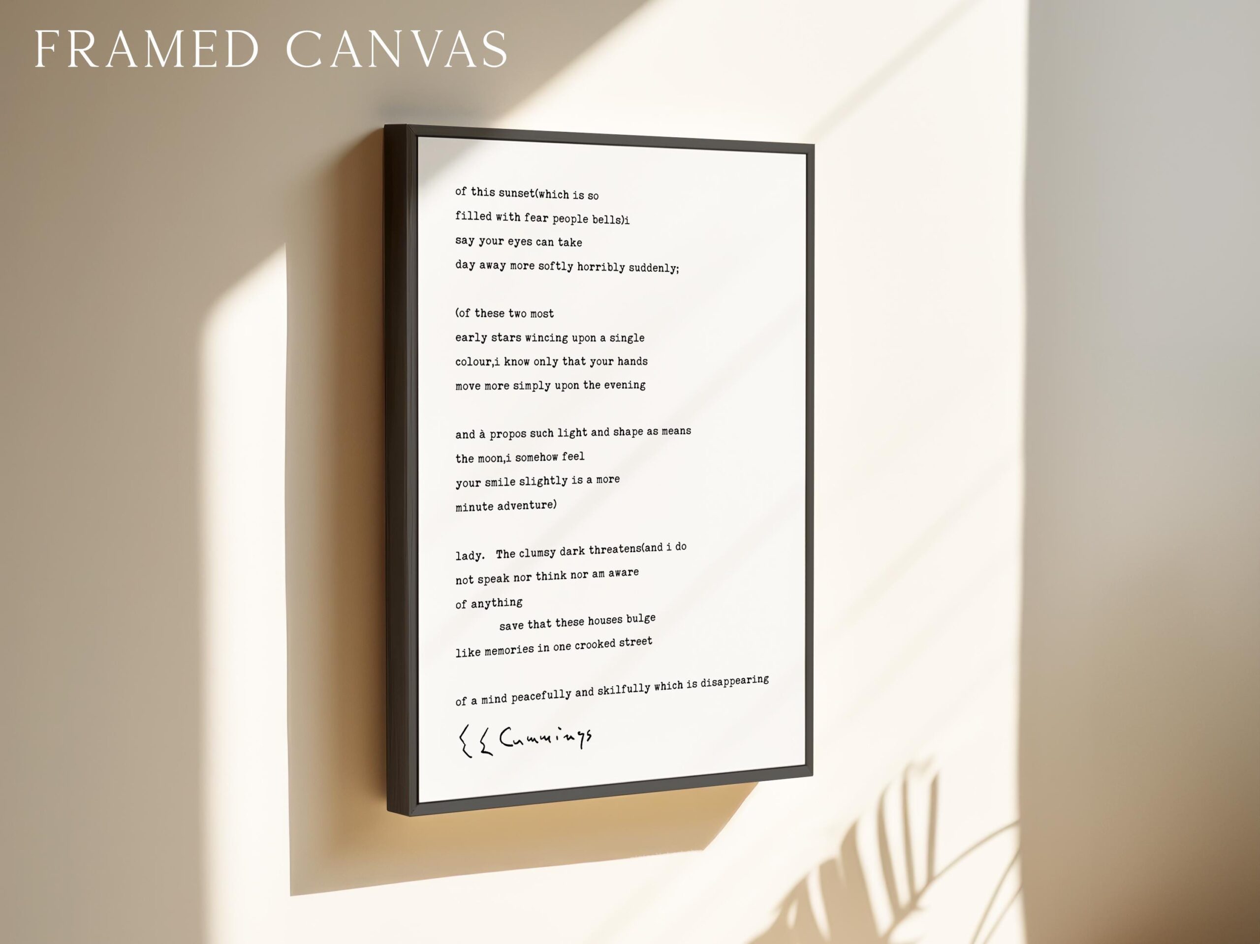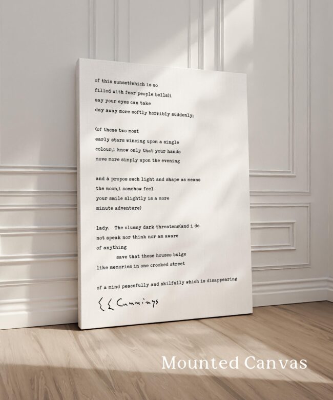 Bring the brilliance of modernist poetry into your home with this typography art print featuring E. E. Cummings’ “of this sunset” from his 1925 collection “&.” Makes a meaningful gift for poetry lovers, artists, and dreamers who cherish the romance and depth of classic literature.