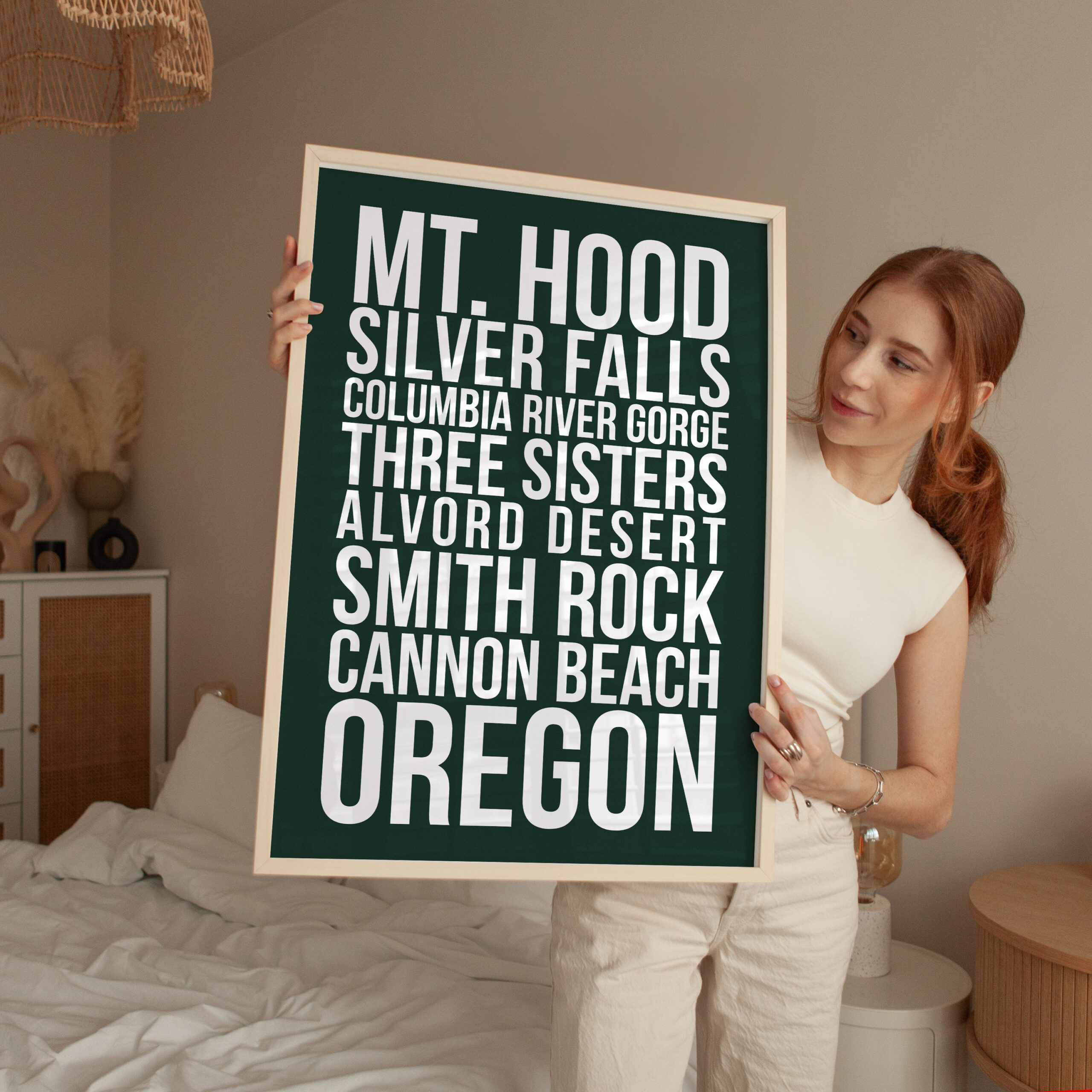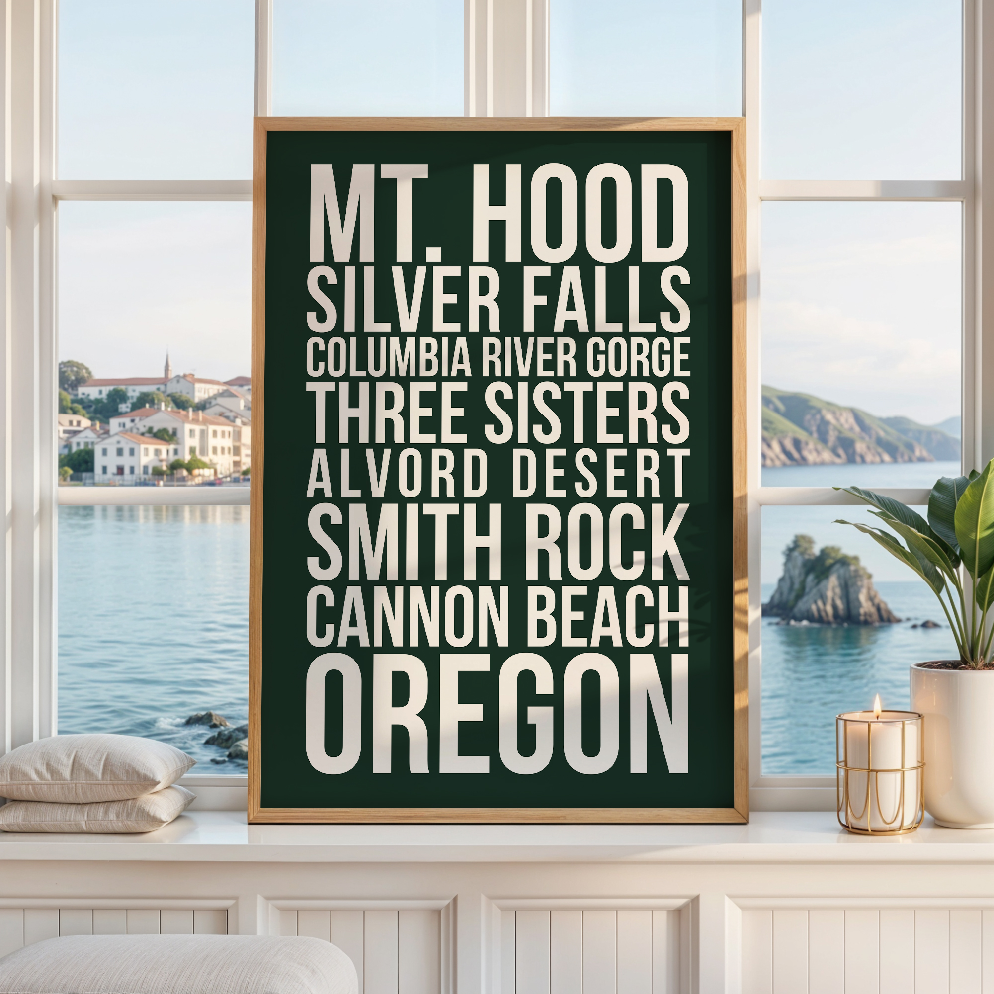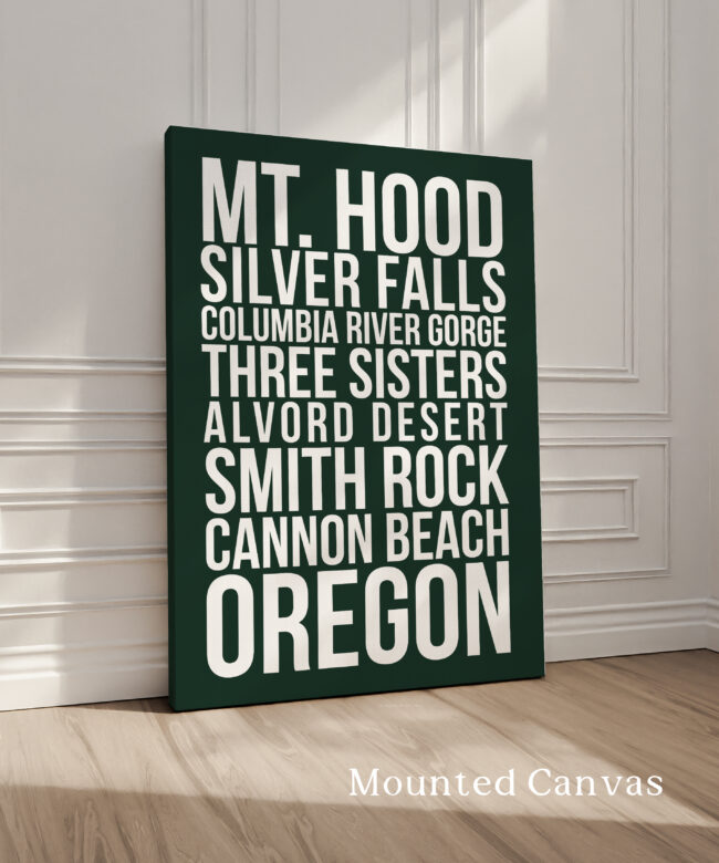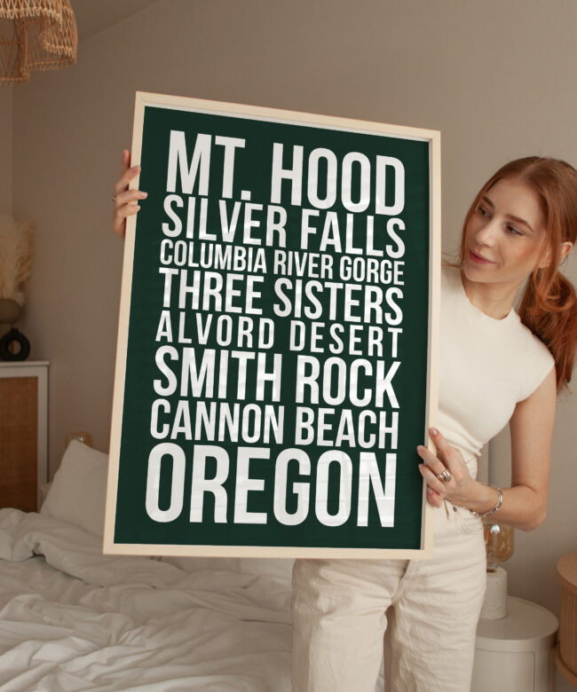 Celebrate the beauty of the Pacific Northwest with this bold Oregon typography wall art print, featuring some of the state’s most iconic destinations: Mt. Hood, Silver Falls, Columbia River Gorge, Three Sisters, Alvord Desert, Smith Rock, and Cannon Beach.