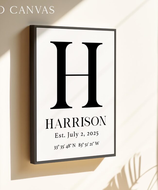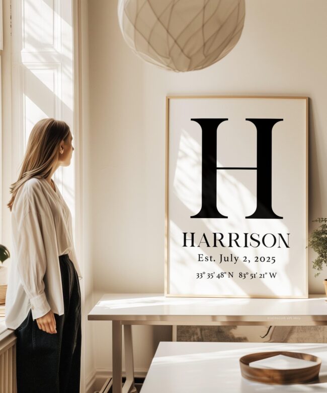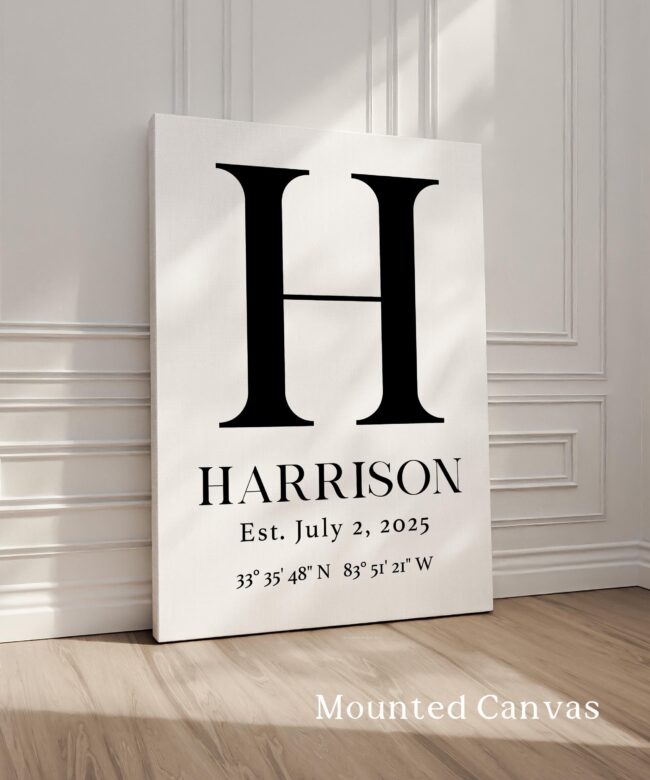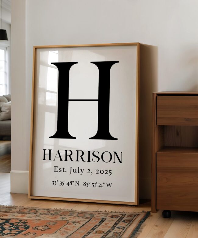 Celebrate the story of your family with this elegant personalized monogram print. Featuring your family’s initial, surname, special establishment date, and the meaningful GPS coordinates of your home or wedding venue, it’s a beautiful daily reminder of where your journey began.