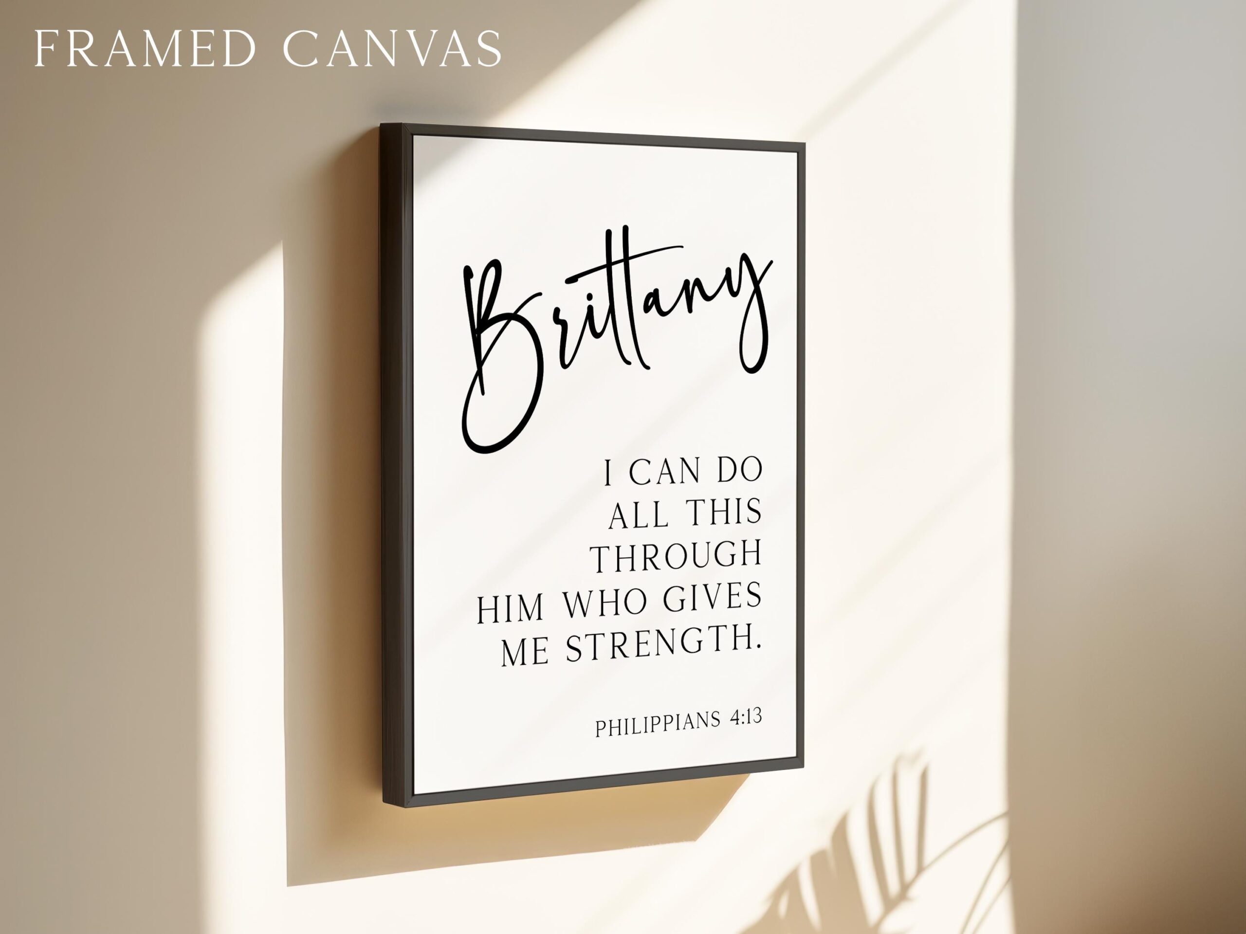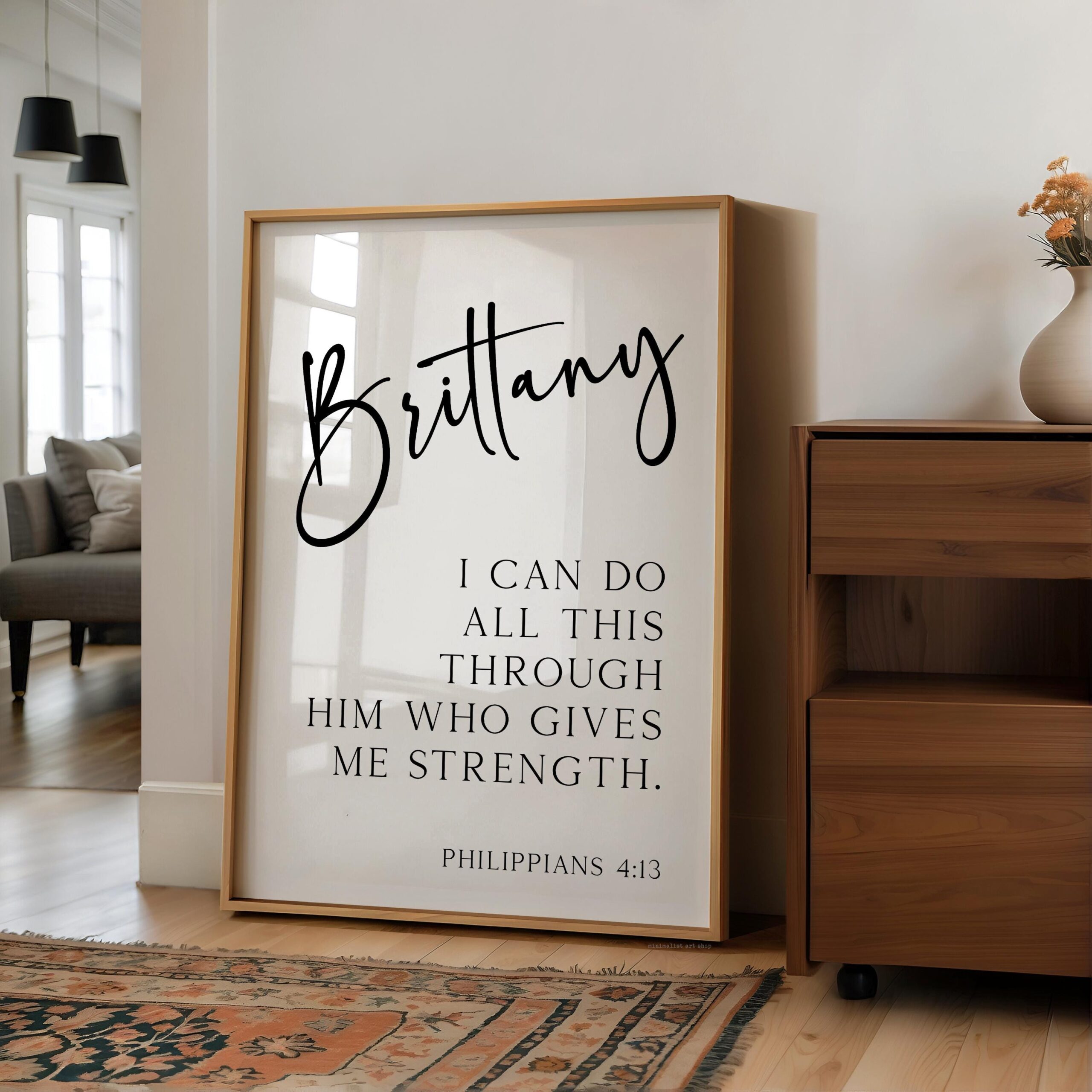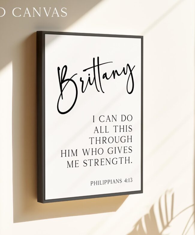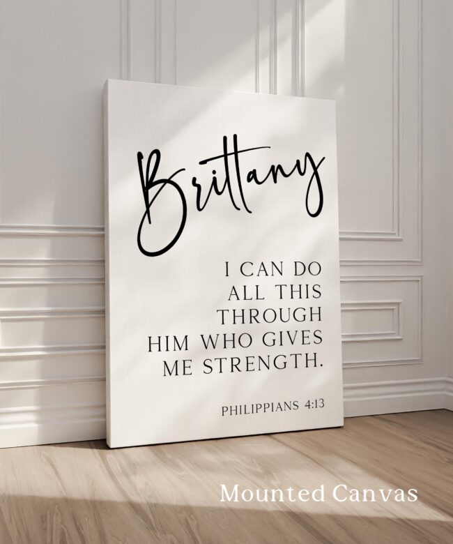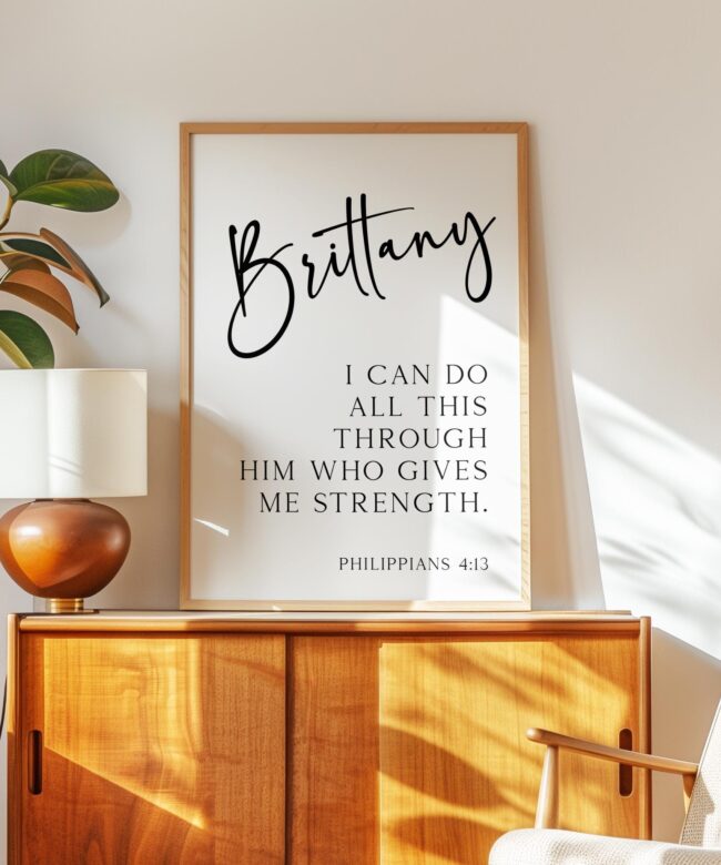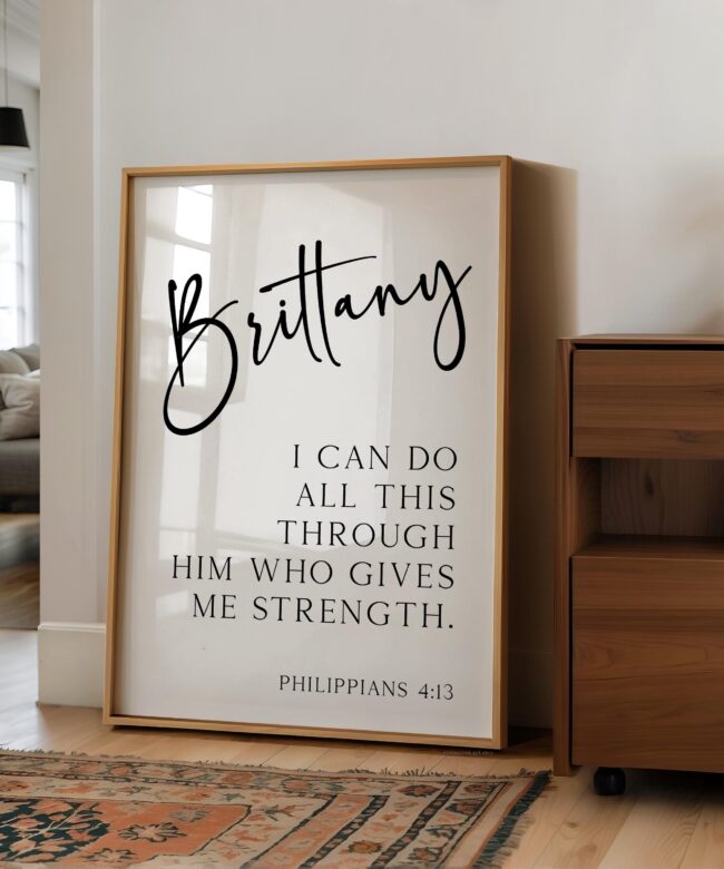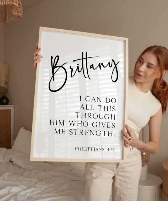 Celebrate inner strength and divine support with this elegant personalized art print featuring Philippians 4:13. With your chosen name beautifully displayed above the empowering verse, it’s a daily reminder that all things are possible through faith. Makes a thoughtful gift for graduations, confirmations, birthdays, or anyone embarking on a new journey.