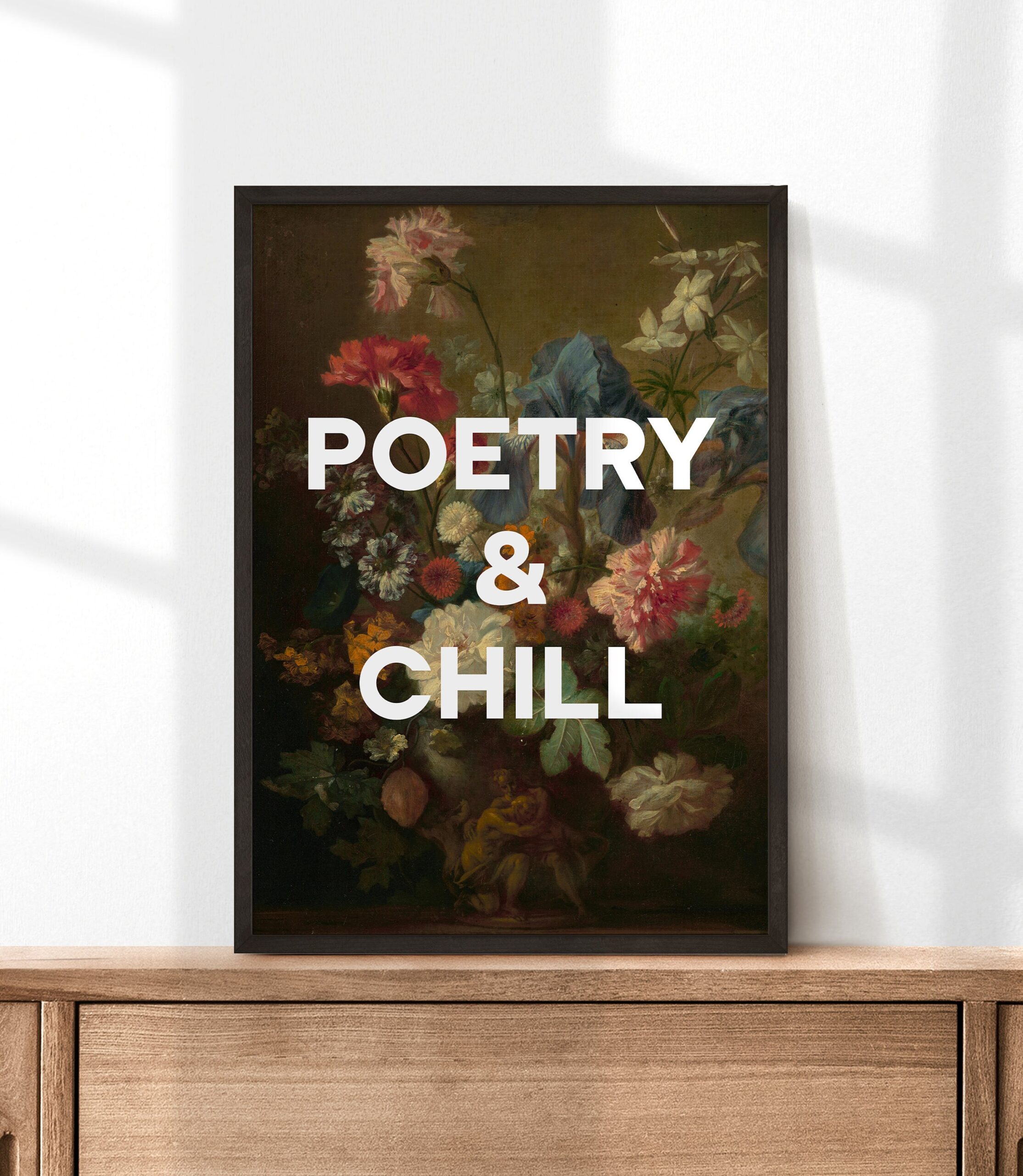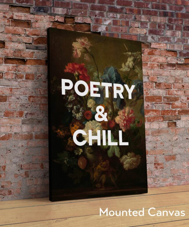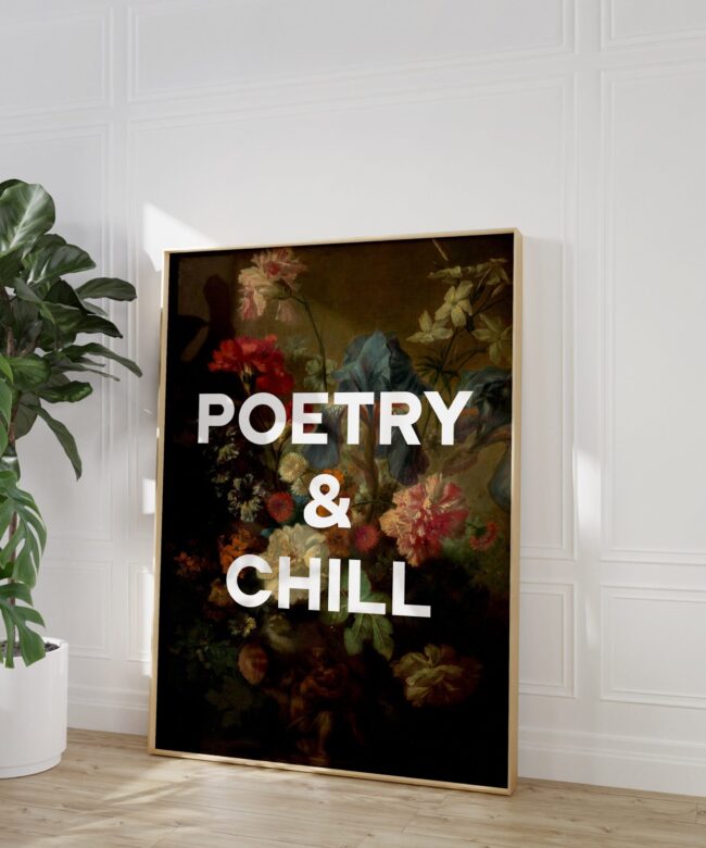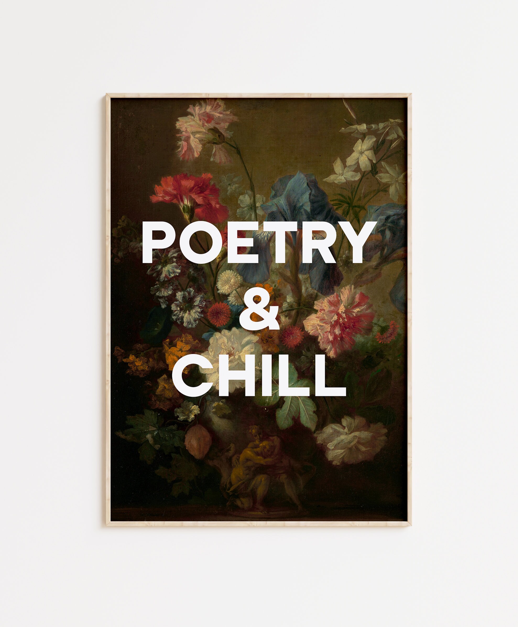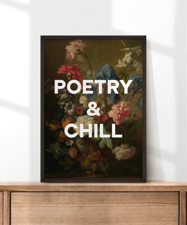 Immerse yourself in a world of tranquility and artistic beauty with this captivating typography art print. It features the calming phrase “Poetry and Chill” nestled amidst a breathtaking reproduction of a floral masterpiece by the Dutch Golden Age painter Jan van Huysum.