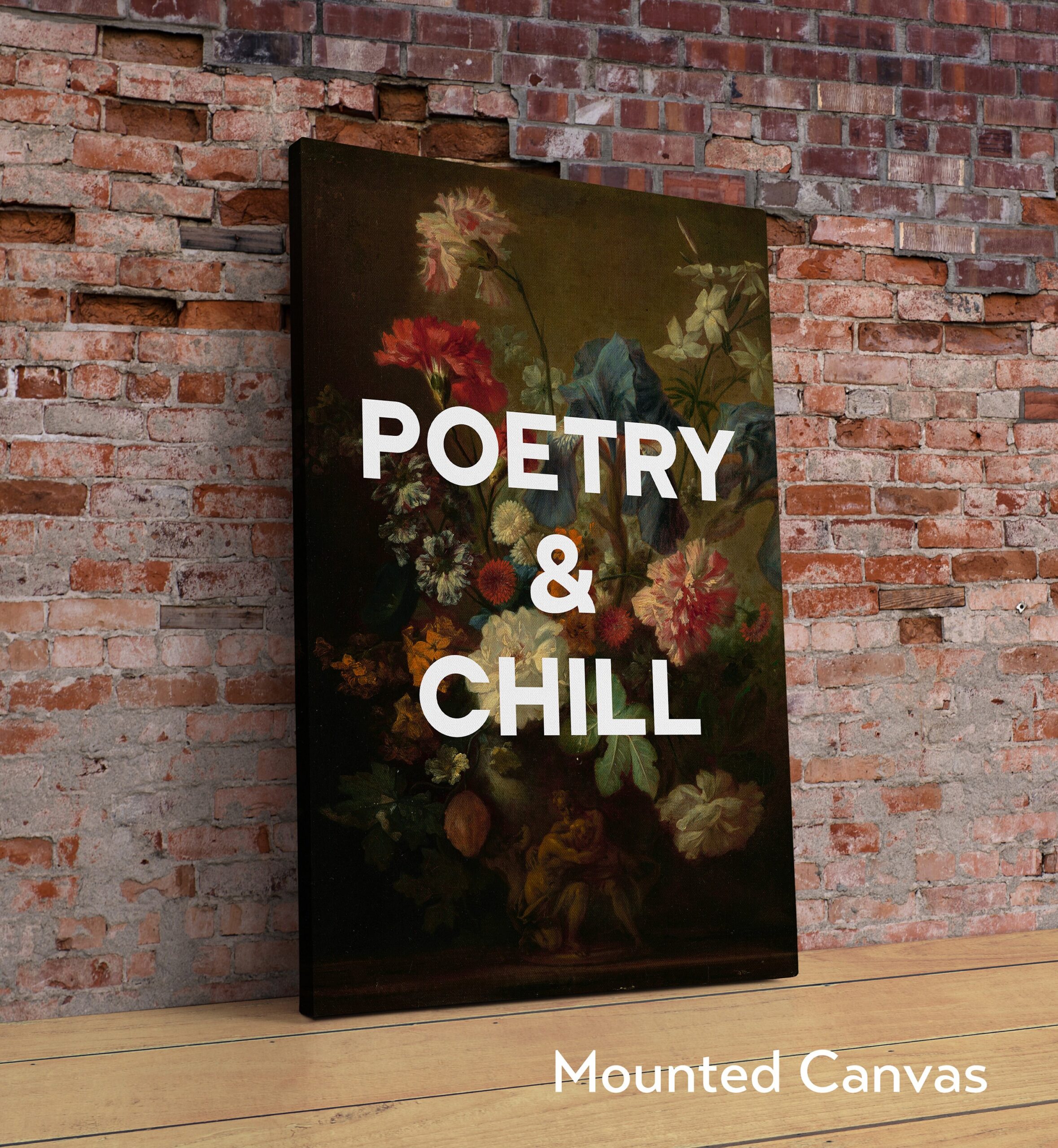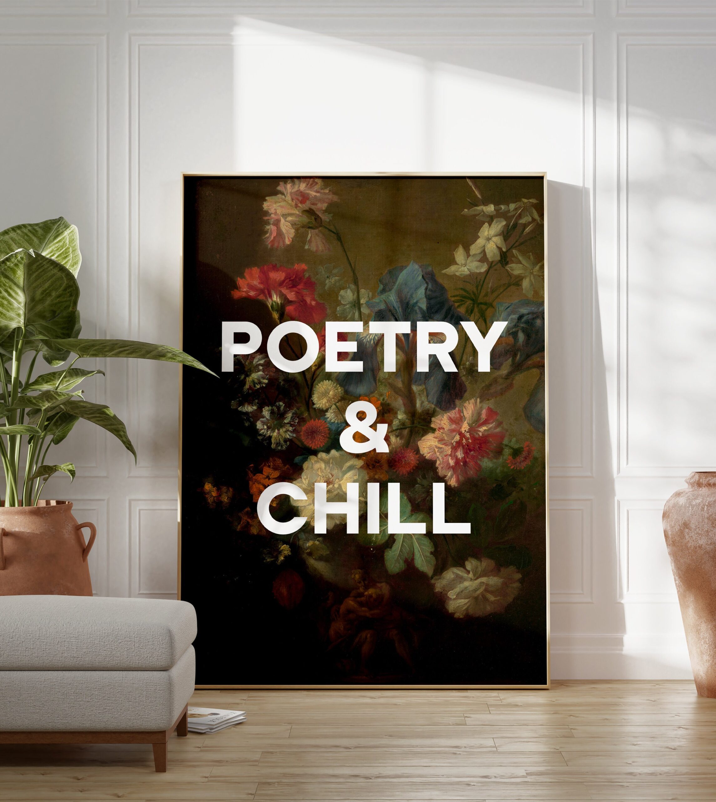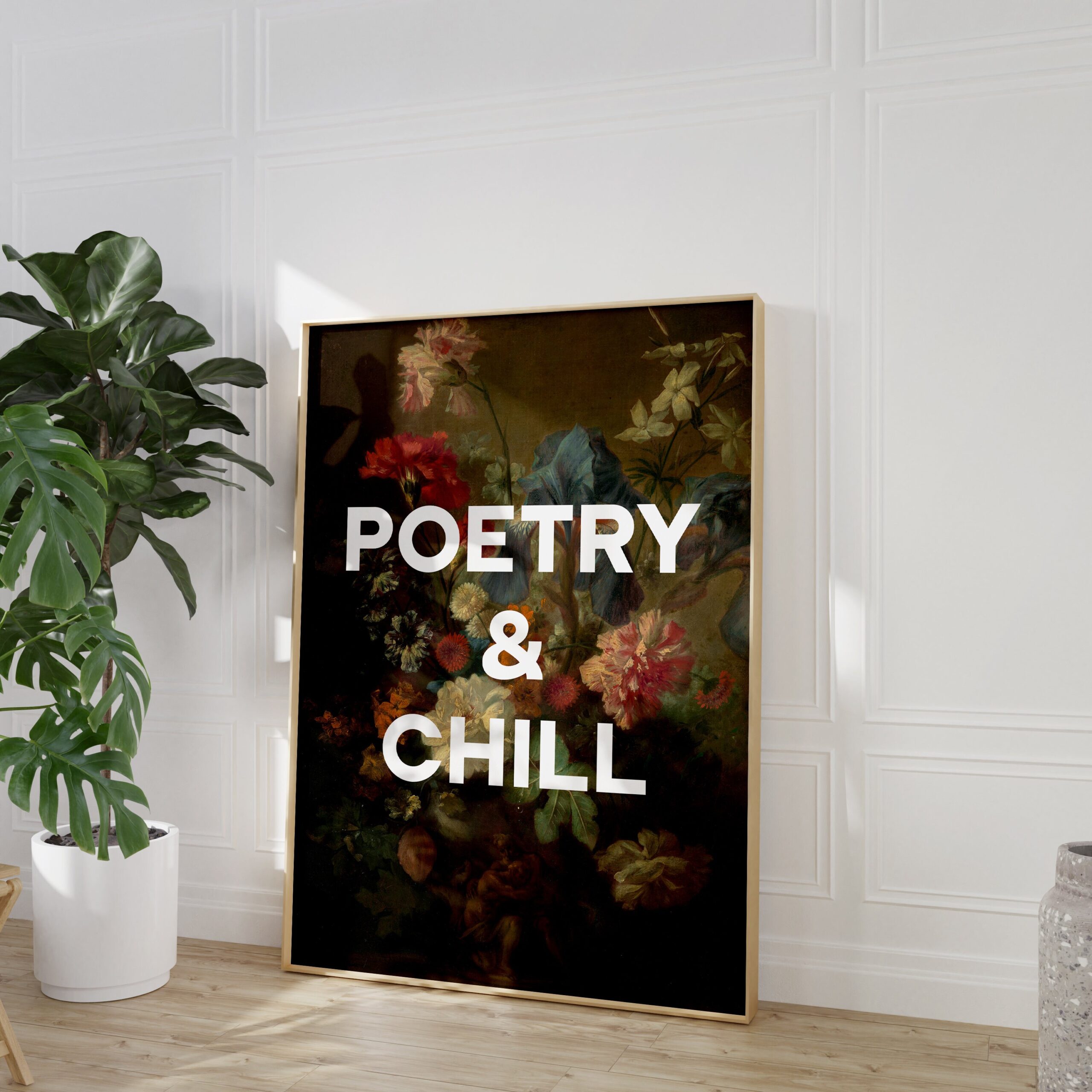 Immerse yourself in a world of tranquility and artistic beauty with this captivating typography art print. It features the calming phrase “Poetry and Chill” nestled amidst a breathtaking reproduction of a floral masterpiece by the Dutch Golden Age painter Jan van Huysum.