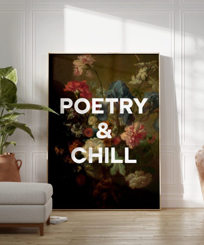 More than just words on a wall, this piece is an invitation to relaxation and creative inspiration. The elegant script of “Poetry and Chill” complements the delicate details of van Huysum’s flowers, creating a harmonious blend of language and art.