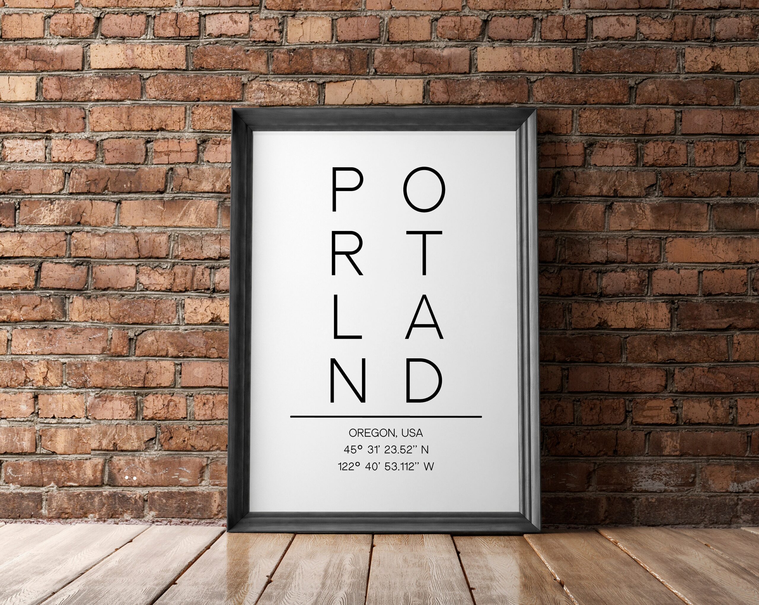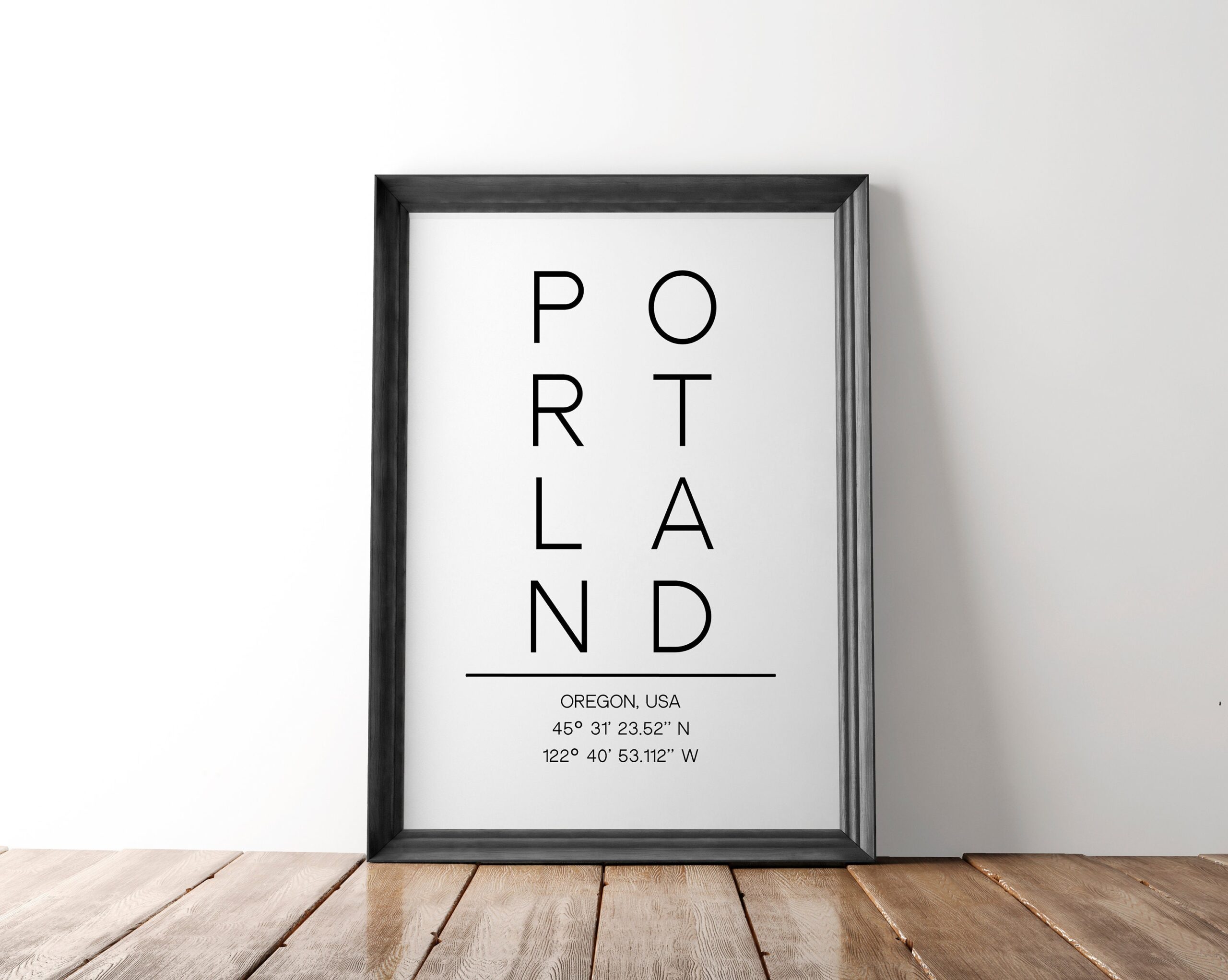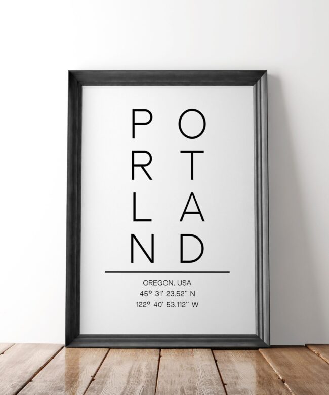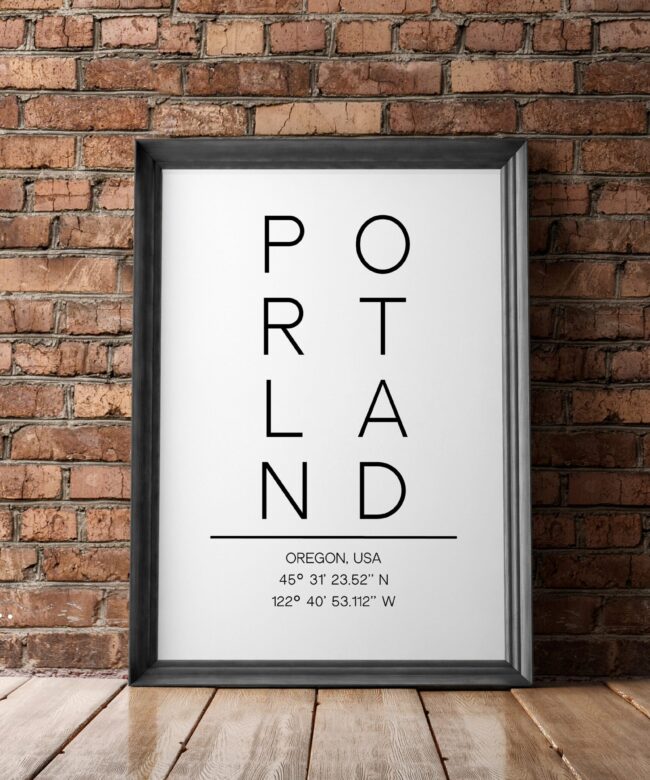 Portland Oregon Vertical Letters with GPS Coordinates Typography Art Print – Office – Home Decor – Restaurant – Apartment – Condo