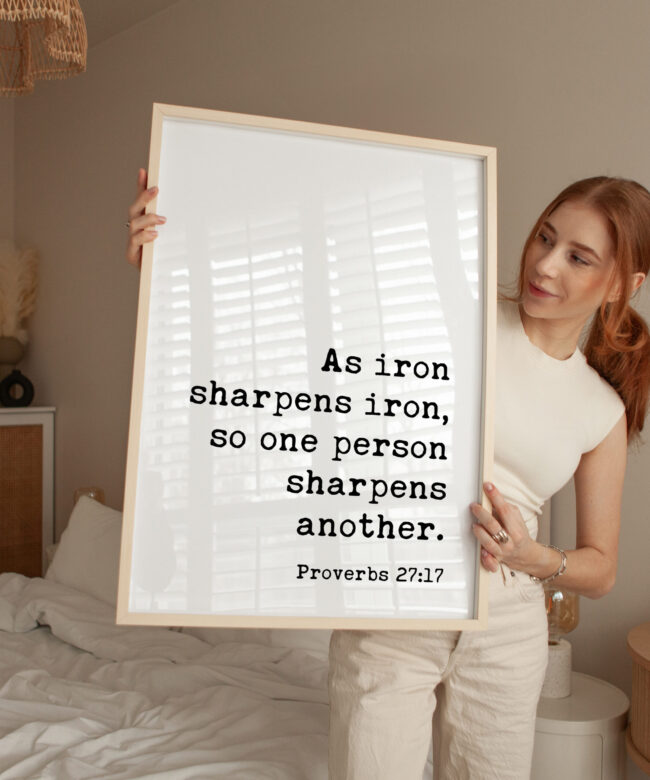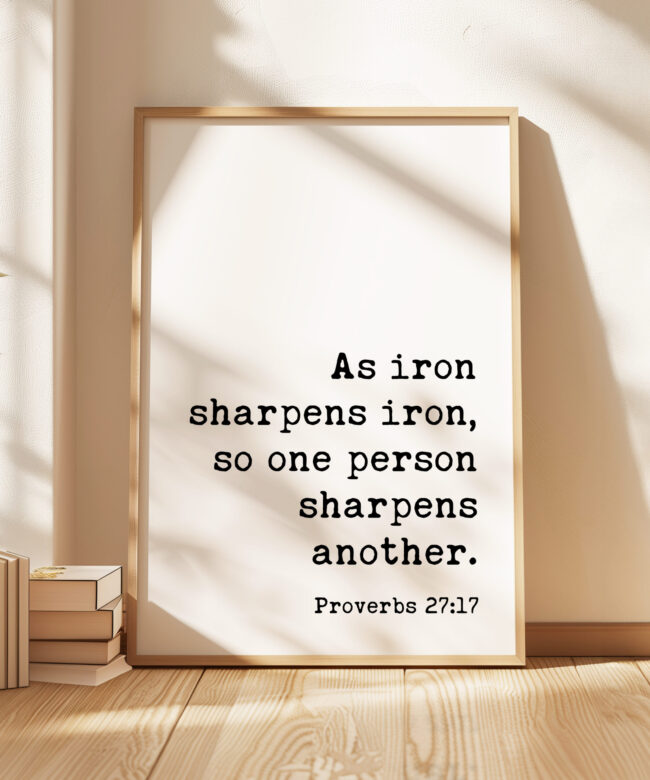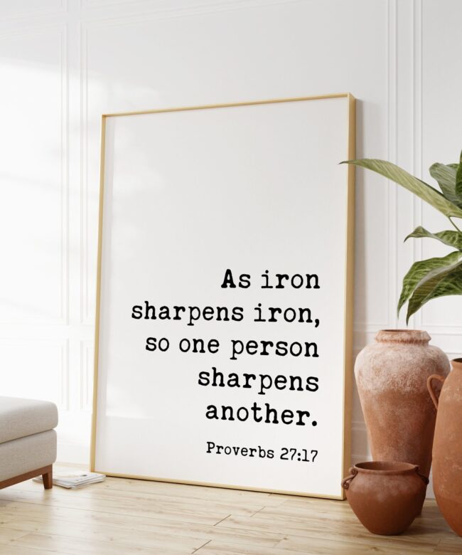 Enhance your space with our Typography Art Print featuring the powerful proverb: “As iron sharpens iron, so one person sharpens another.” This elegant piece serves as a reminder of the importance of community and personal growth through relationships. Its minimalist design complements any decor, making it a perfect addition to your living room, office, or study. Ideal for anyone seeking motivation and inspiration, this print also makes a thoughtful gift for friends and family who value meaningful connections.