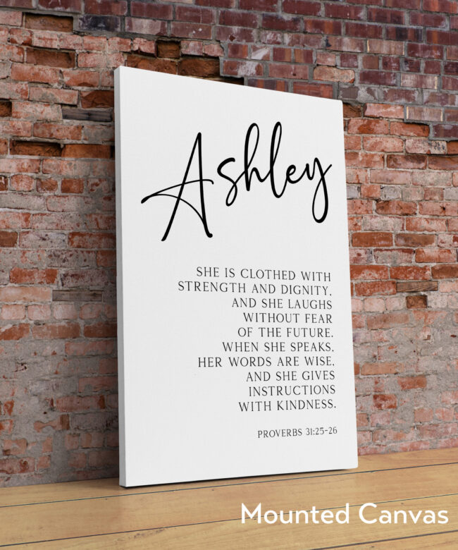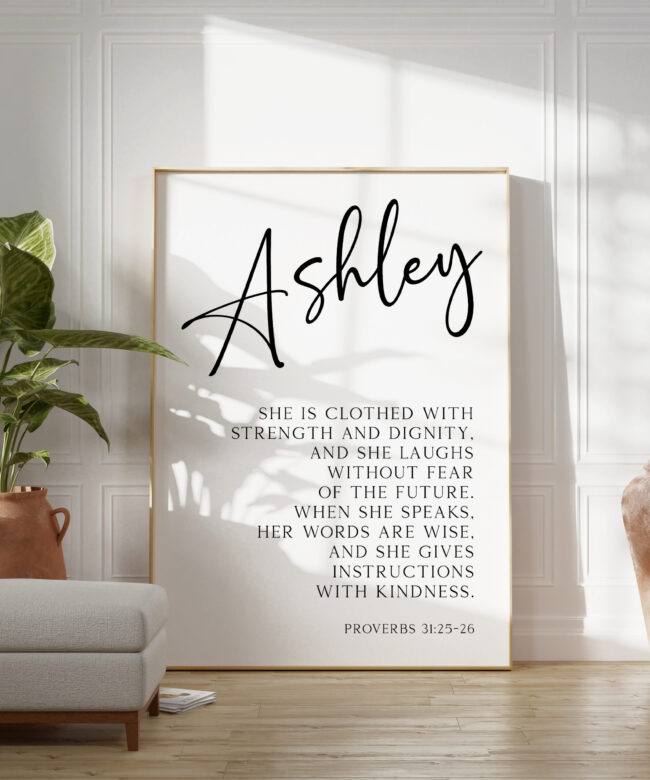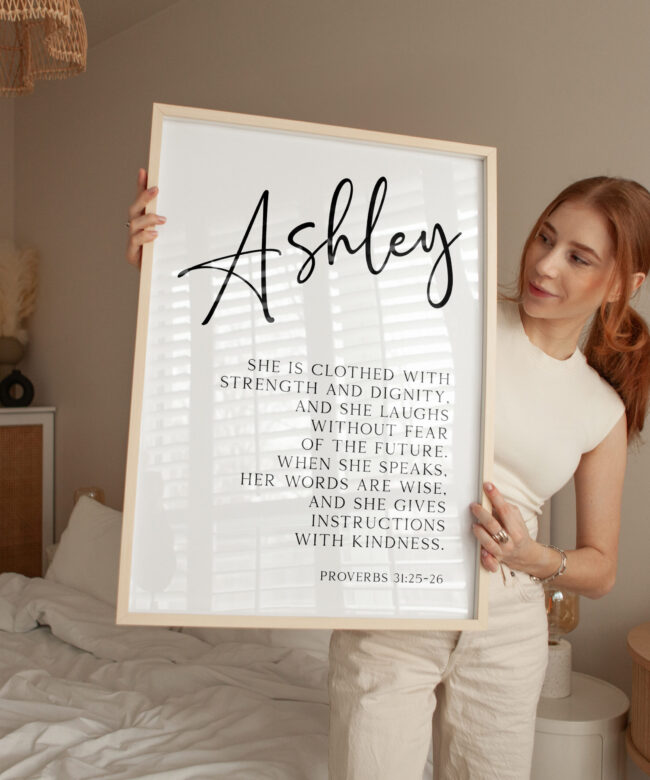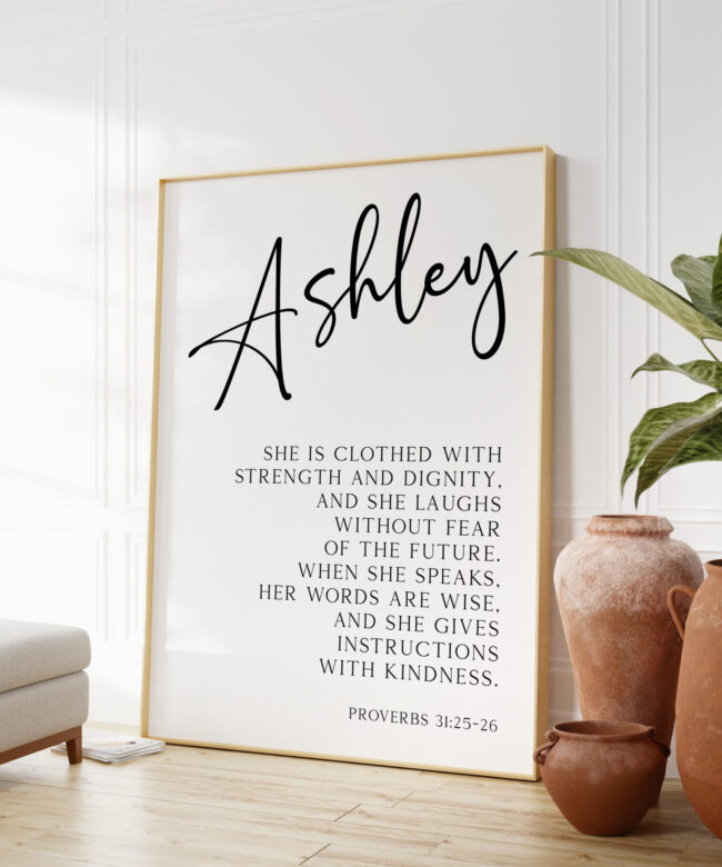 Embrace your inner strength and grace with this captivating personalized typography art print featuring the inspiring words from Proverbs 31:25-26 (NLT), adorned with your chosen name at the top.