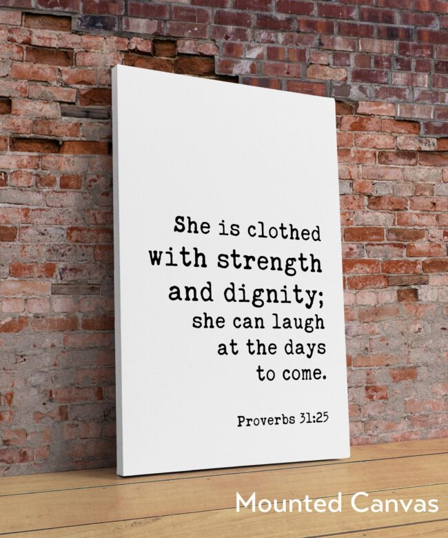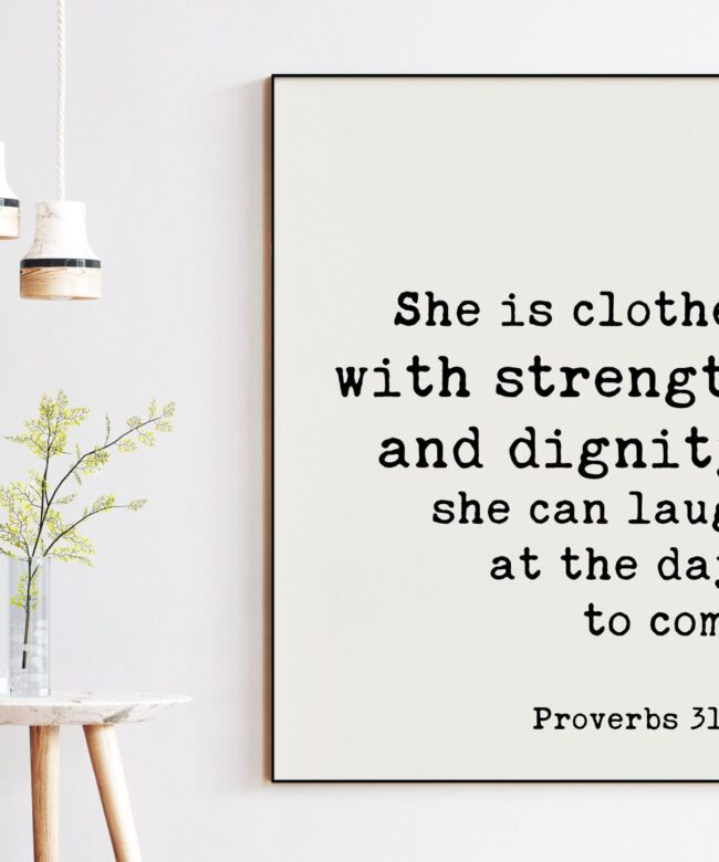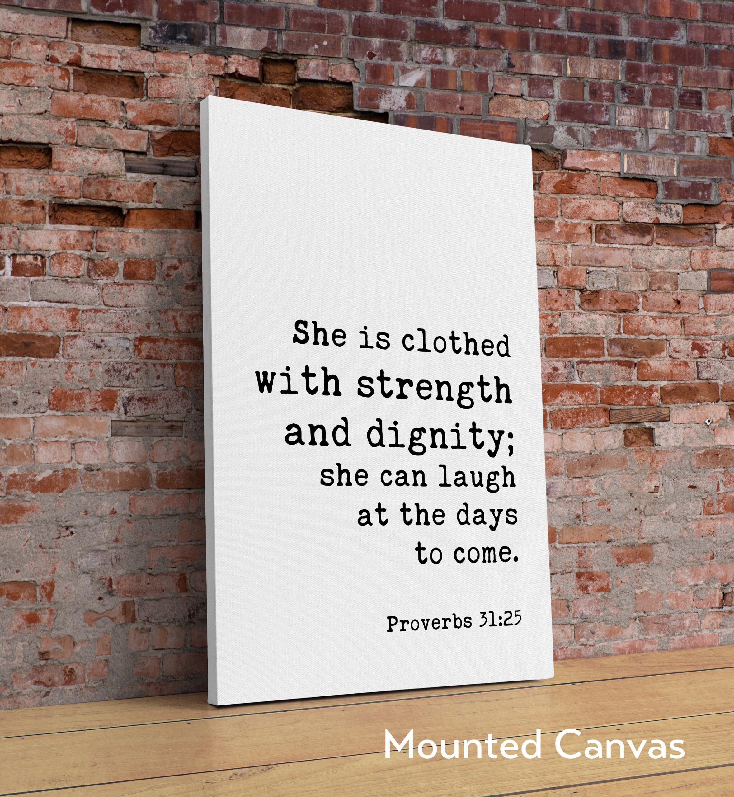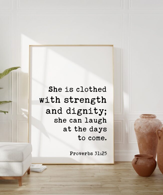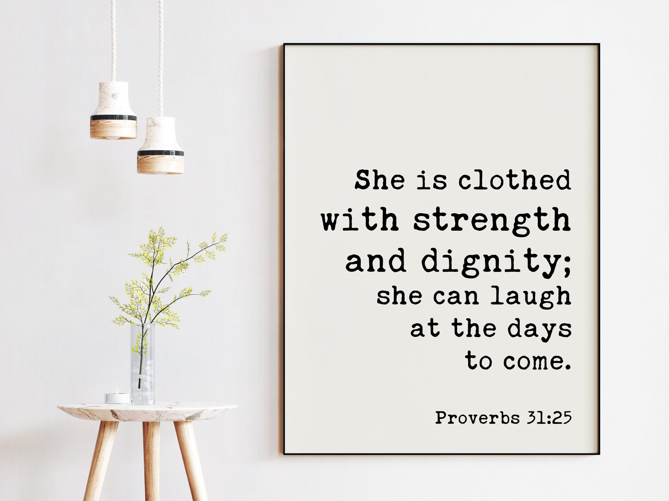 Proverbs 31:25 She is clothed with strength and dignity; she can laugh at the days to come. Art Print – Faith – Religious Scripture – Verse