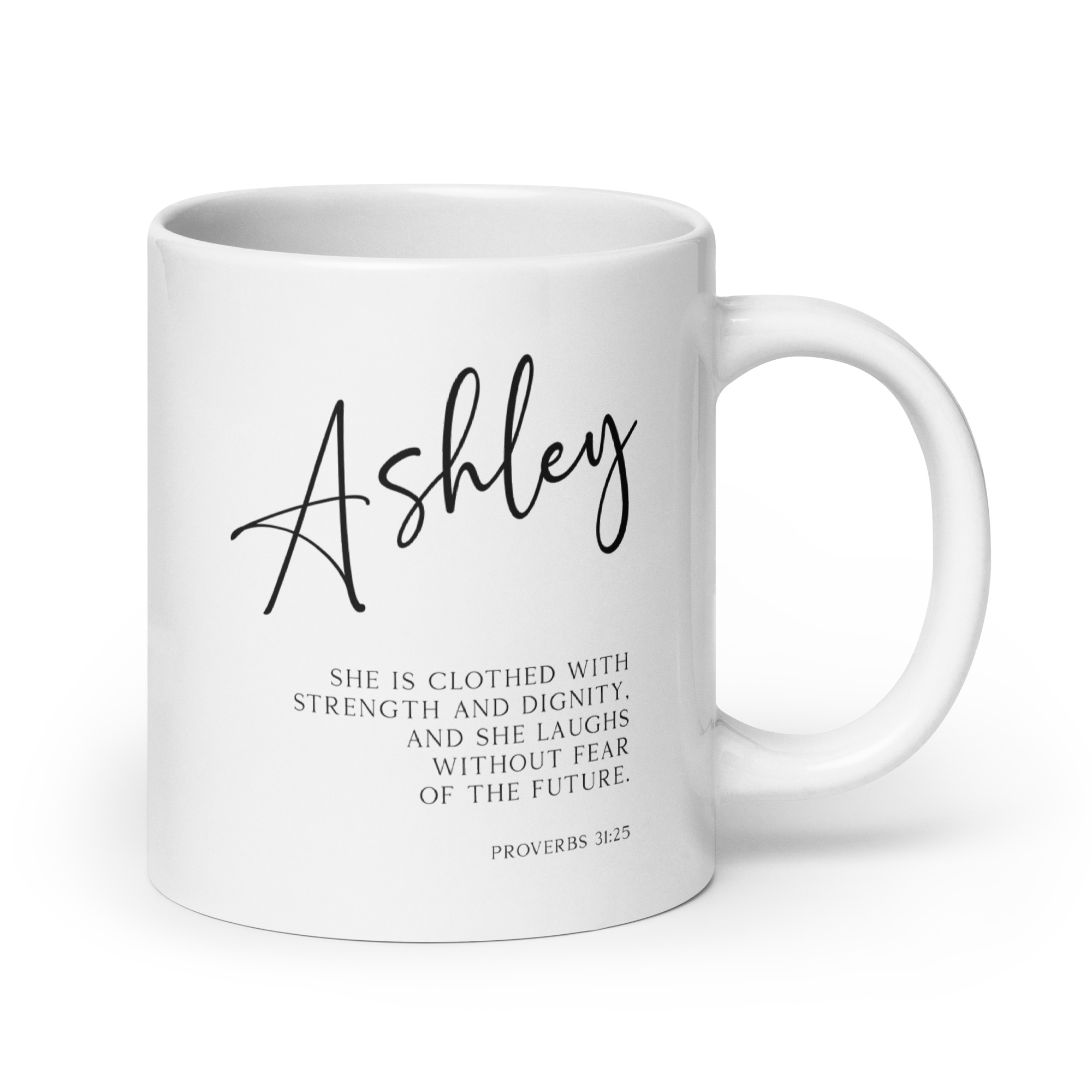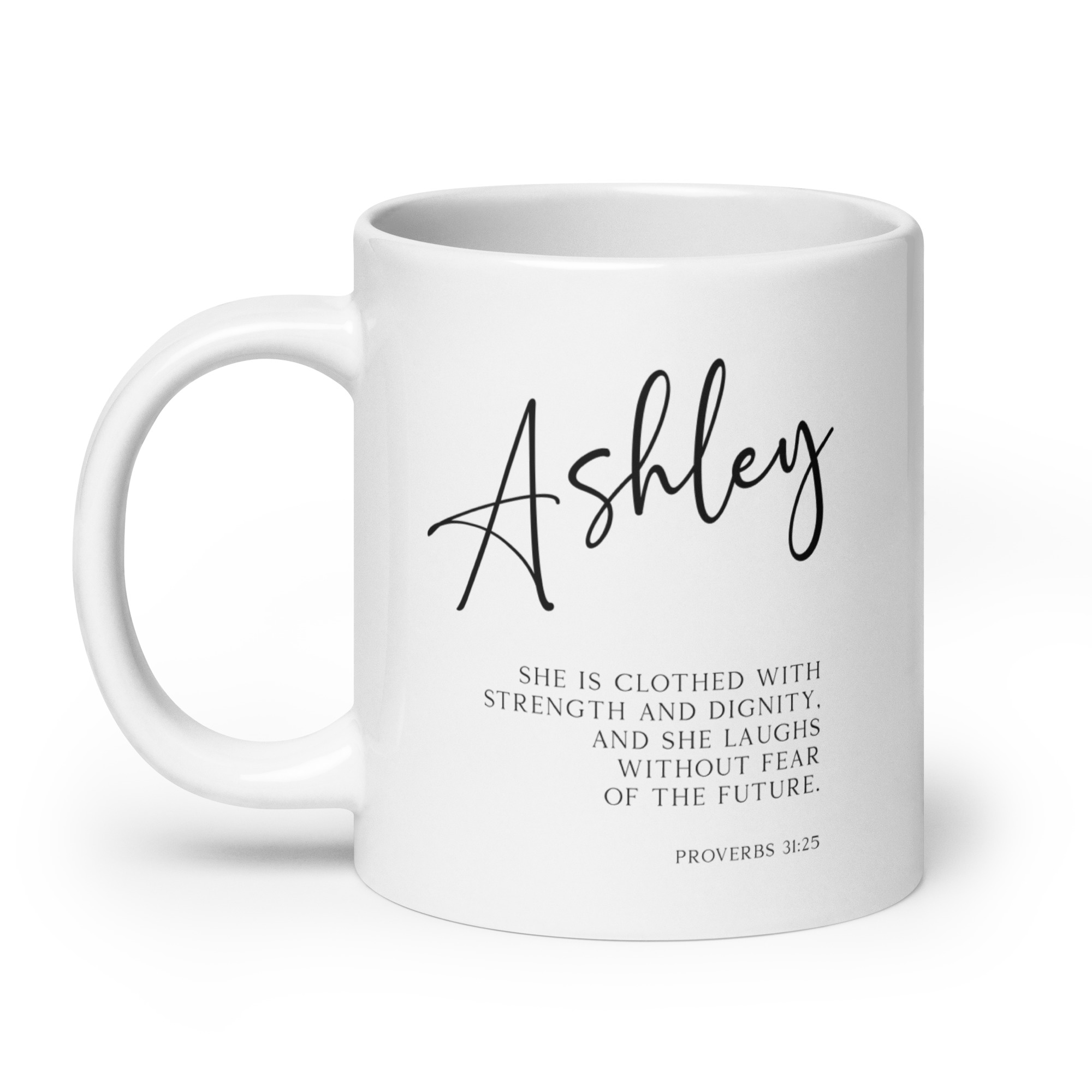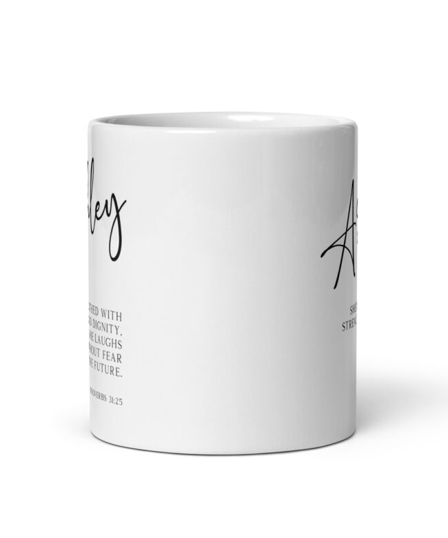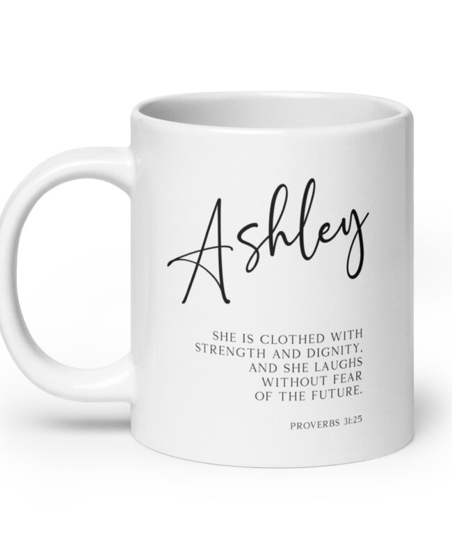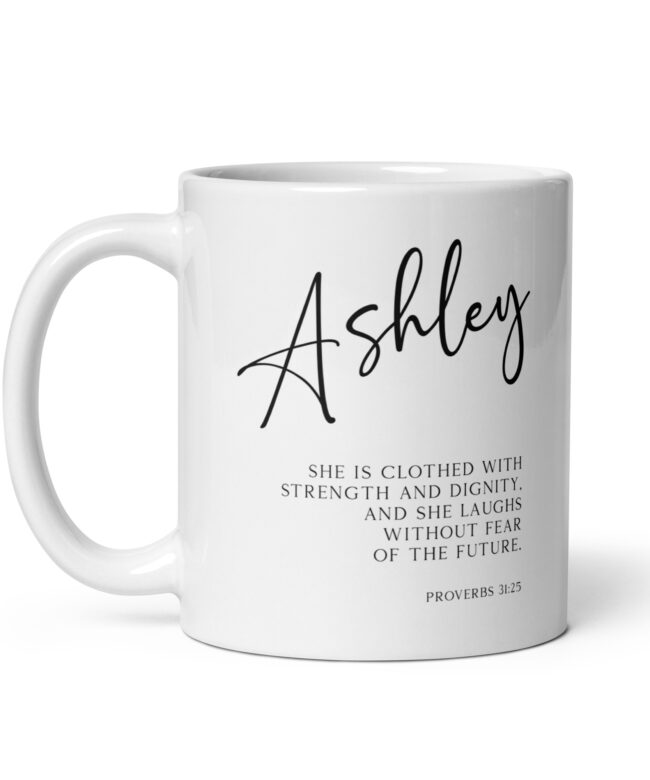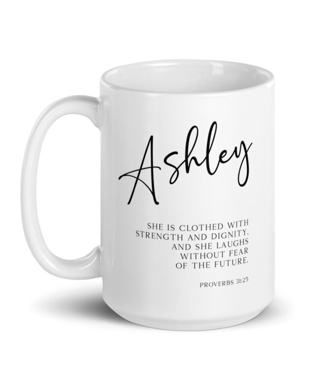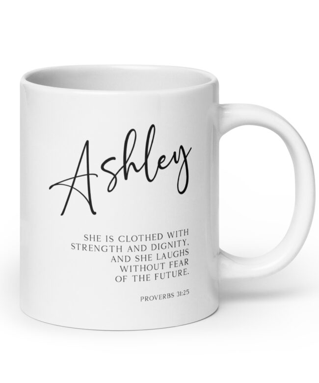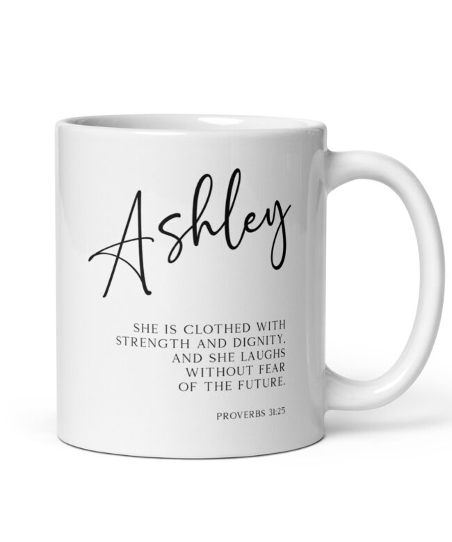 Start your day with a powerful reminder of your inner strength with this captivating personalized coffee mug featuring the inspiring words from Proverbs 31:25 (NLT).
