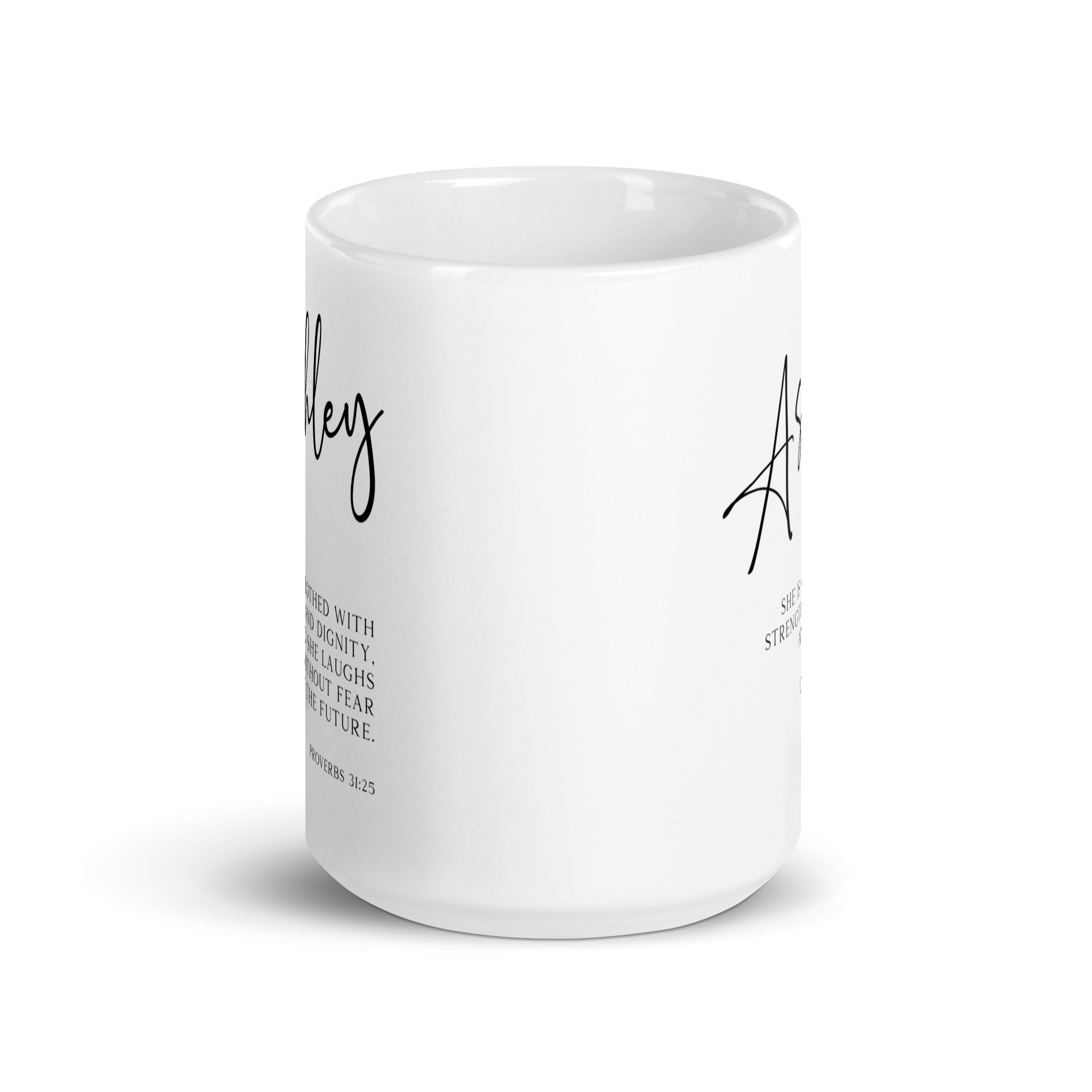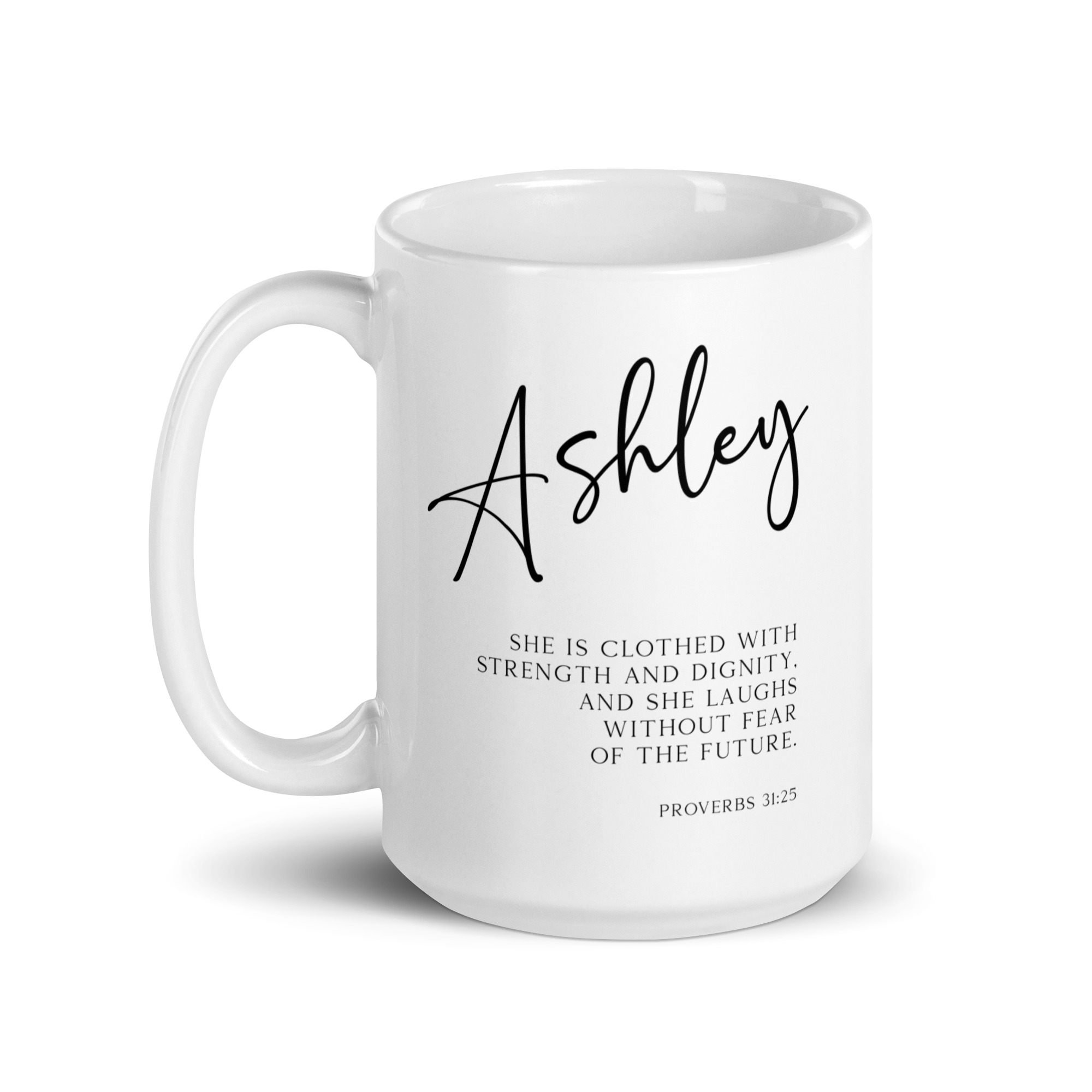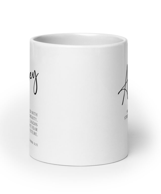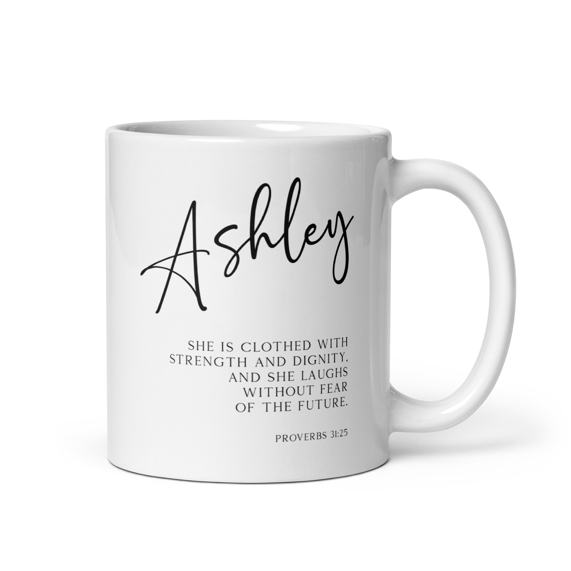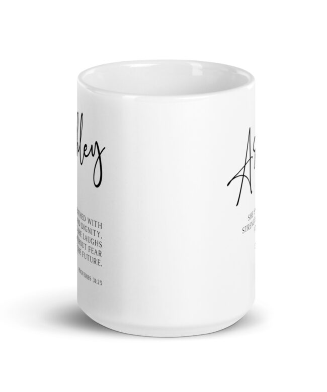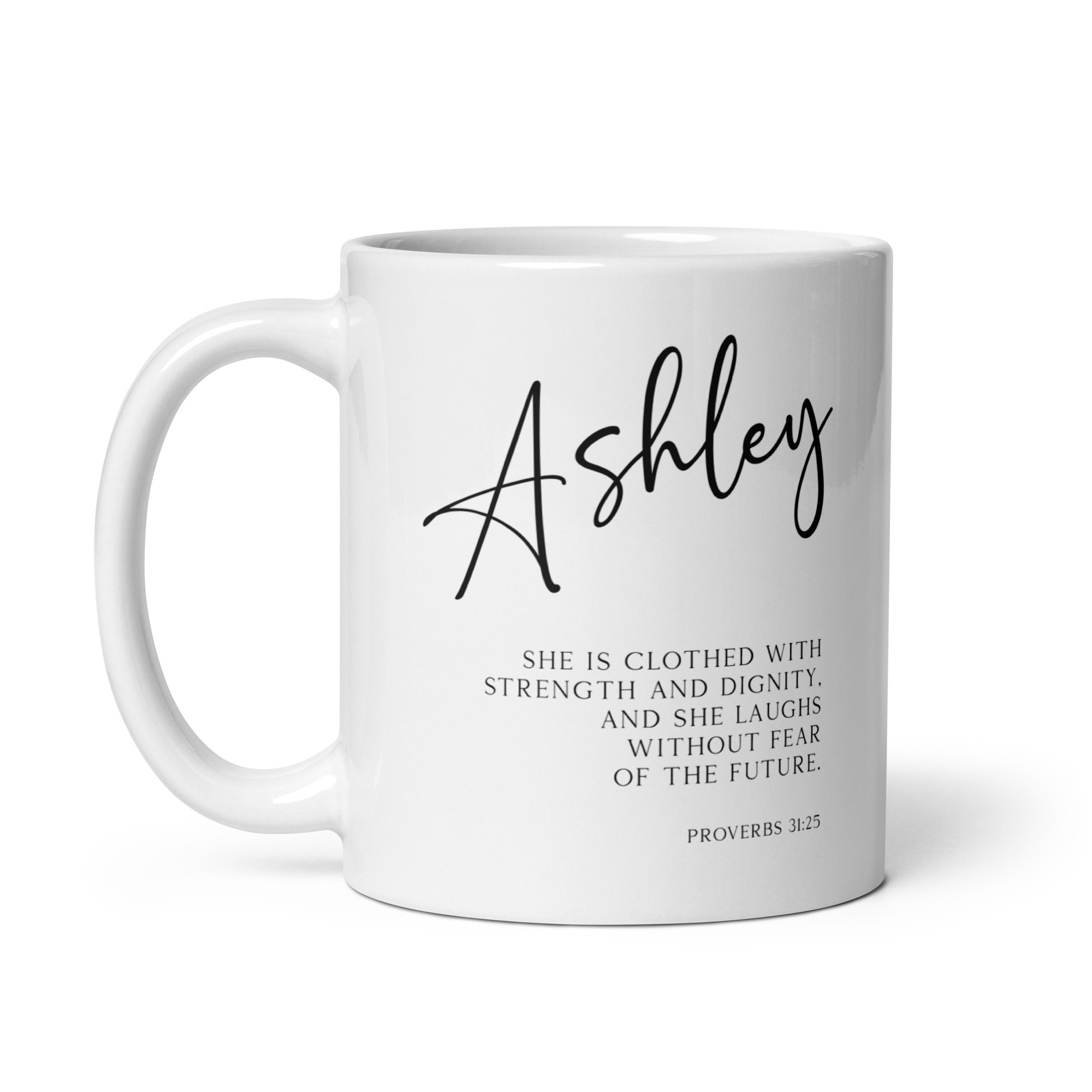Start your day with a powerful reminder of your inner strength with this captivating personalized coffee mug featuring the inspiring words from Proverbs 31:25 (NLT).